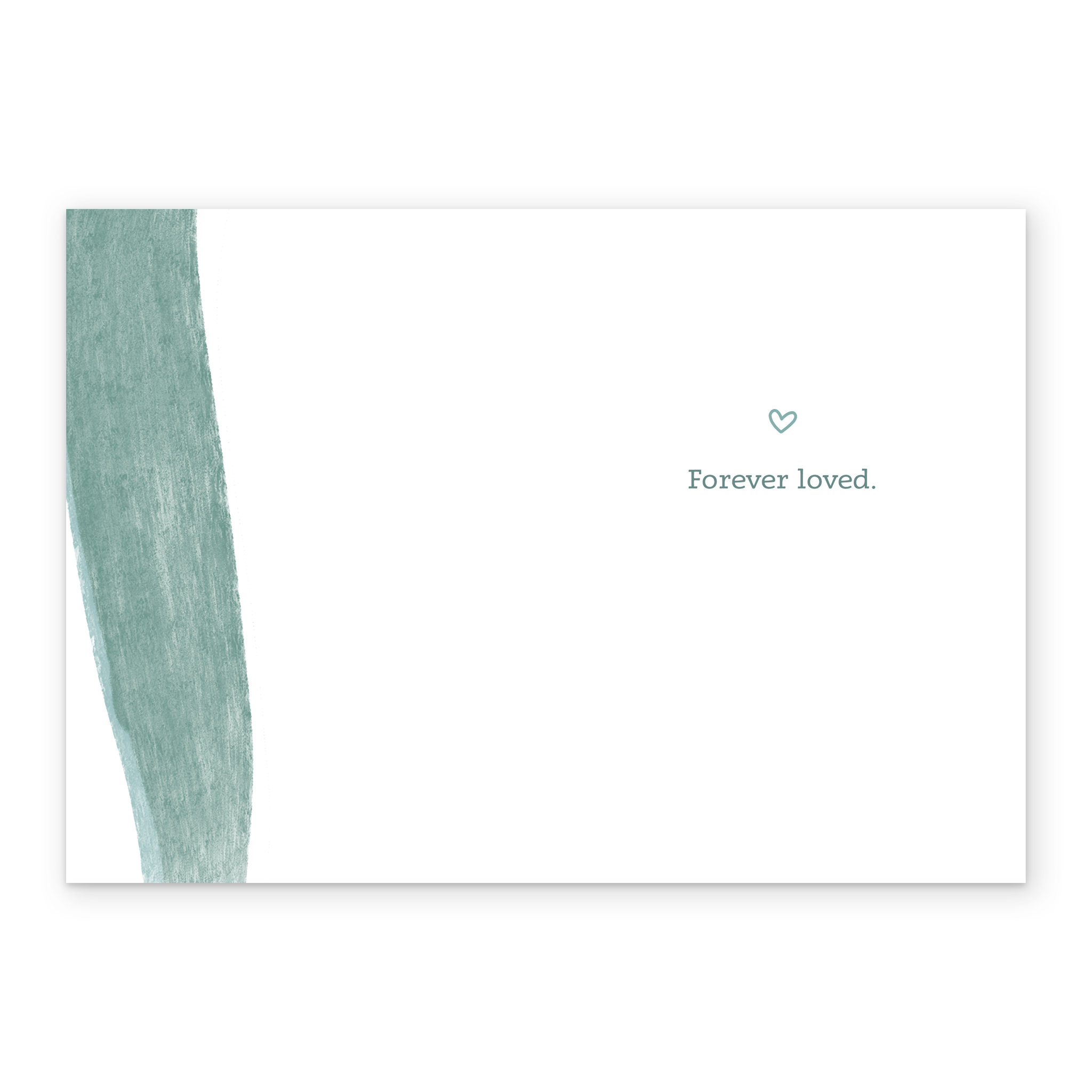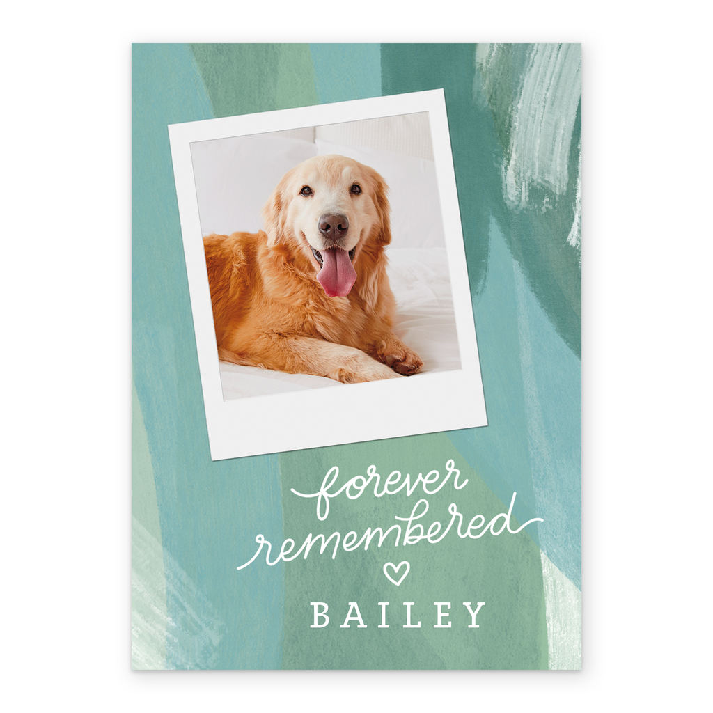 Printed on premium-quality board, this card features blue paint strokes with a polaroid style photo frame, with the message 'Forever remembered', space to upload a photo and personalise a name, and comes complete with a co-ordinating white envelope.