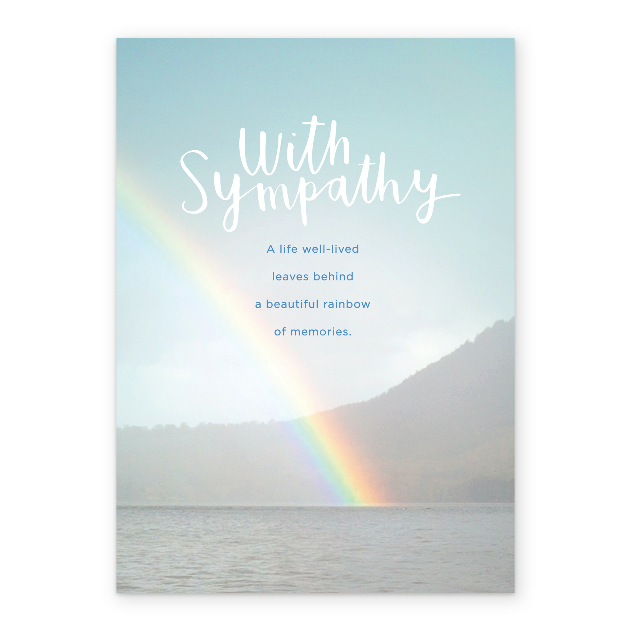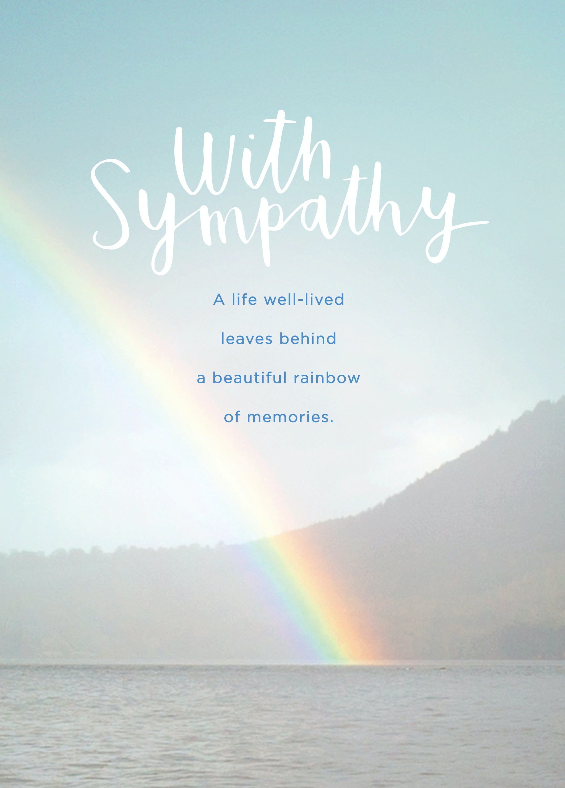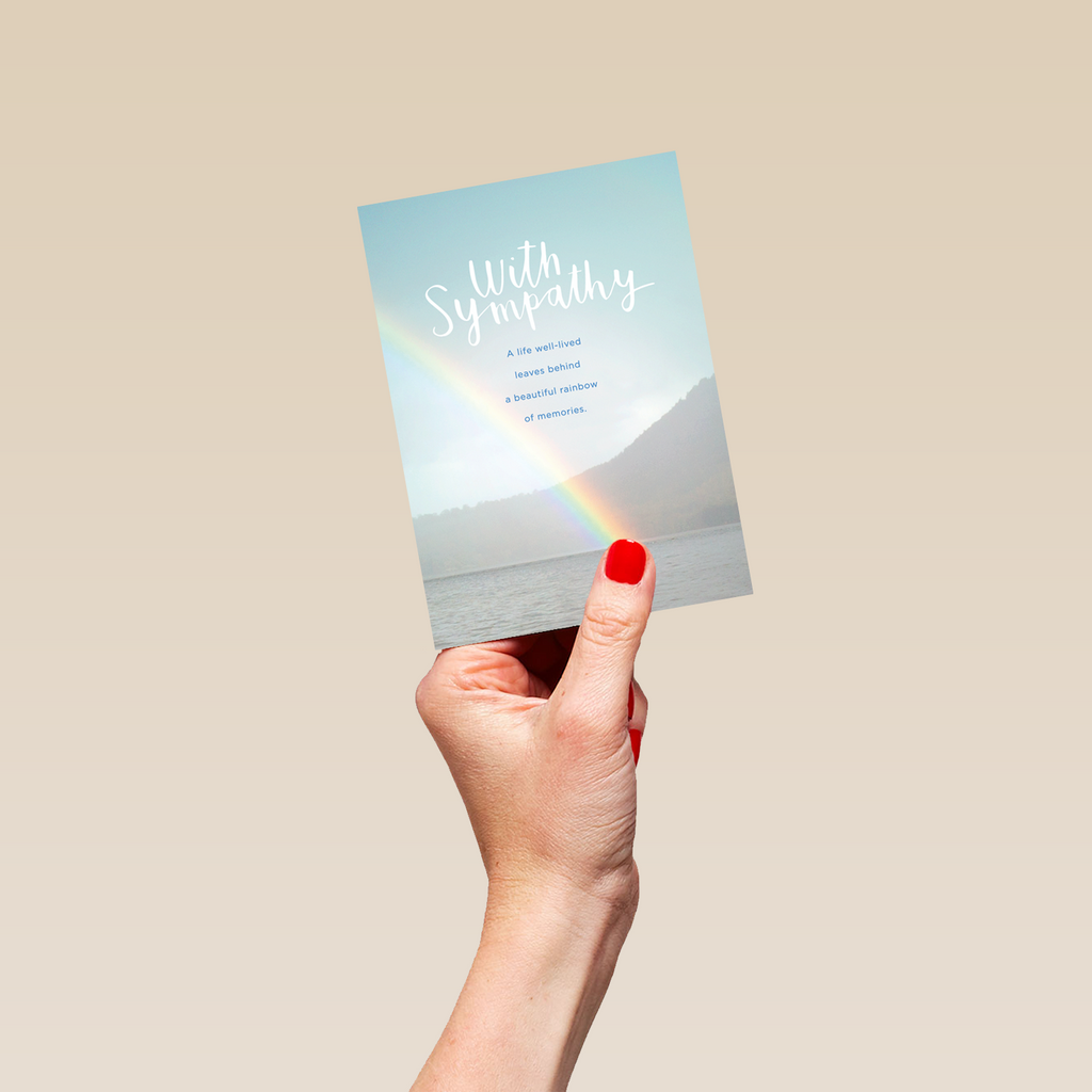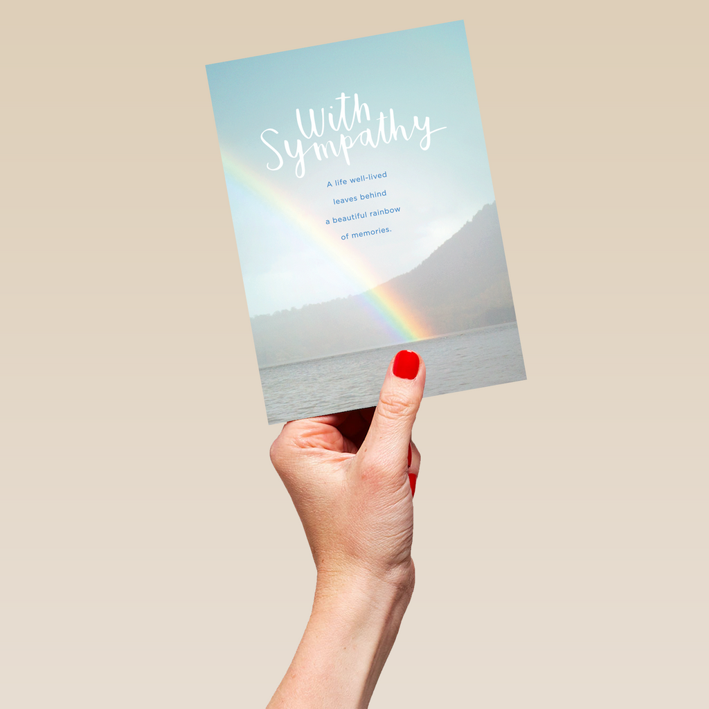 Show them you care with a personalised traditional photographic rainbow sympathy card from Hallmark. Our sympathy cards are printed on premium quality, FSC®-certified card & delivered nationwide. This card is available as standard 12cm by 16.7cm and large 15.5cm by 21.6cm.