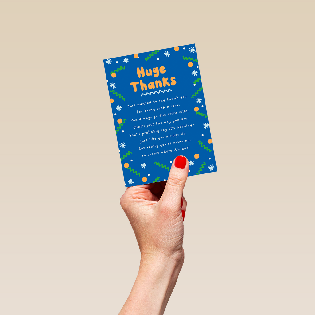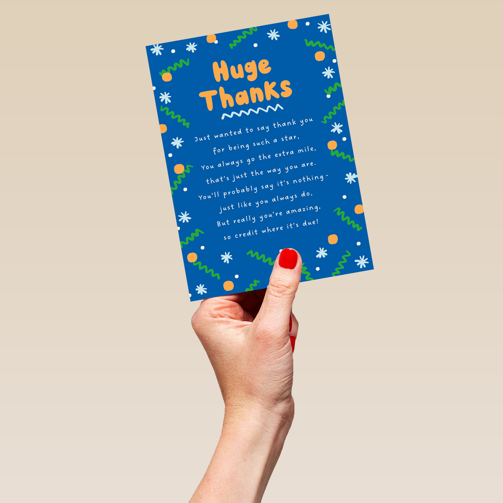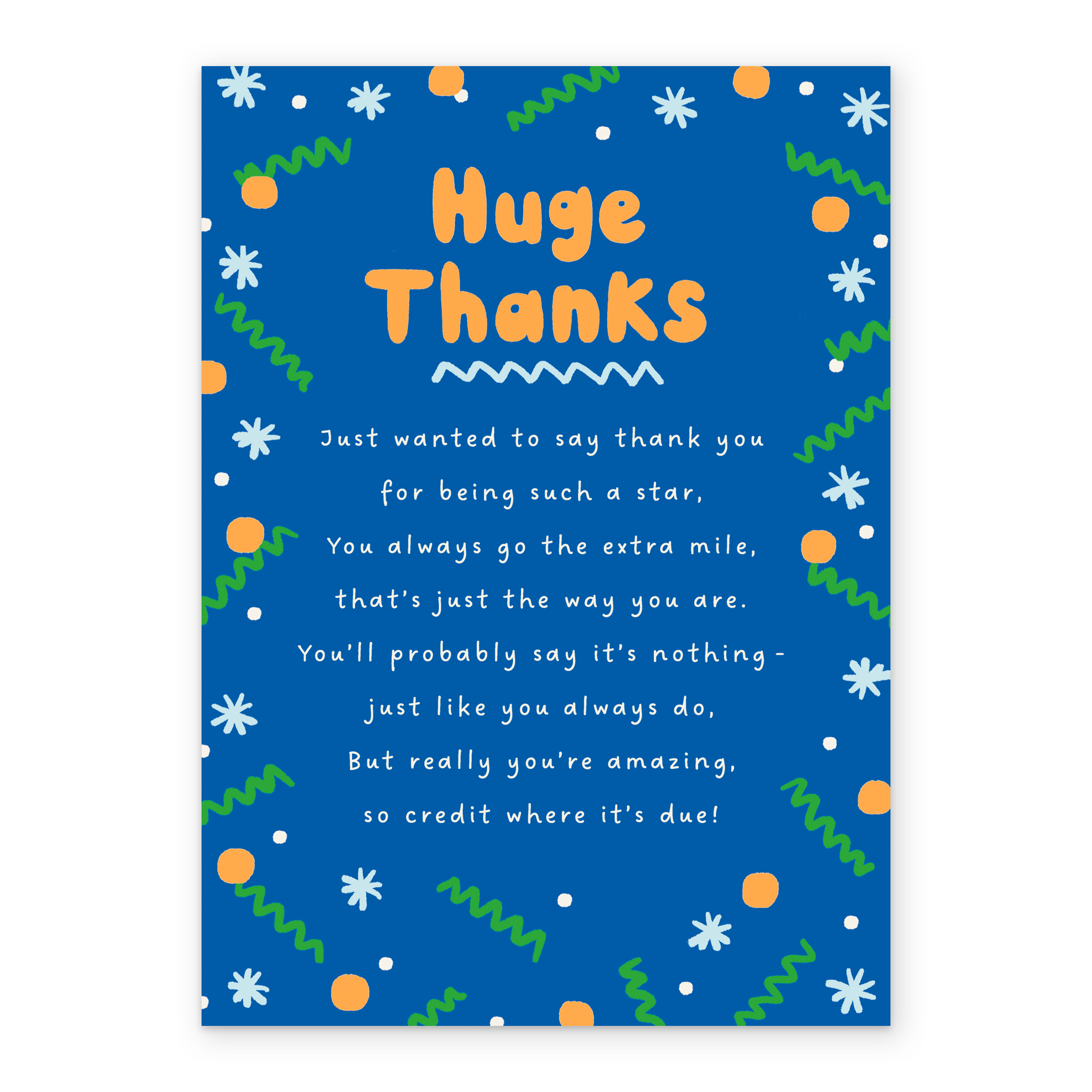 Printed on premium-quality board, this card features a blue background with squiggles and a heartfelt verse, with the message 'Huge Thanks. Just wanted to say thank you for being such a star, You always go the extra mile, that's just the way you are. You'll probably say it's nothing - just like you always do But really you're amazing, so credit where it's due!', and comes complete with a co-ordinating white envelope.