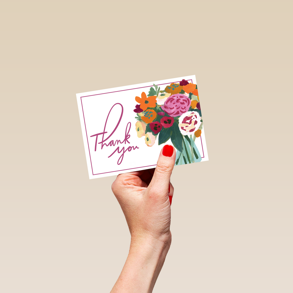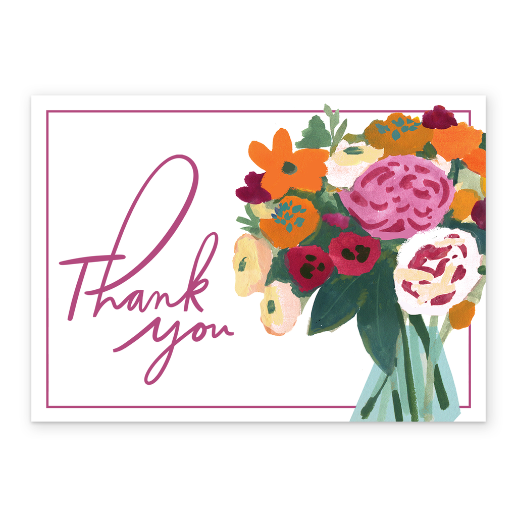Printed on premium-quality board, this card features a pink line border with a bouquet of flowers, with the message 'Thank You', and comes complete with a co-ordinating white envelope.