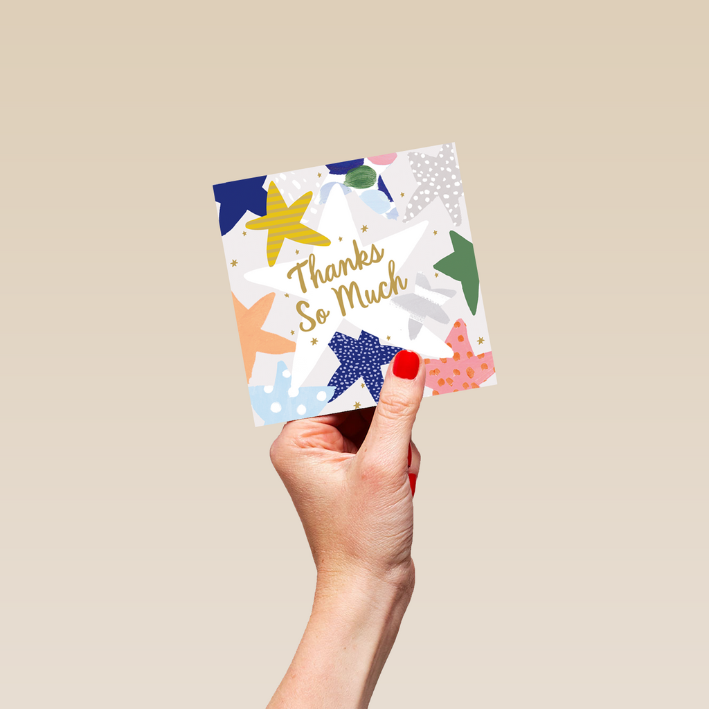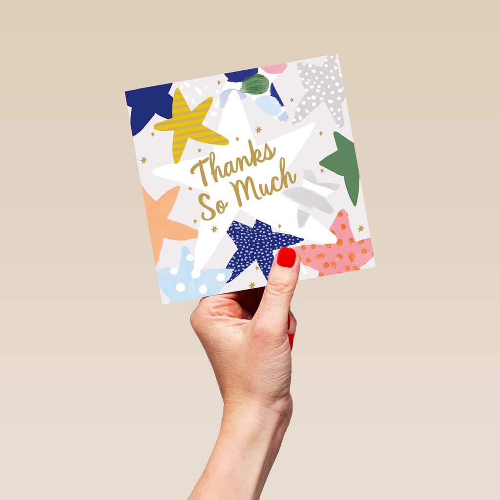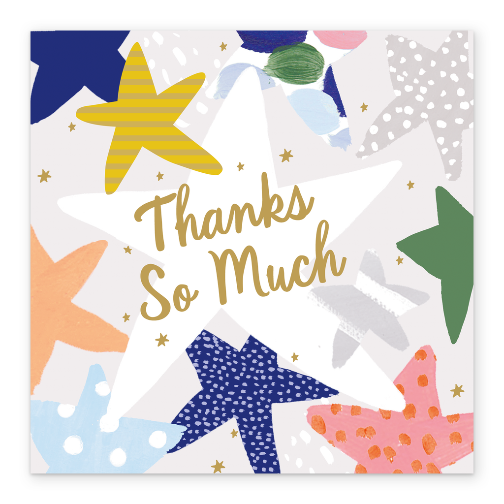 Printed on premium-quality board, this card features a range of illustrated stars with different patterns, with the message 'Thanks so much', and comes complete with a co-ordinating white envelope.