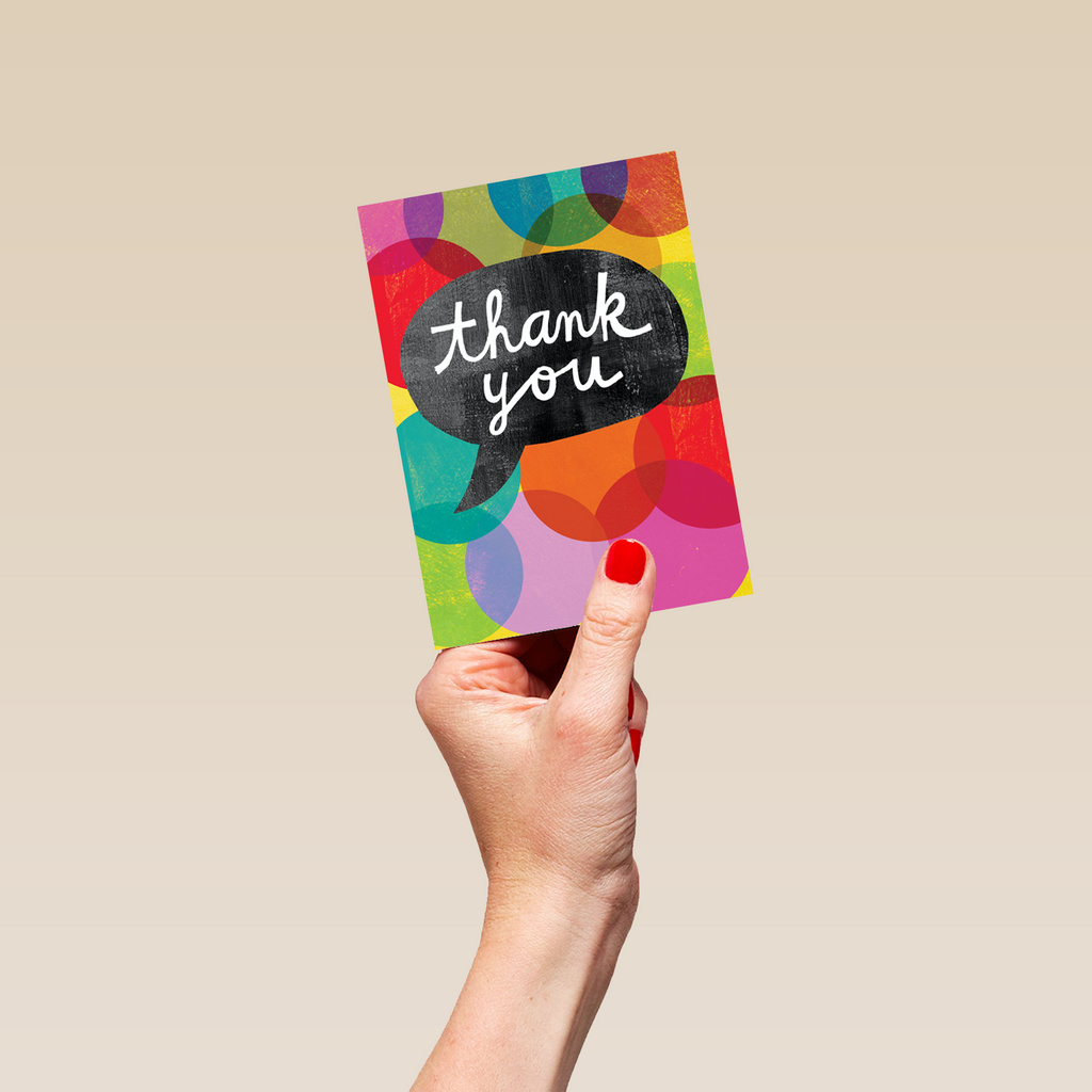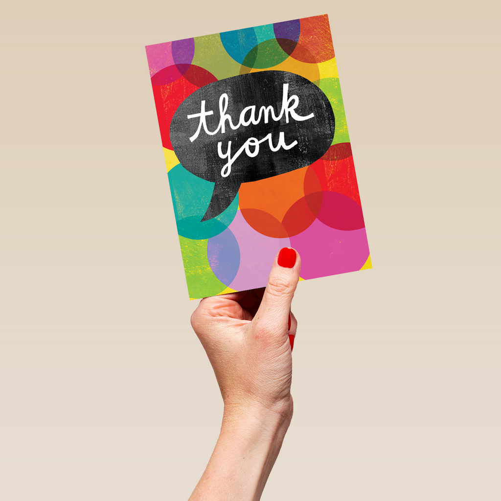 Show them you care with a personalised speech bubble kaleidoscope thank you card from Hallmark. Our thank you cards are printed on premium quality, FSC®-certified card & delivered nationwide. This card is available as standard 12cm by 16.7cm and large 15.5cm by 21.6cm.