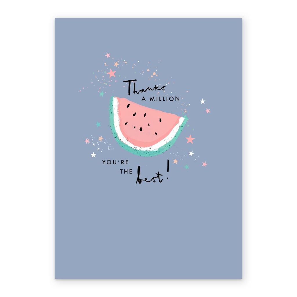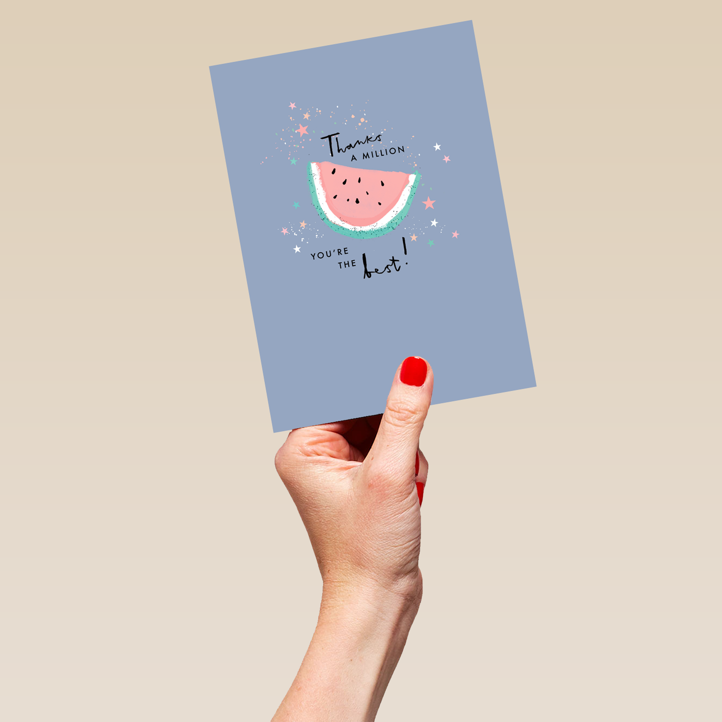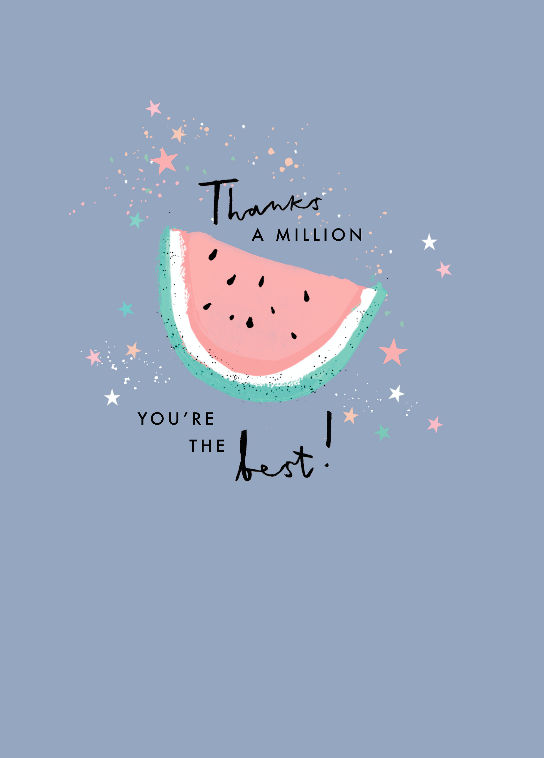 Show them you care with a personalised thank you a million watermelon card from Hallmark. Our thank you cards are printed on premium quality, FSC®-certified card & delivered nationwide. This card is available as standard 12cm by 16.7cm and large 15.5cm by 21.6cm.