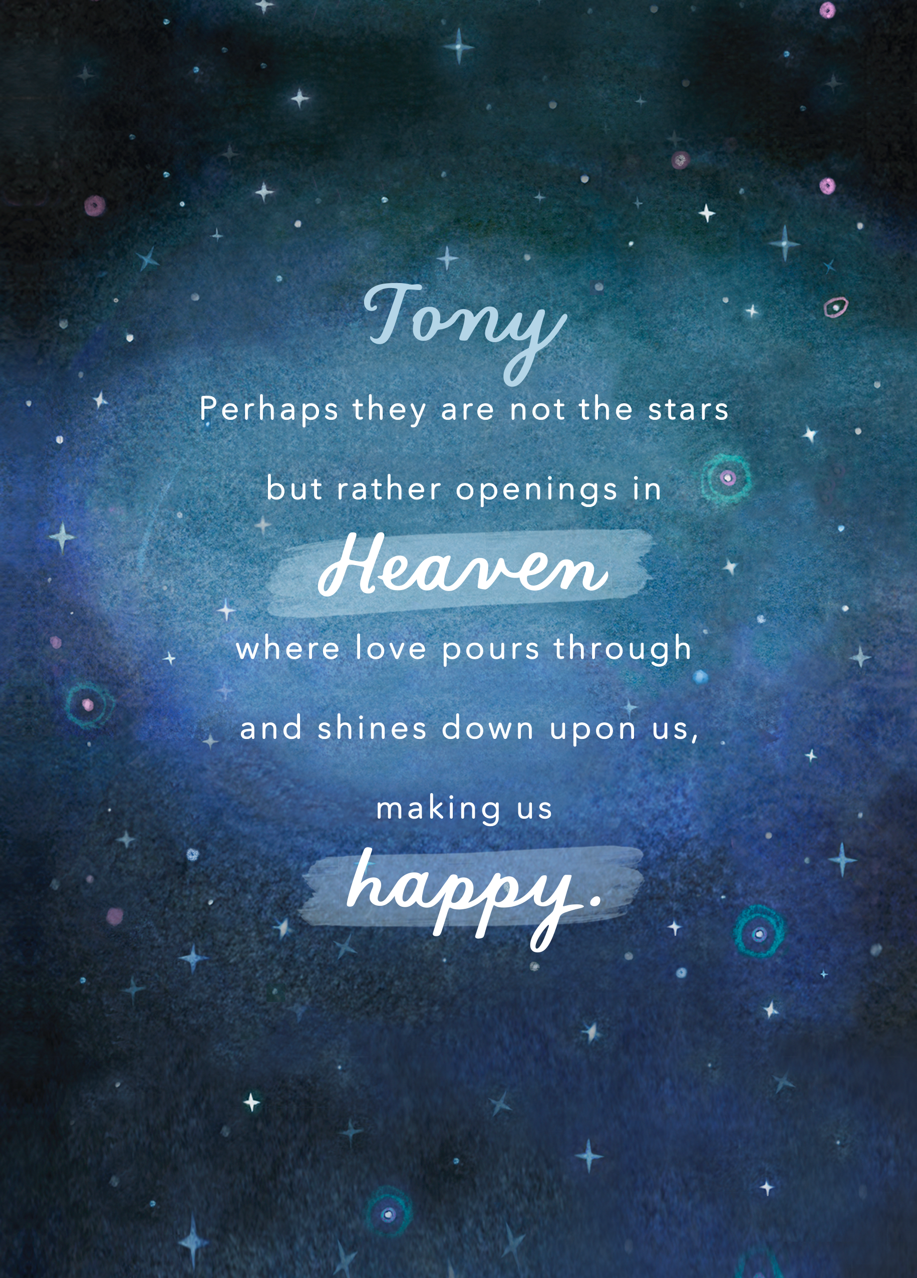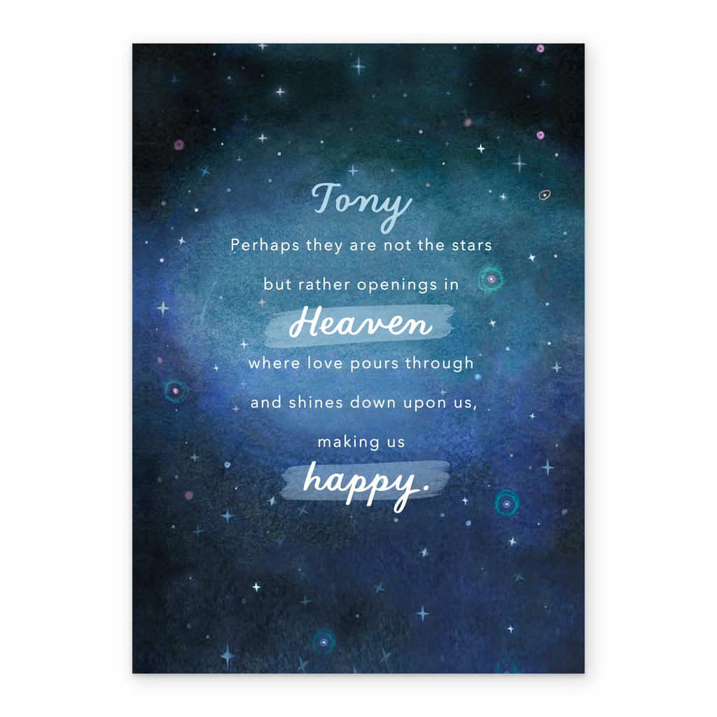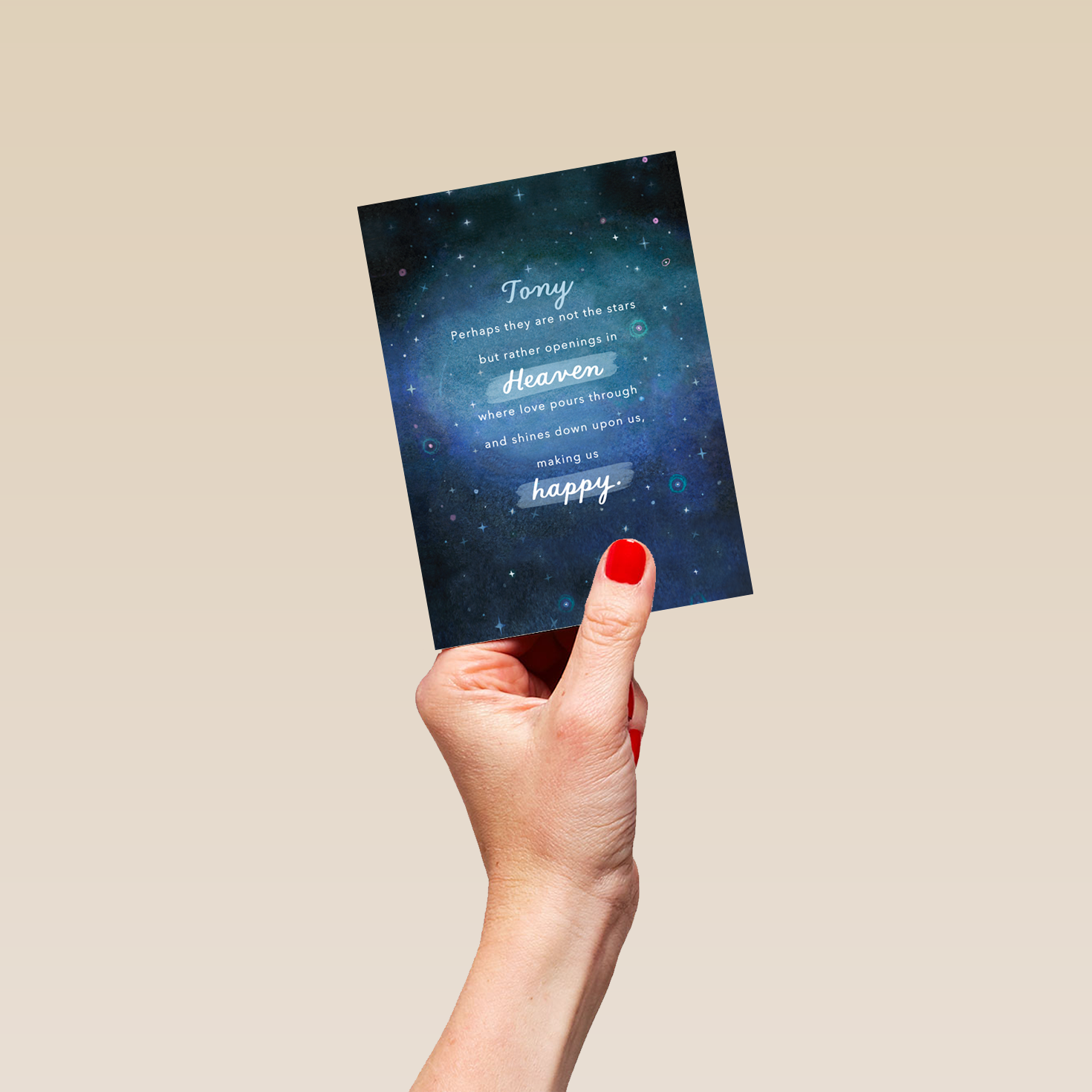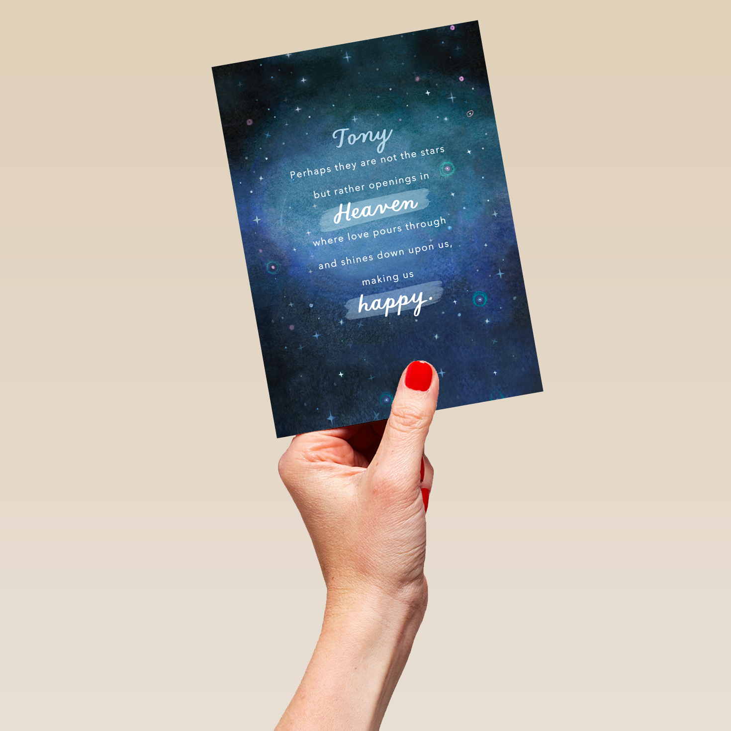 Printed on premium-quality board, this card features a blue watercolour-styled background with stars, with the message 'Perhaps they are not stars but rather openings in Heaven where love pours through and shines down upon us, making us happy.', space to personalise a name, and comes complete with a co-ordinating white envelope.