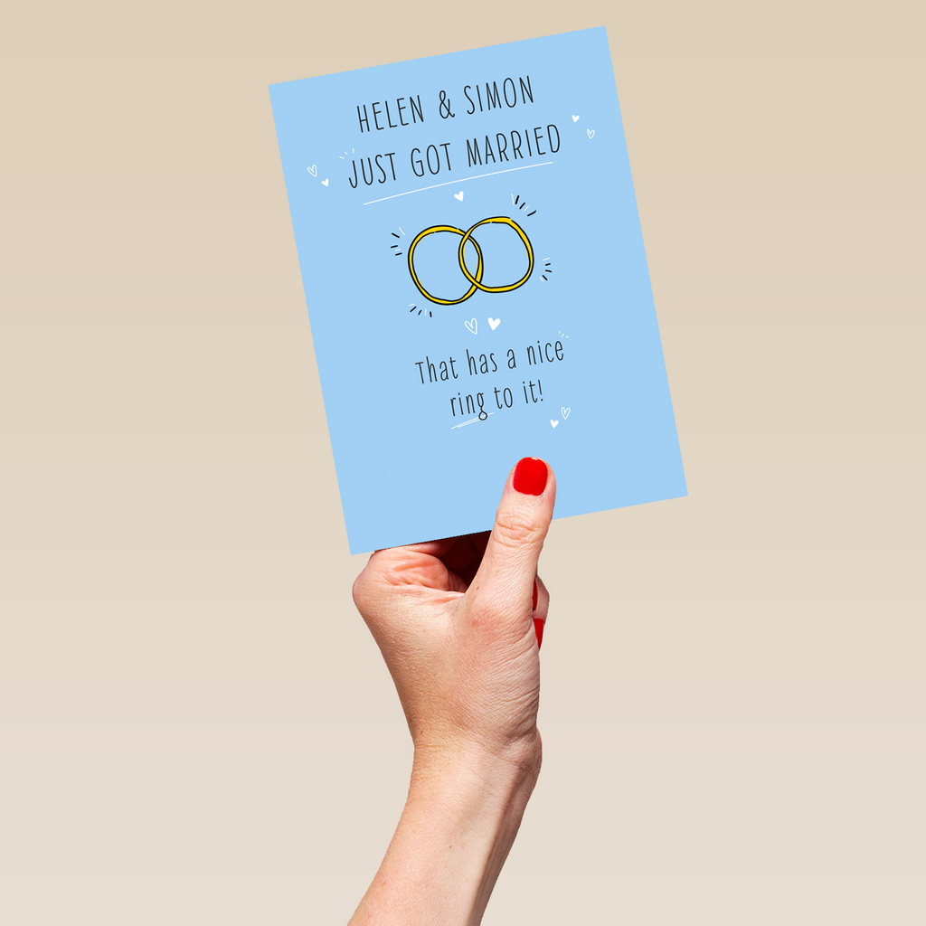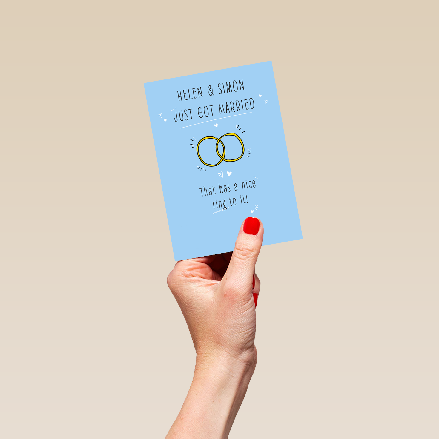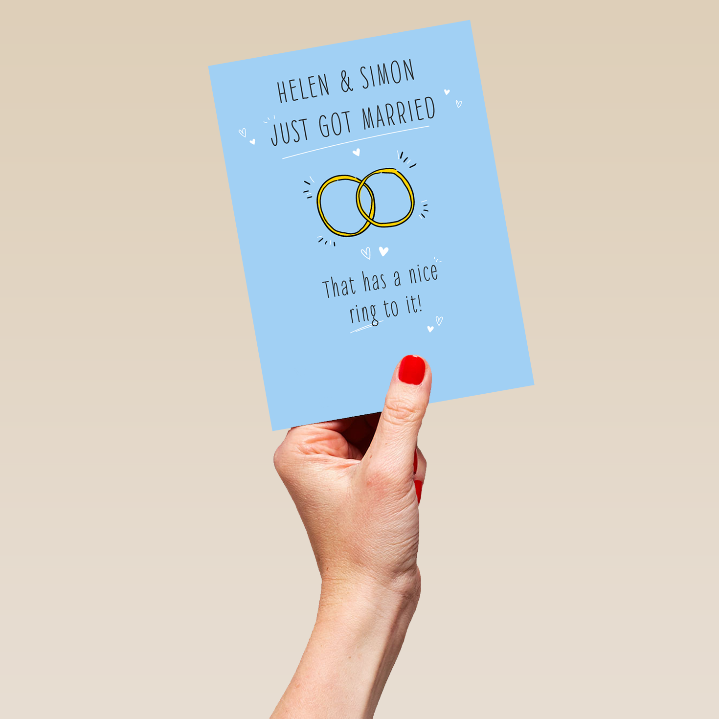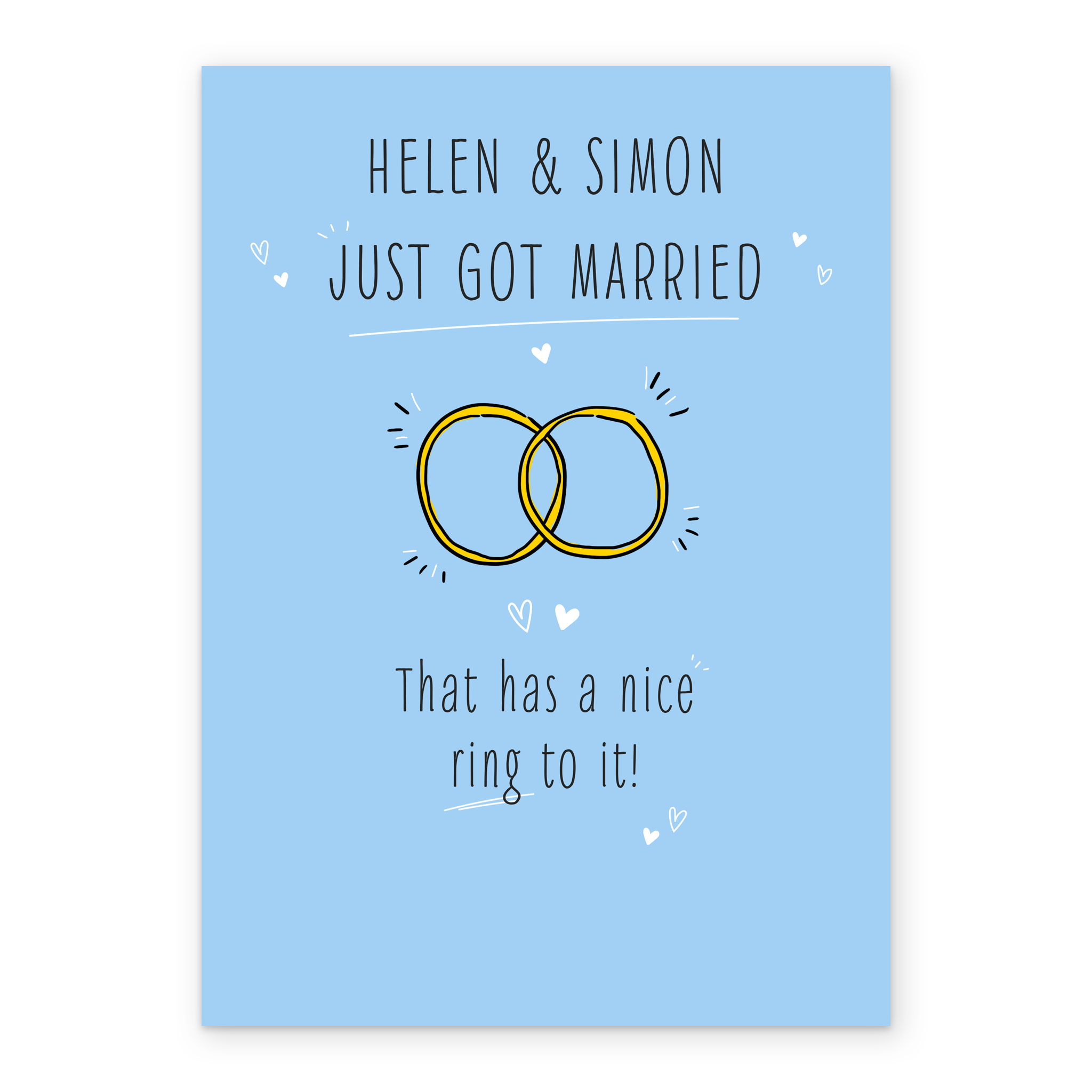 Printed on premium-quality board, this card features cartoon wedding rings on a blue background, with the message 'Just Got Married. That Has A Nice Ring To It!', space to personalise a name, and comes complete with a co-ordinating white envelope.