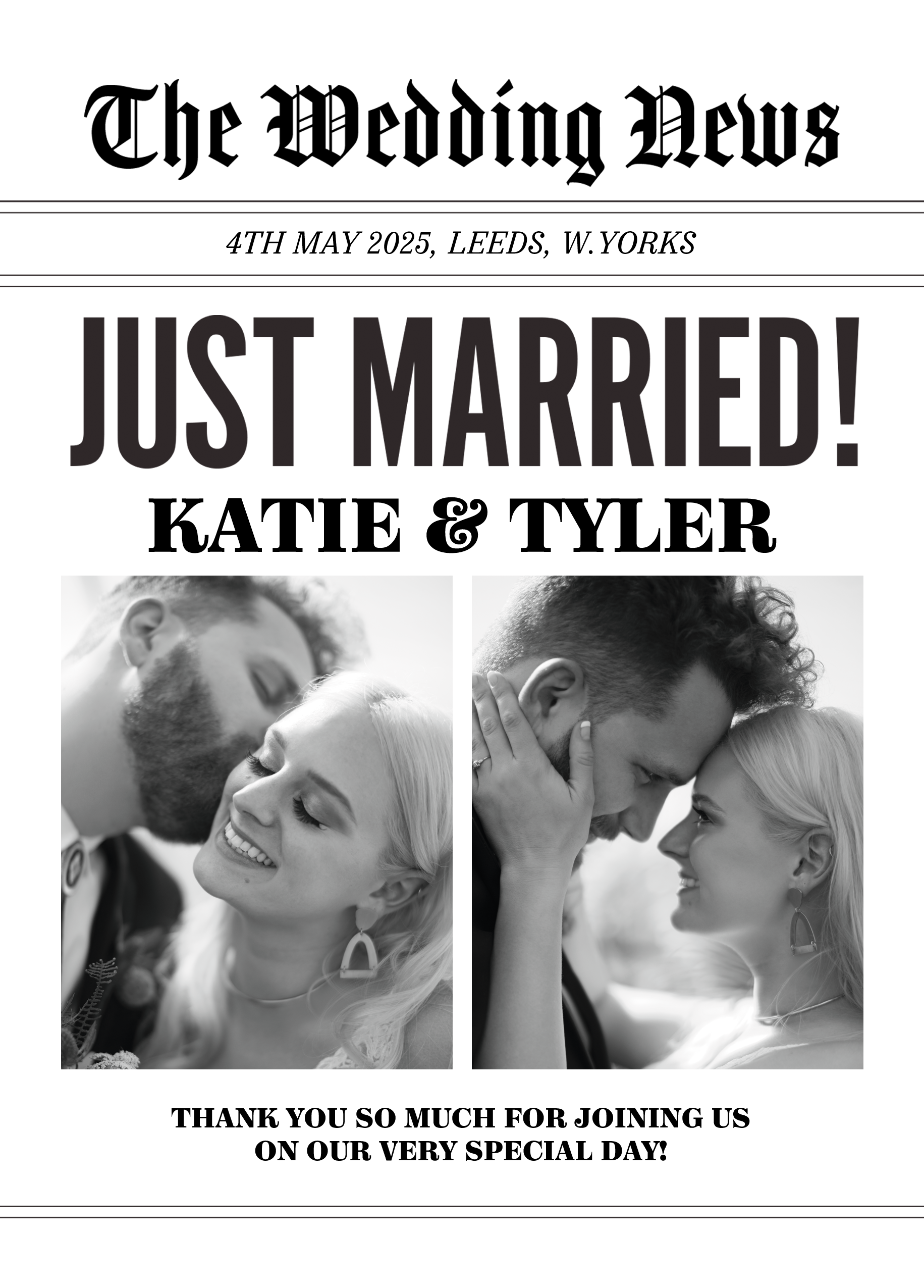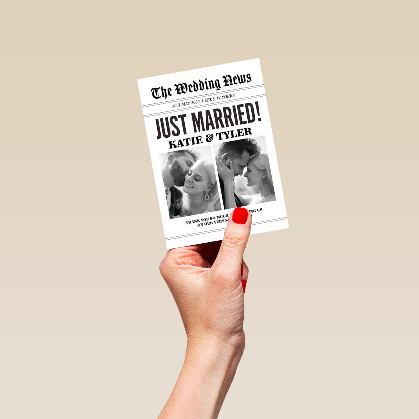 Printed on premium-quality board, this card features a black and white newspaper front page style design with black lettering, with the message 'The Wedding News [DATE] Just Married! [NAME] & [NAME] Thank you so much for joining us on our special day', space to upload photos and personalise your message, and comes complete with a co-ordinating white envelope.