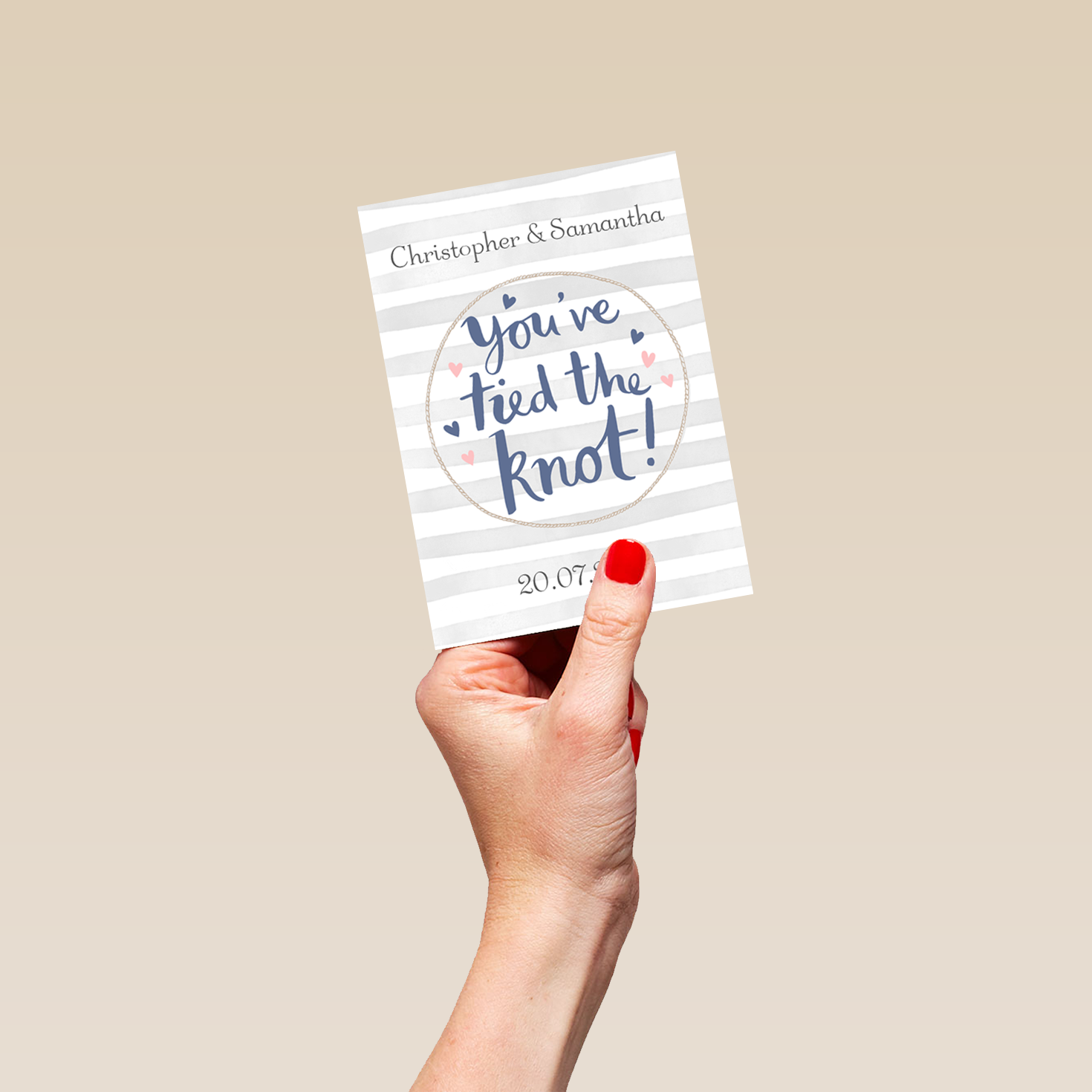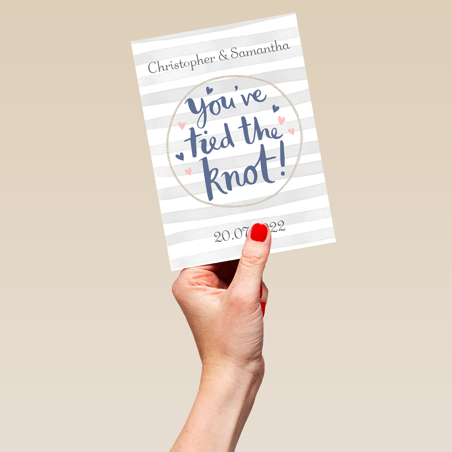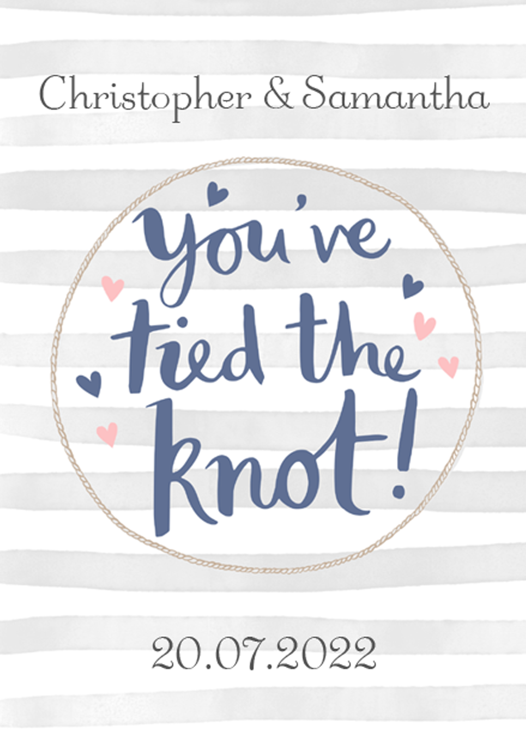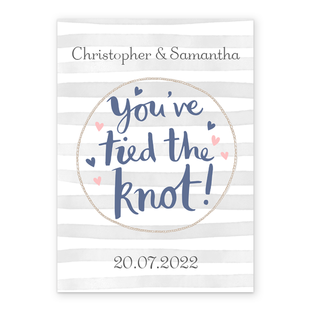 Show them you care with a personalised tied the knot wedding theme card from Hallmark. Our wedding cards are printed on premium quality, FSC®-certified card & delivered nationwide. This card is available as standard 12cm by 16.7cm and large 15.5cm by 21.6cm.
