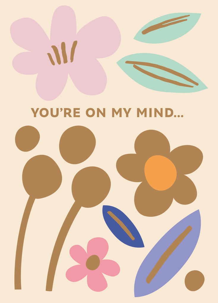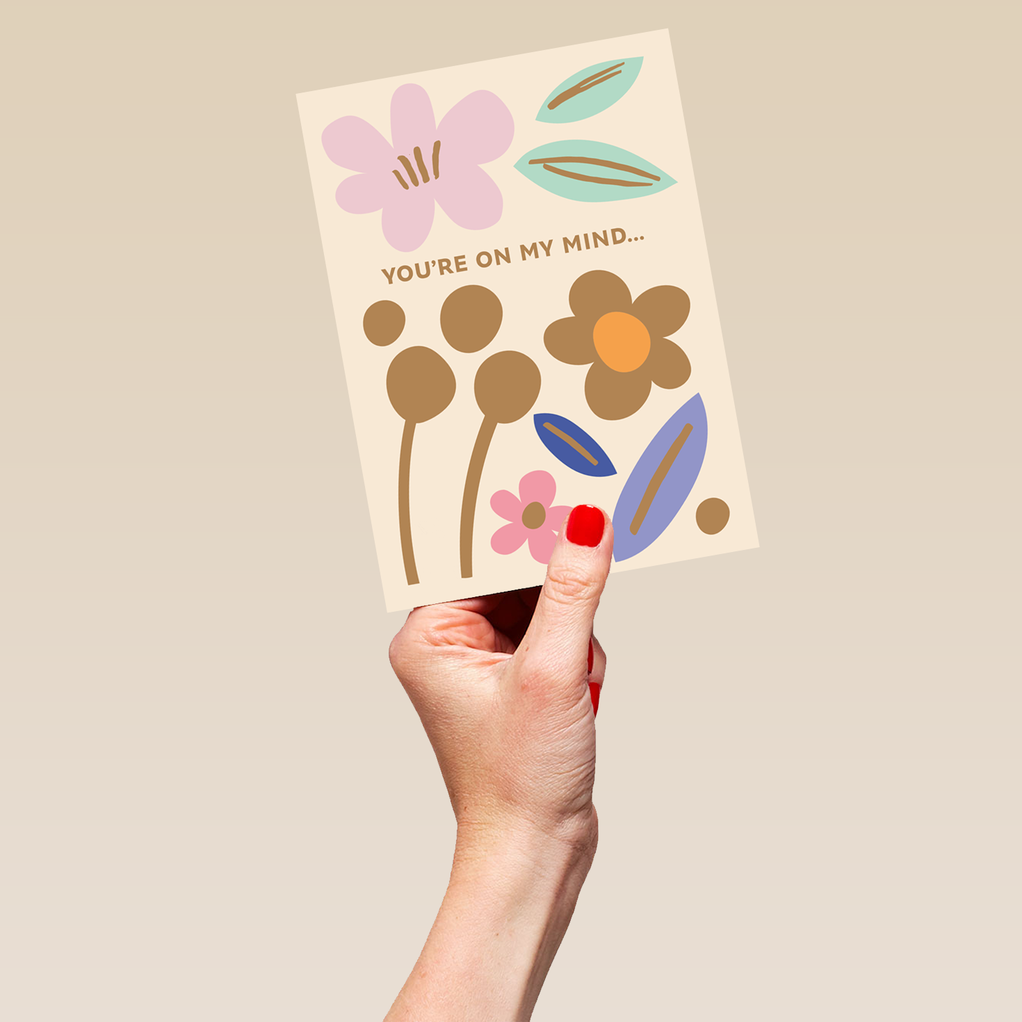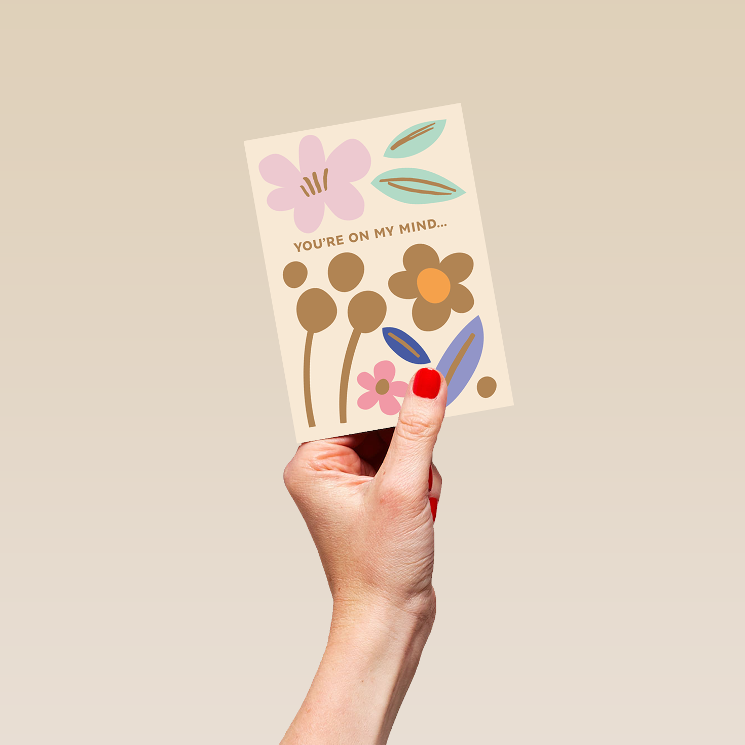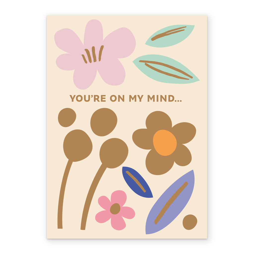 Printed on premium-quality board, this card features a pink background with floral shapes, with the message 'You're On My Mind…', space to personalise your message, and comes complete with a co-ordinating white envelope.