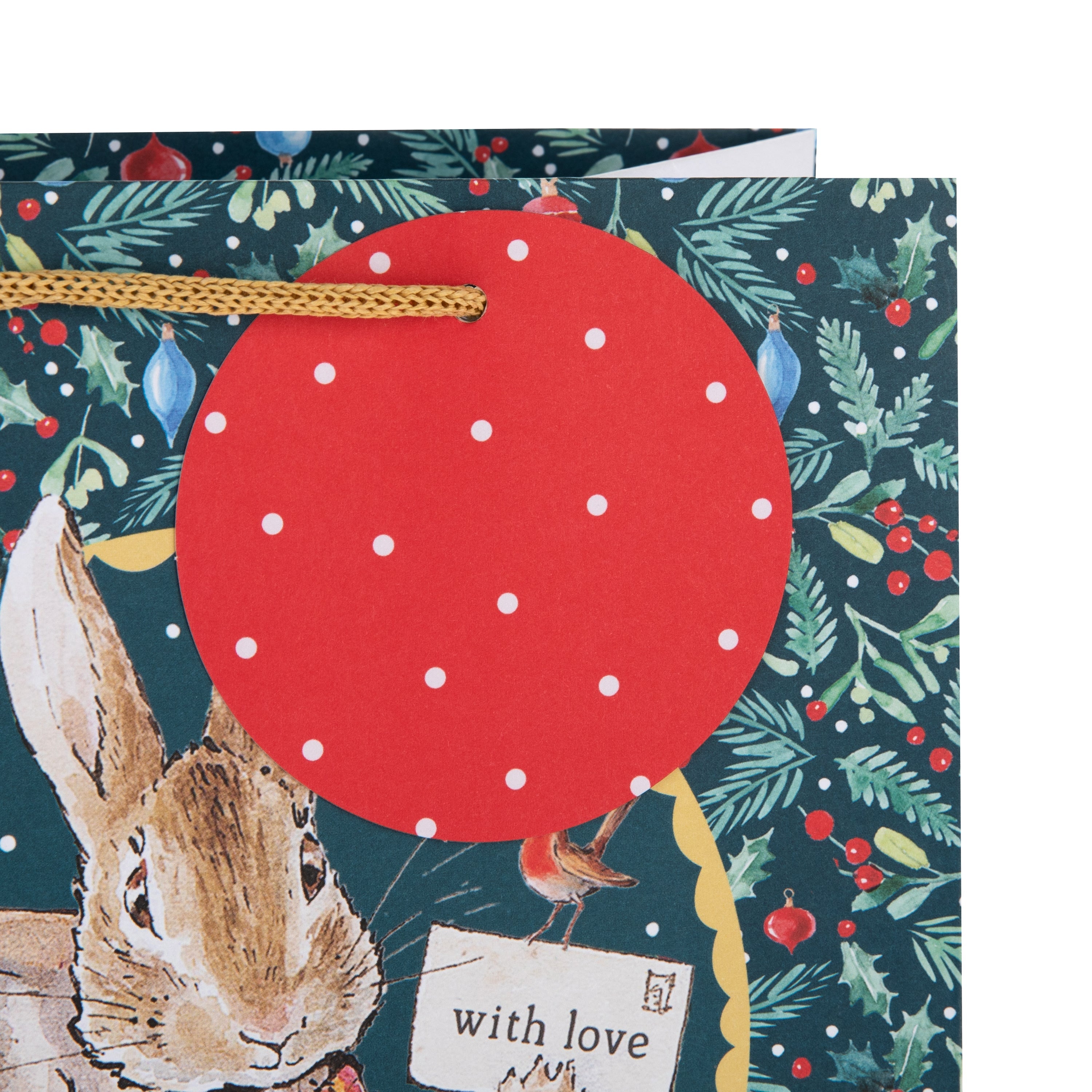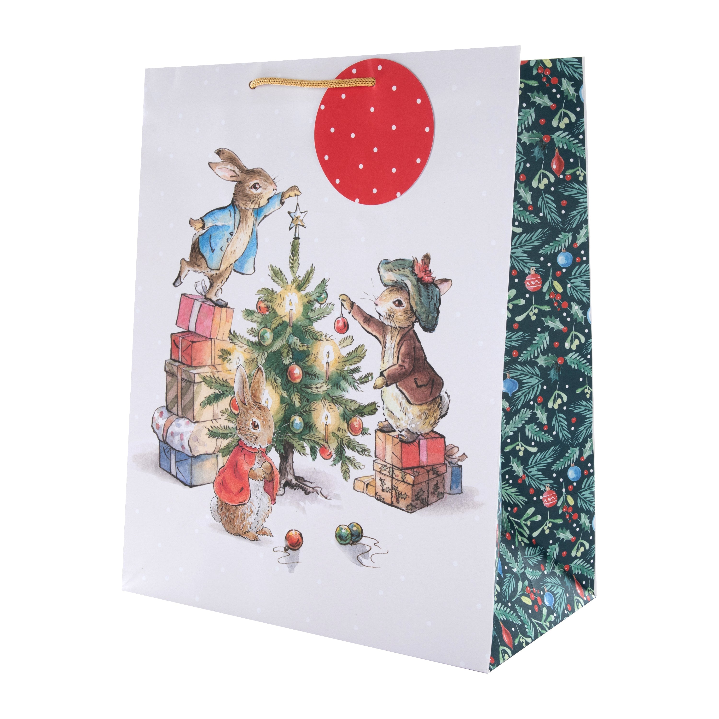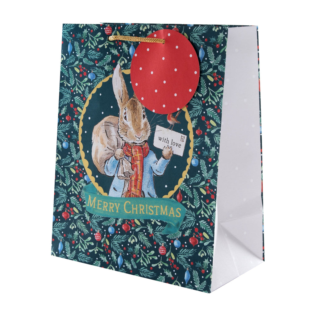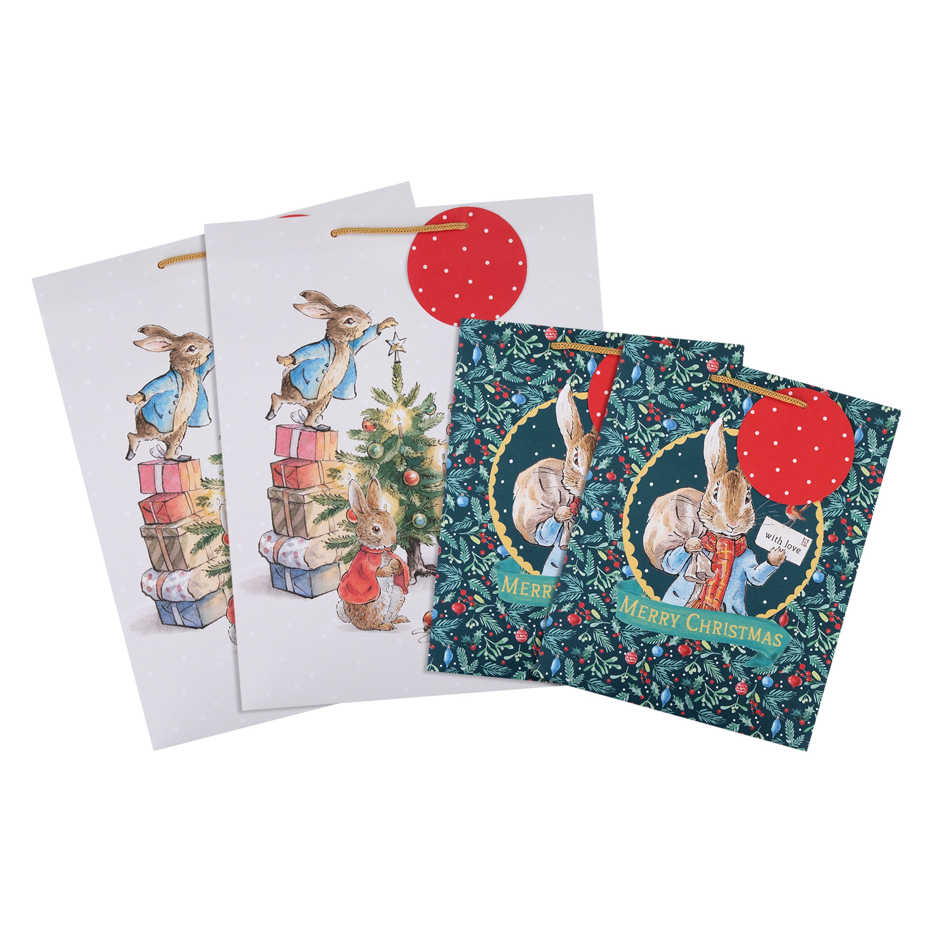 This pack contains 2 large and 2 medium Christmas gift bags in two Peter Rabbit™ inspired designs; all bags feature brown knitted paper handles and a red die-cut circular gift tag with white polka dots. The large bags feature a cute design of Peter Rabbit™, Benjamin Bunny and Flopsy Bunny decorating a Christmas tree together. The medium bags feature a green background with a seasonal foliage pattern, with an illustration of Peter Rabbit™ carrying a sack and holding an envelope titled 'with love' with a festive robin perched on it, and the message 'Merry Christmas' on the front of the bags.