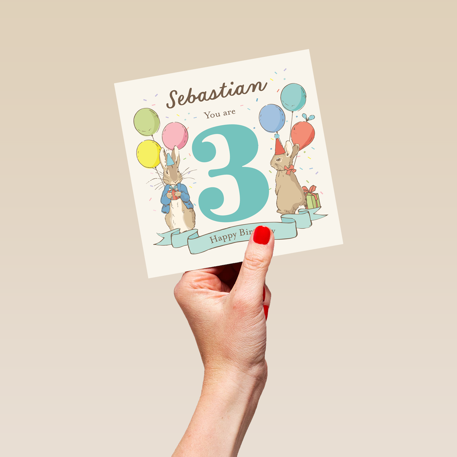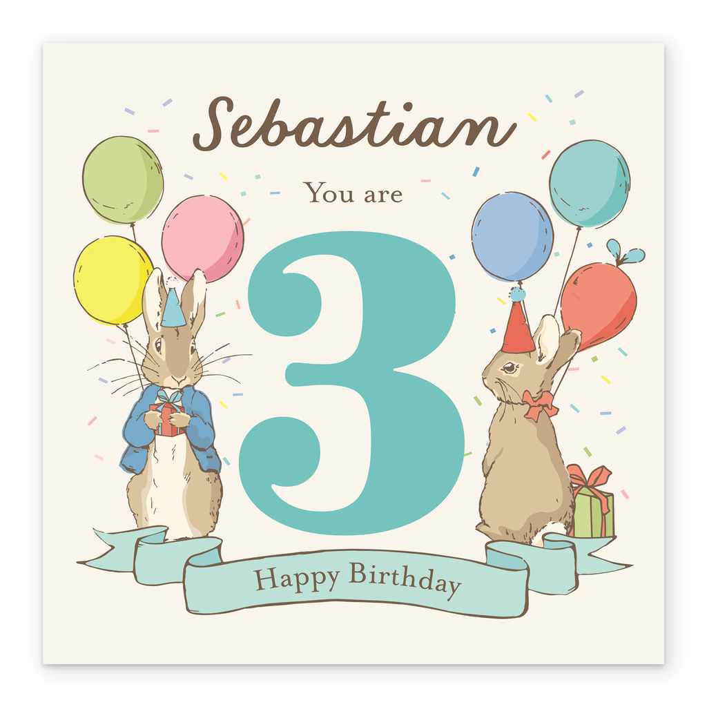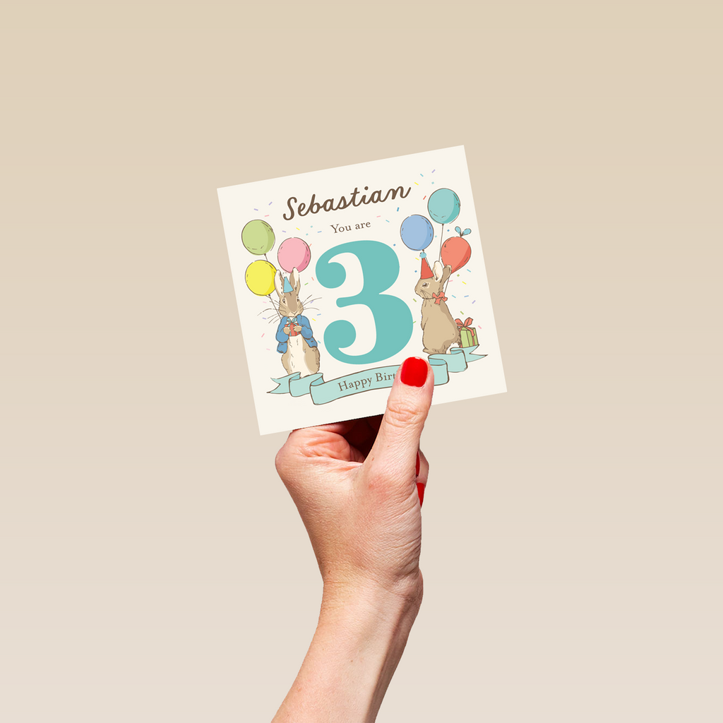 Printed on premium-quality board, this card features Peter Rabbit™ and Flopsy Bunny with balloons and party hats, with the message '[NAME] You are [AGE] Happy Birthday', space to personalise a name and the age, and comes complete with a co-ordinating white envelope.