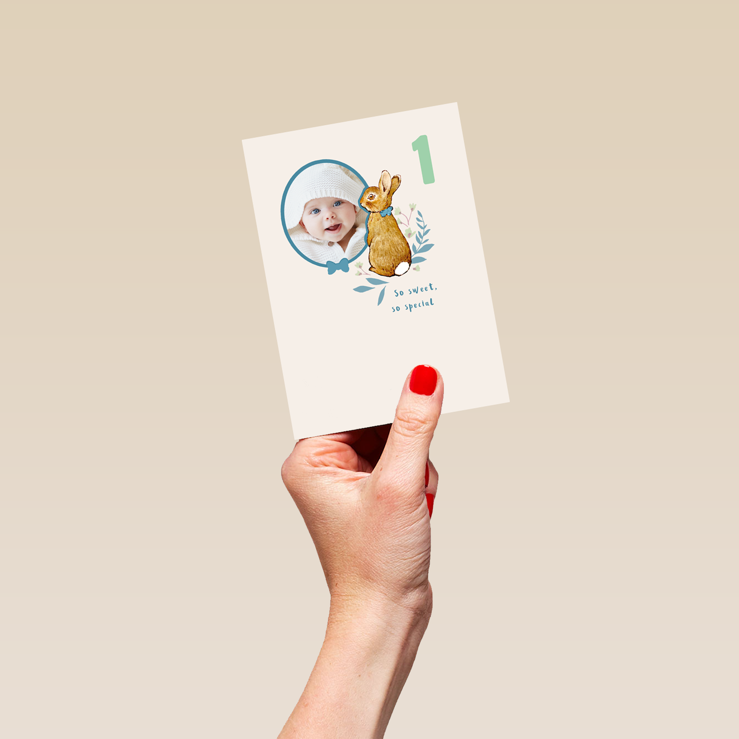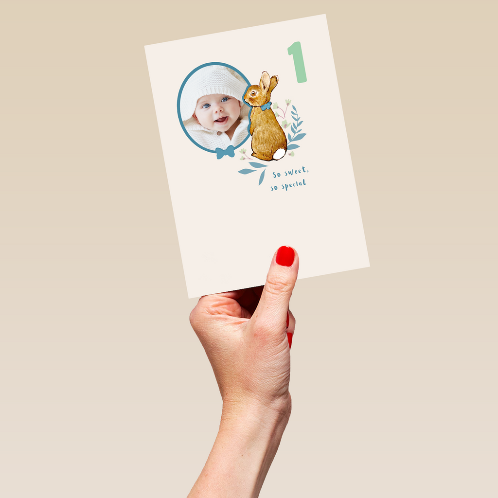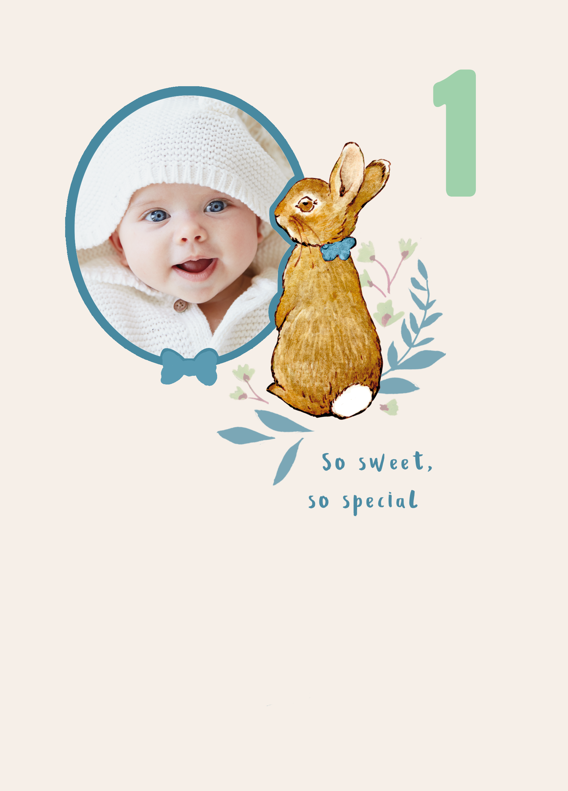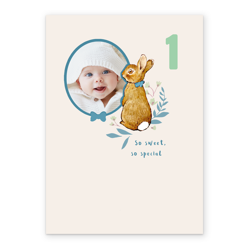 Printed on premium-quality board, this card features Beatrix Potter's classic Peter Rabbit™, with a blue photo frame, text and floral design on a pale pink background, with the message 'So Sweet, So Special', space to upload a photo and personalise an age, and comes complete with a co-ordinating white envelope.