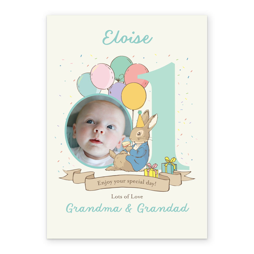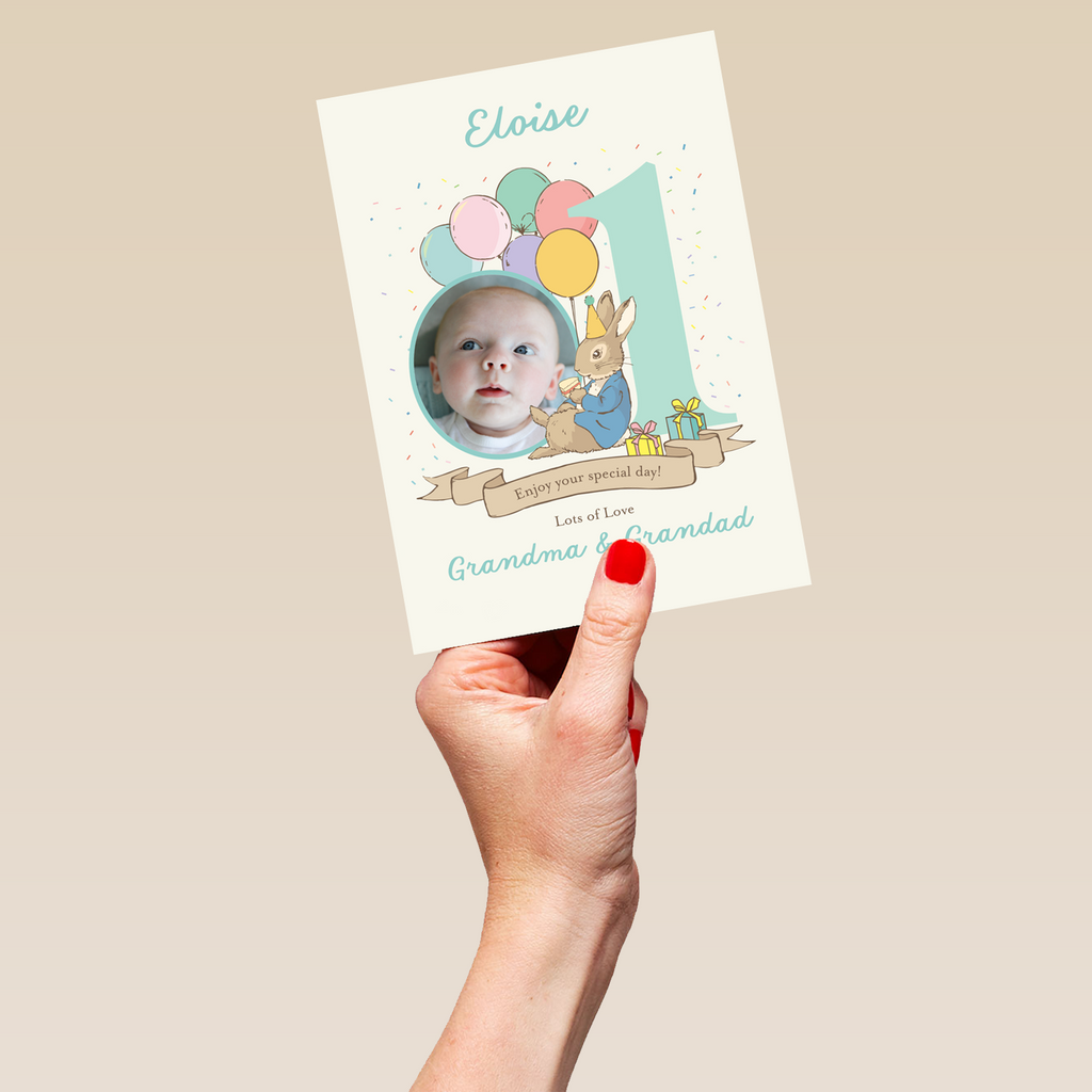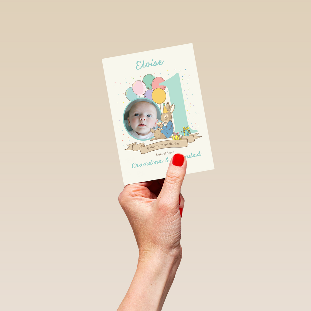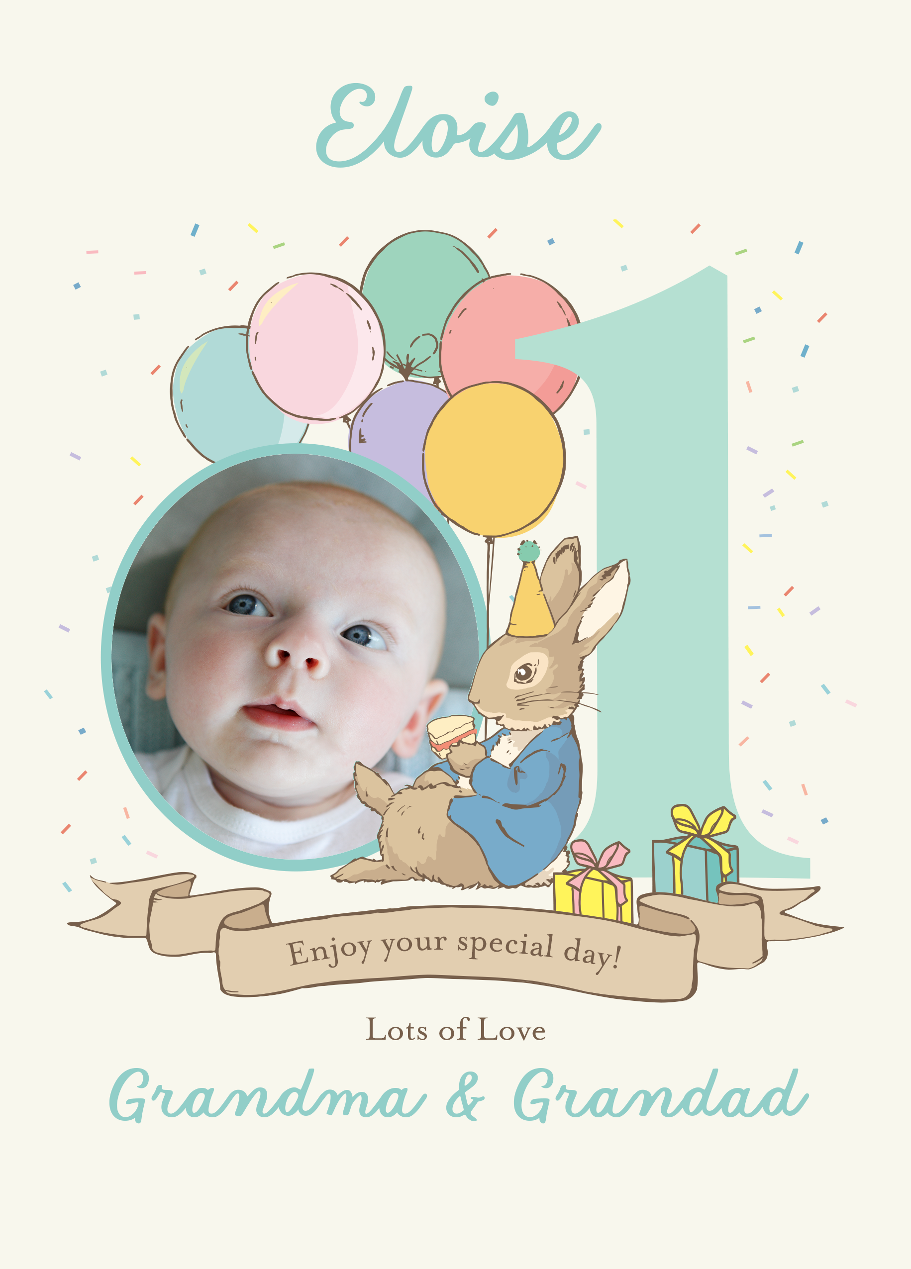 Personalised Photo Upload & Editable Peter Rabbit™ 1st Birthday Card