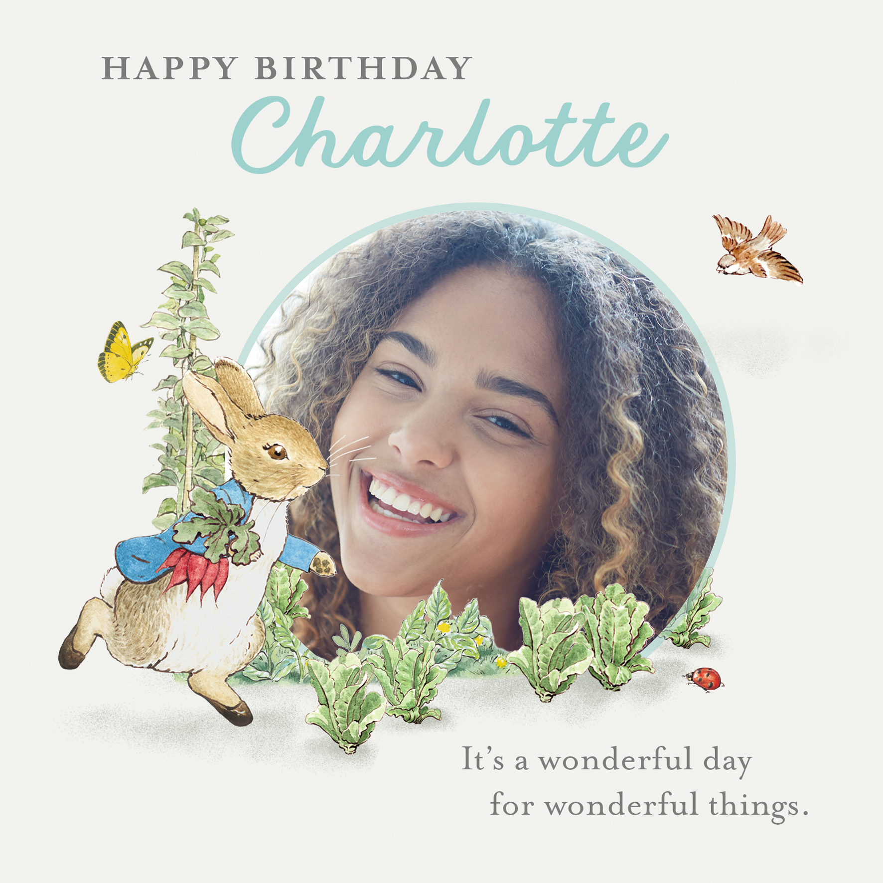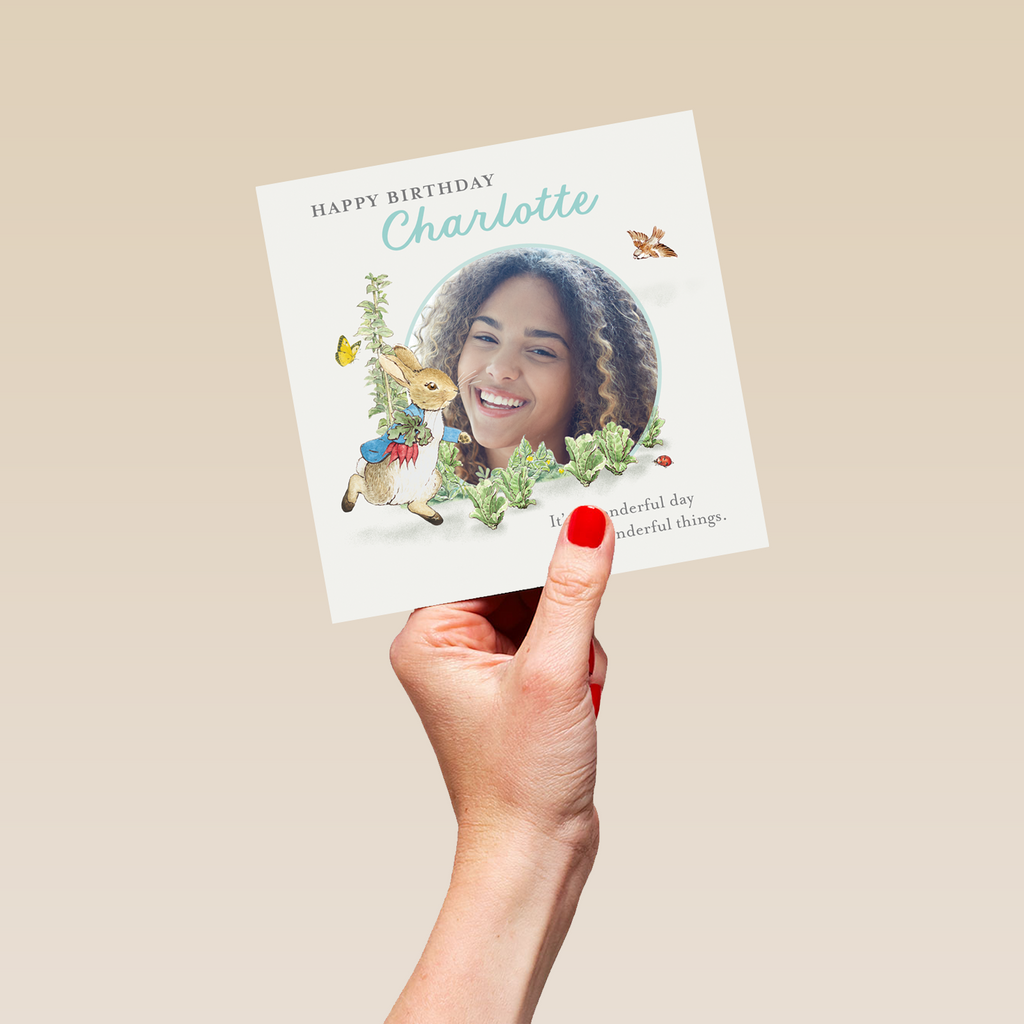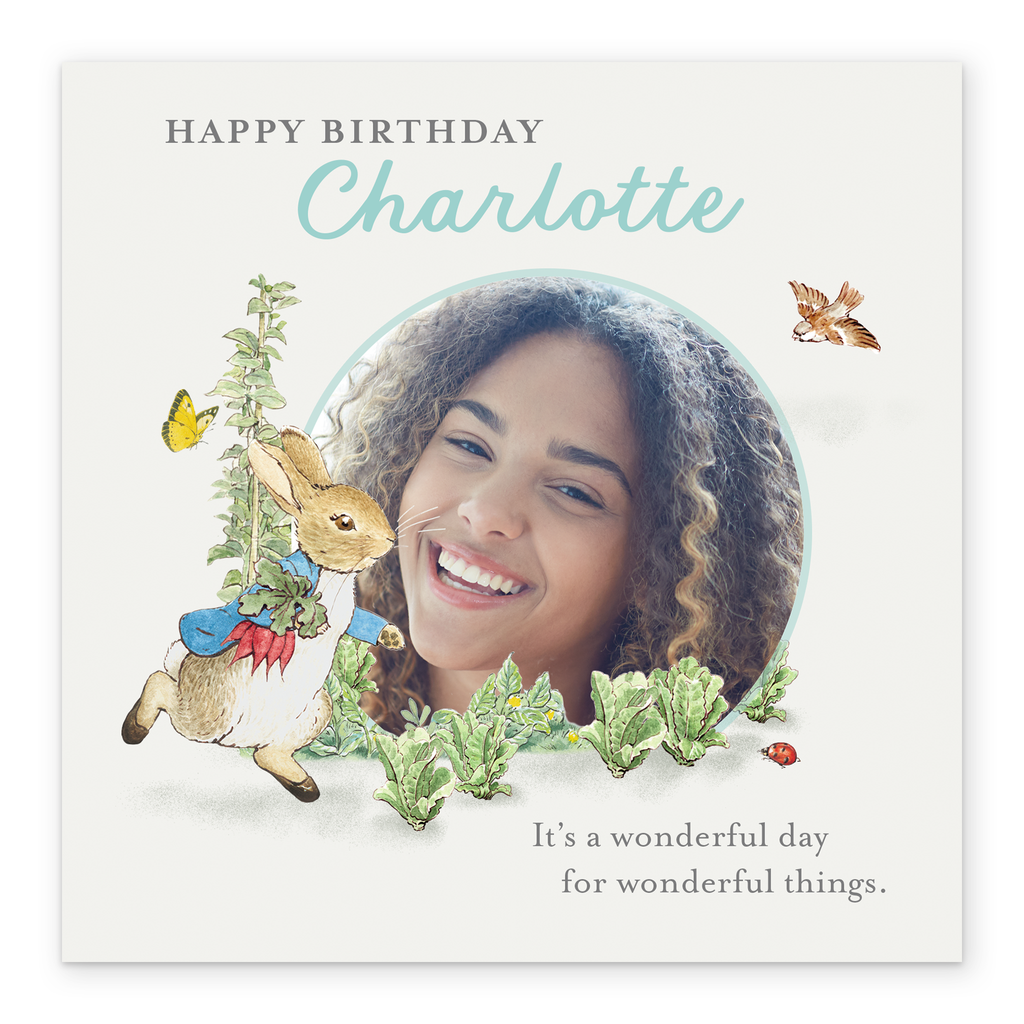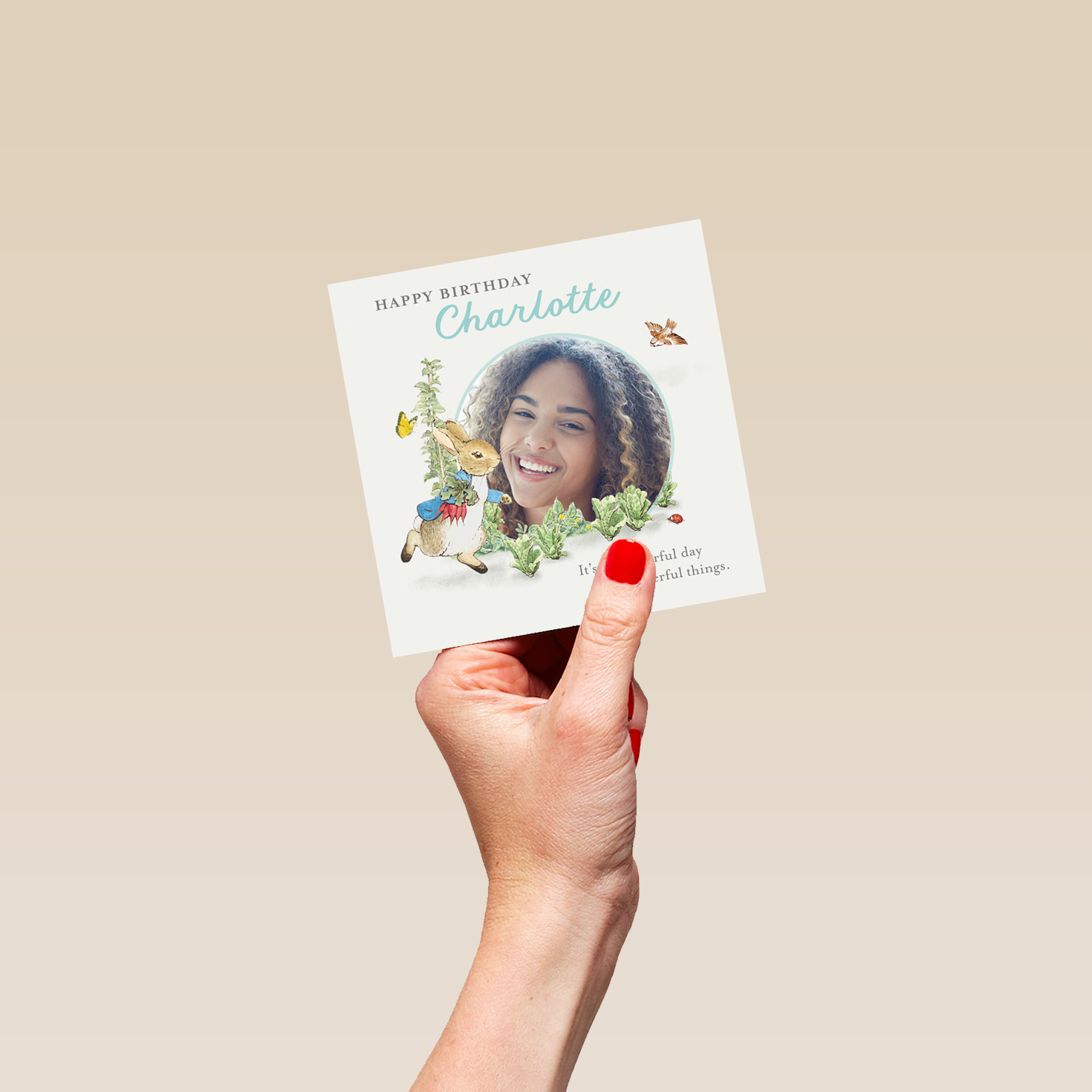 Printed on premium-quality board, this card features Peter Rabbit™ picking radishes, with the message 'Happy Birthday [NAME] It's a wonderful day for wonderful things.', space to upload a photo and personalise a name, and comes complete with a co-ordinating white envelope.