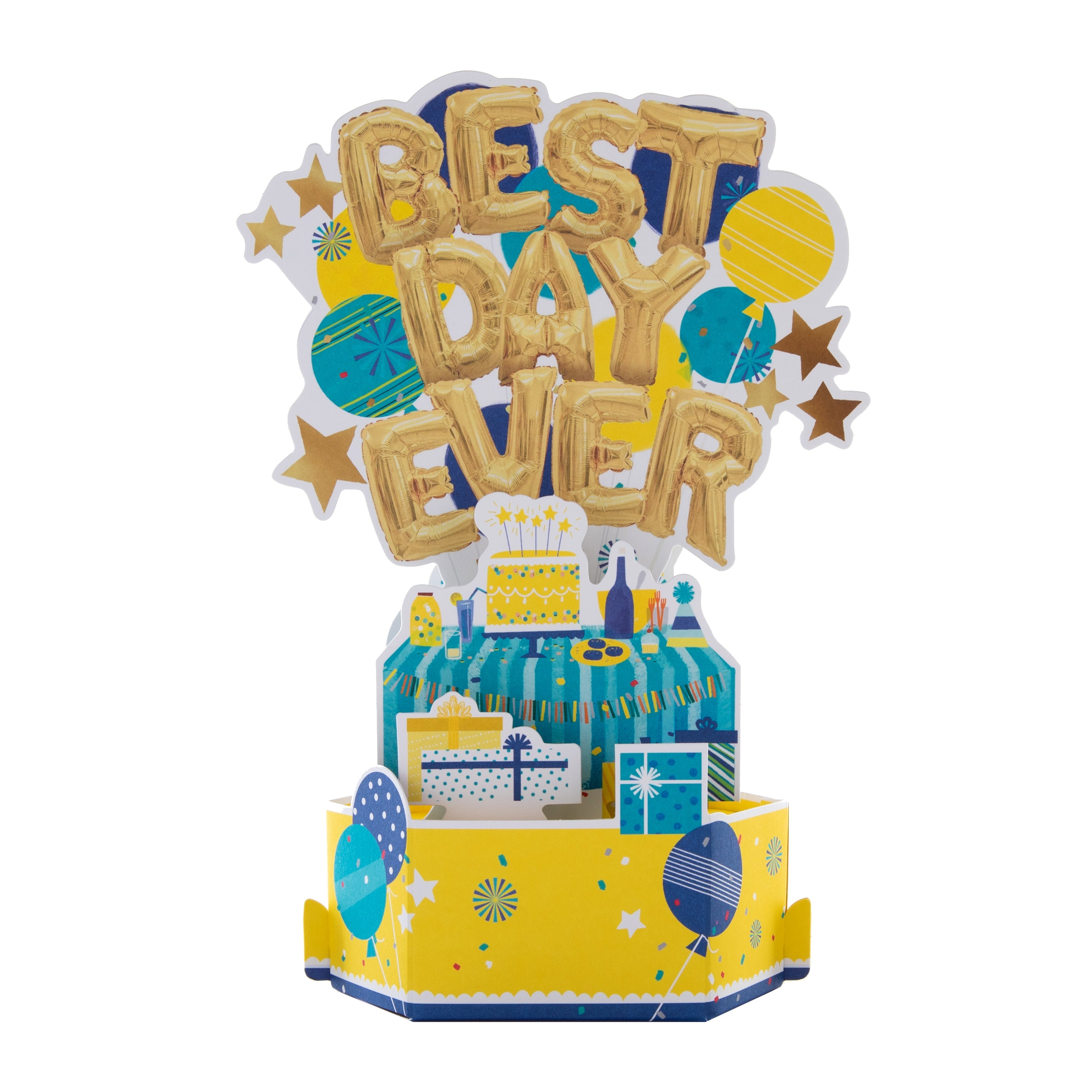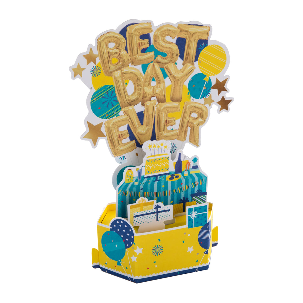 Printed on high-quality board, this card pops-up into a 3D display of balloons, cake and presents, a banner with the message 'Best Day Ever', instructions on how to display the card, and comes complete with a co-ordinating Hallmark branded, blue envelope.