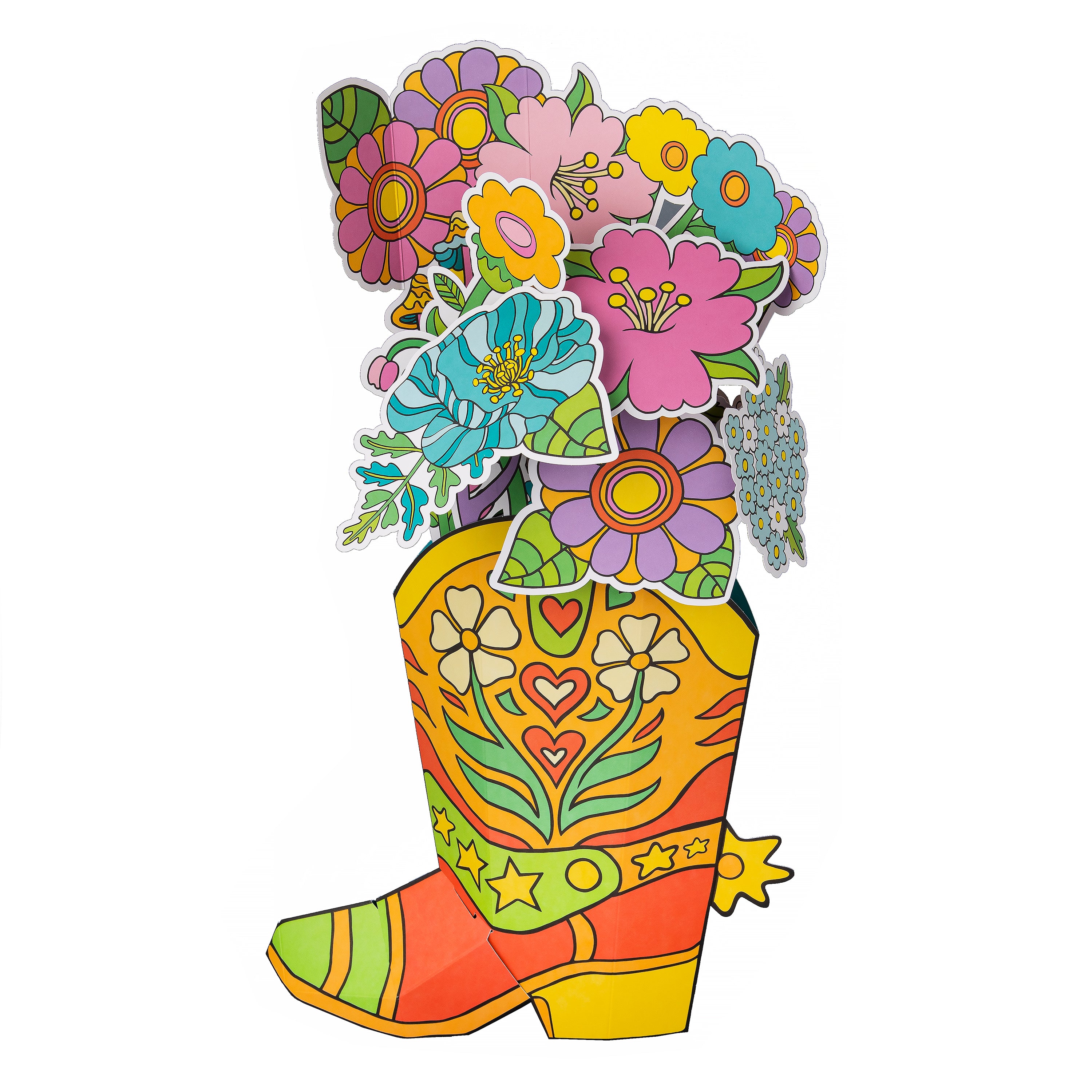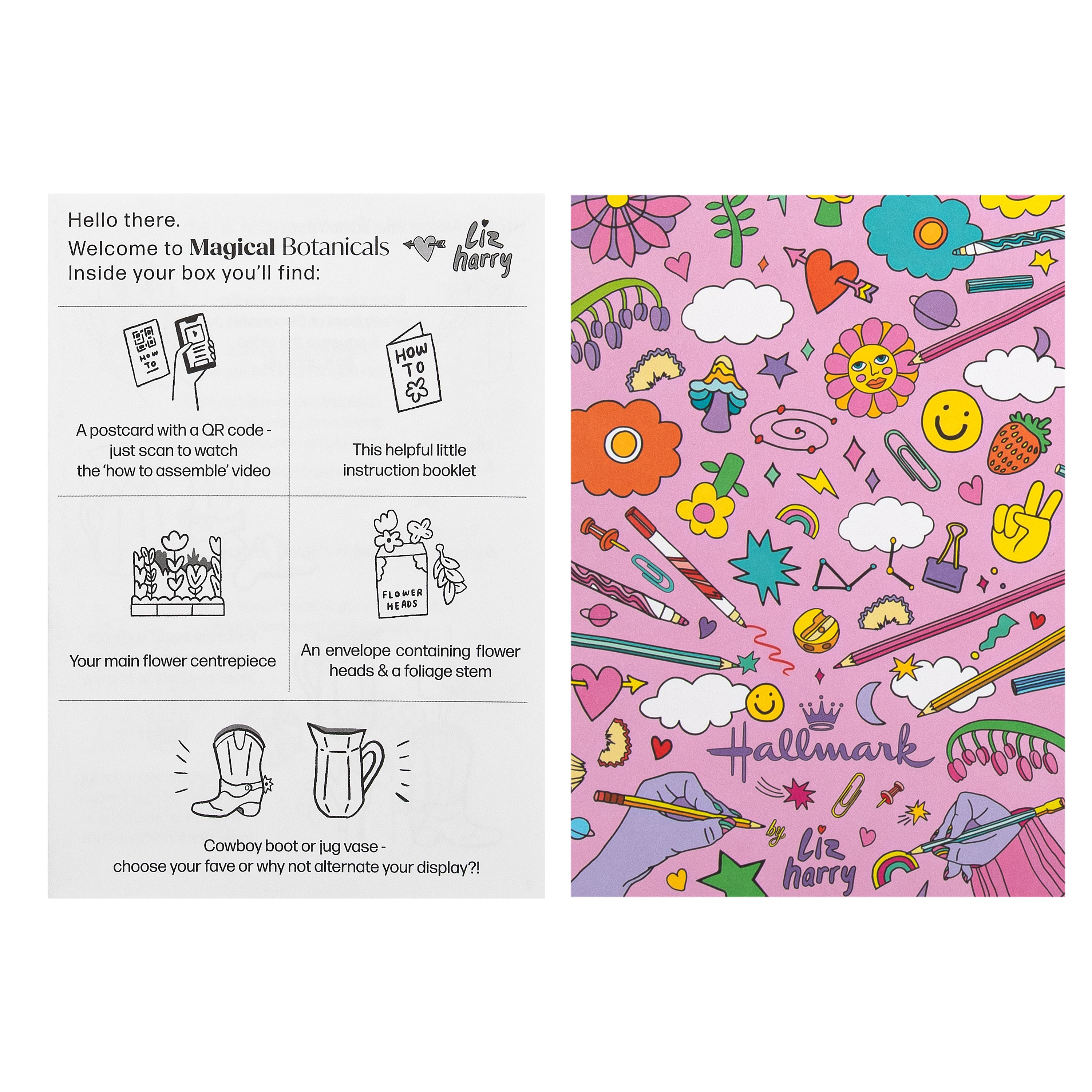 Printed on high-quality board, this card pops up into a 3D diorama of a vase with a colourful bouquet of flowers. This card features die-cut flower attachments and the option of two vases, a Cowboy boot design or a Decorative jug design. This card comes complete with a co-ordinating Hallmark & Liz Harry branded, pink envelope with a colourful illustration. This botanical beauty comes with all you need to know to create your own fantastic floral display.