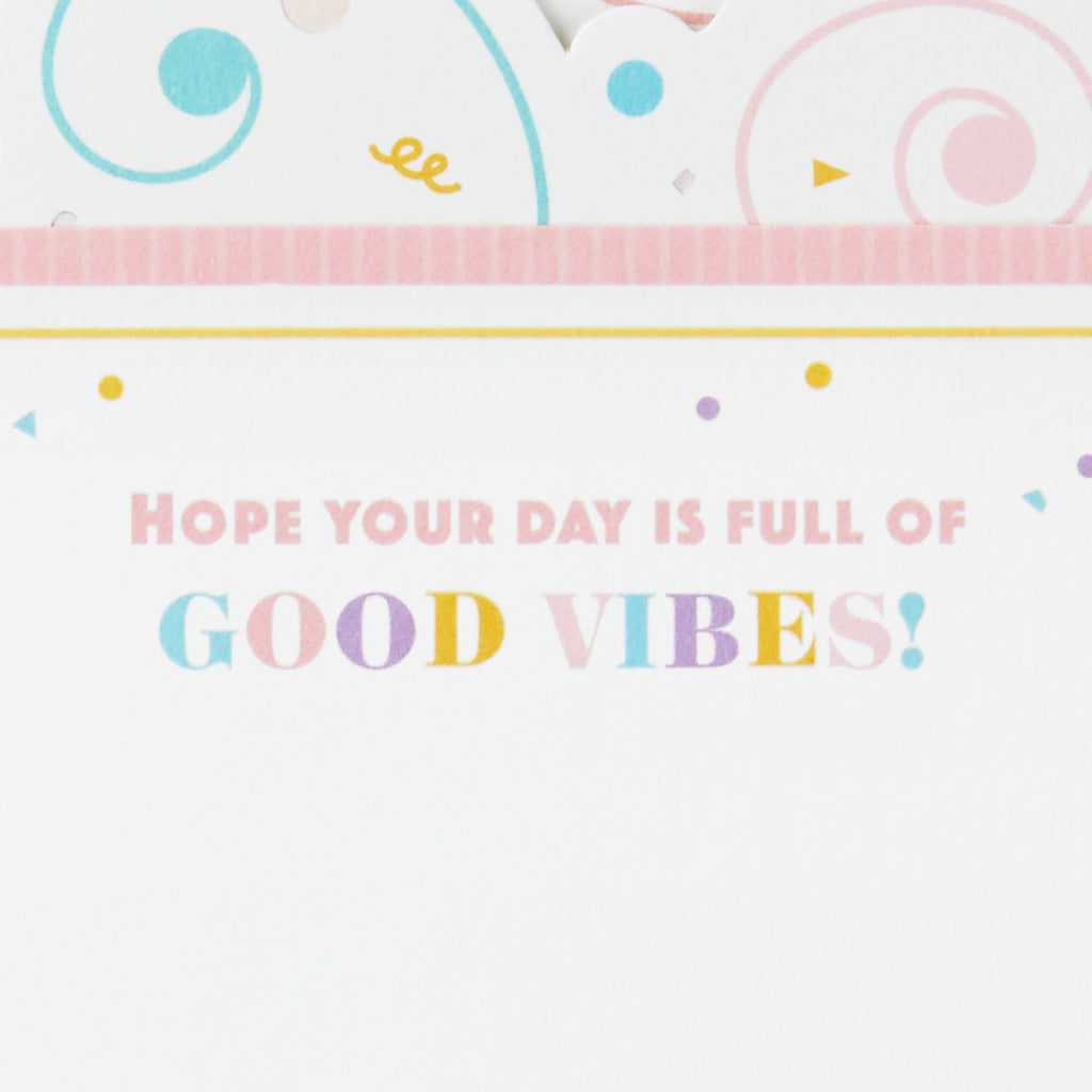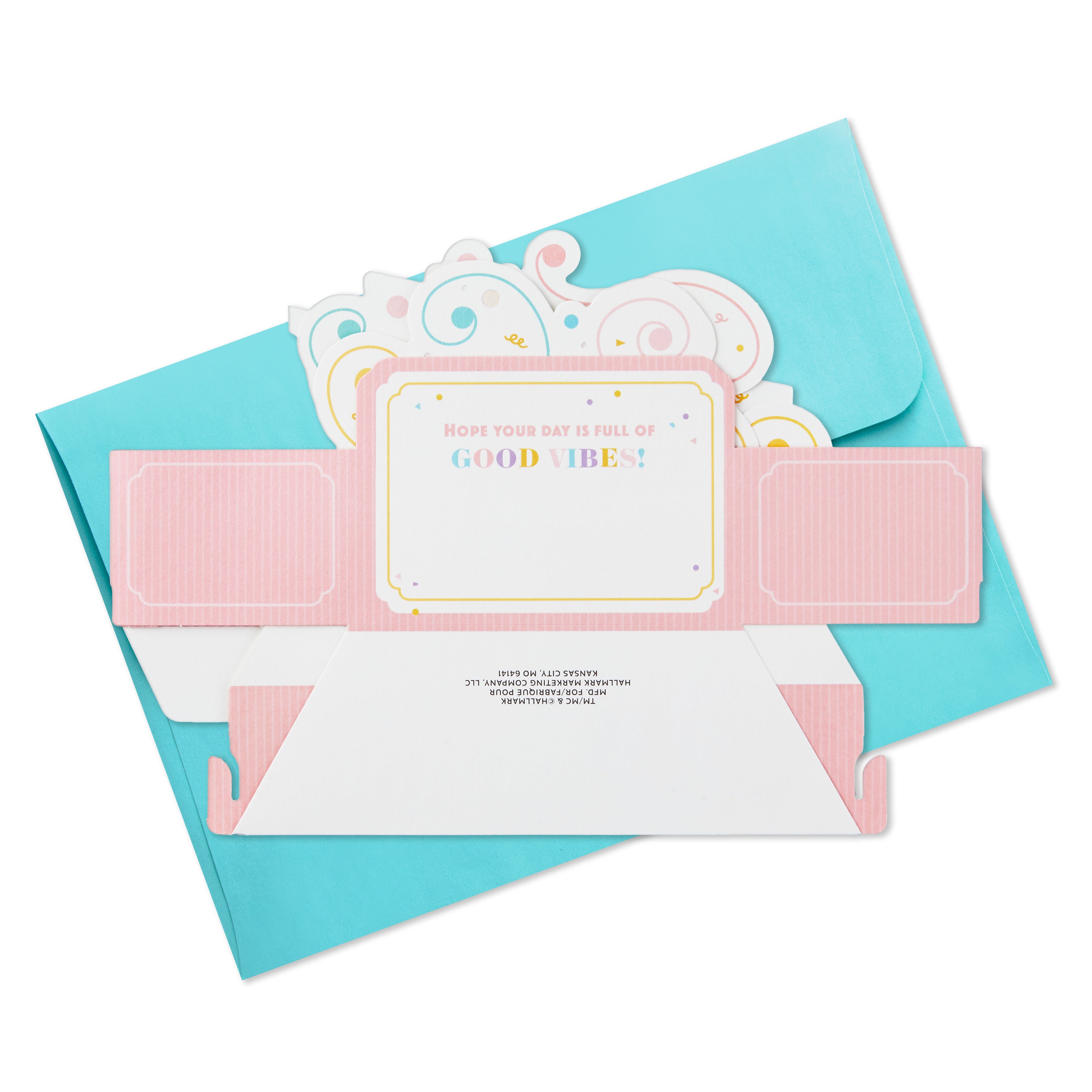 This card pops-up into a 3D display with a colourful "Happy Birthday" banner. This card features a die-cut design, a pink display base and comes complete with a co-ordinating Hallmark branded, turquoise envelope.