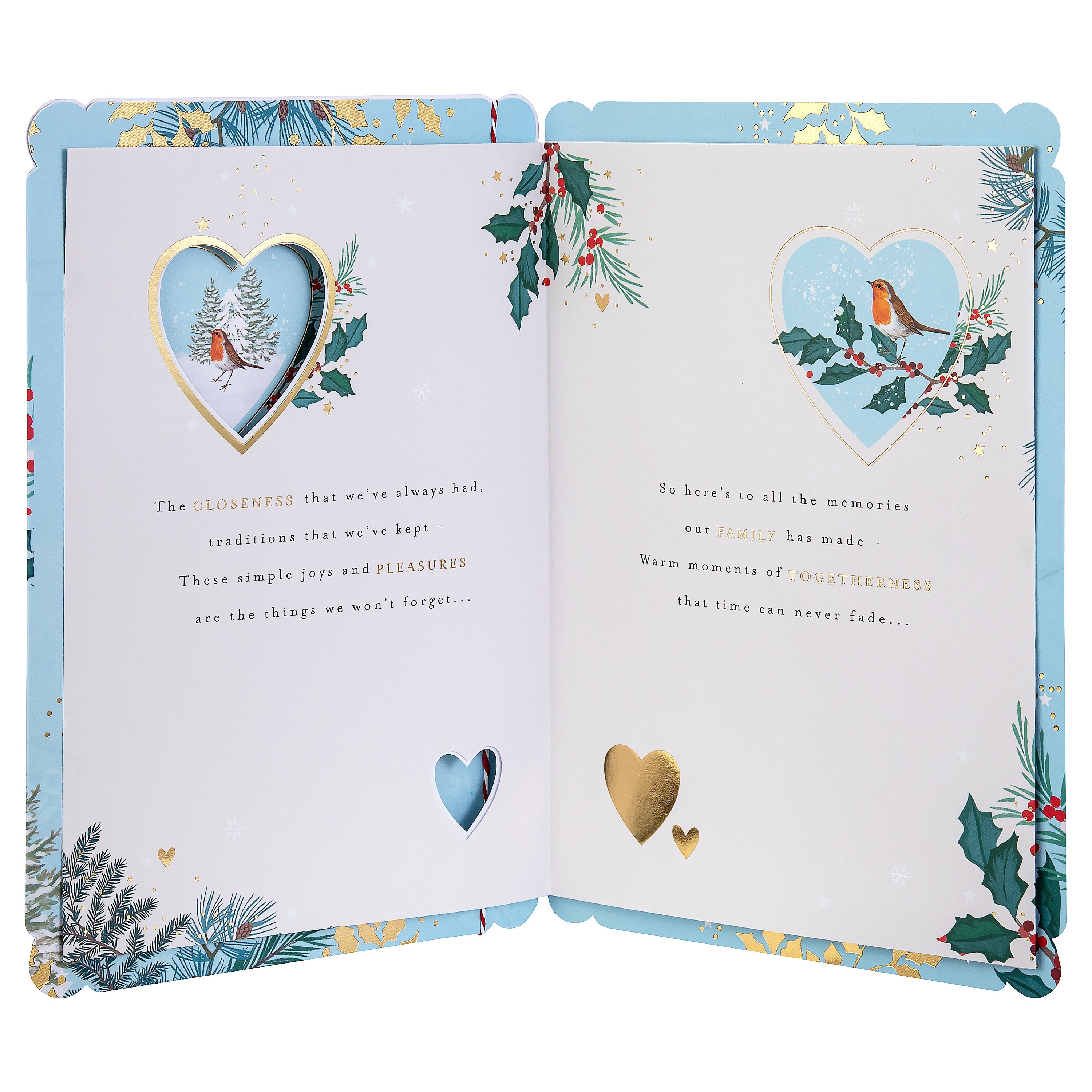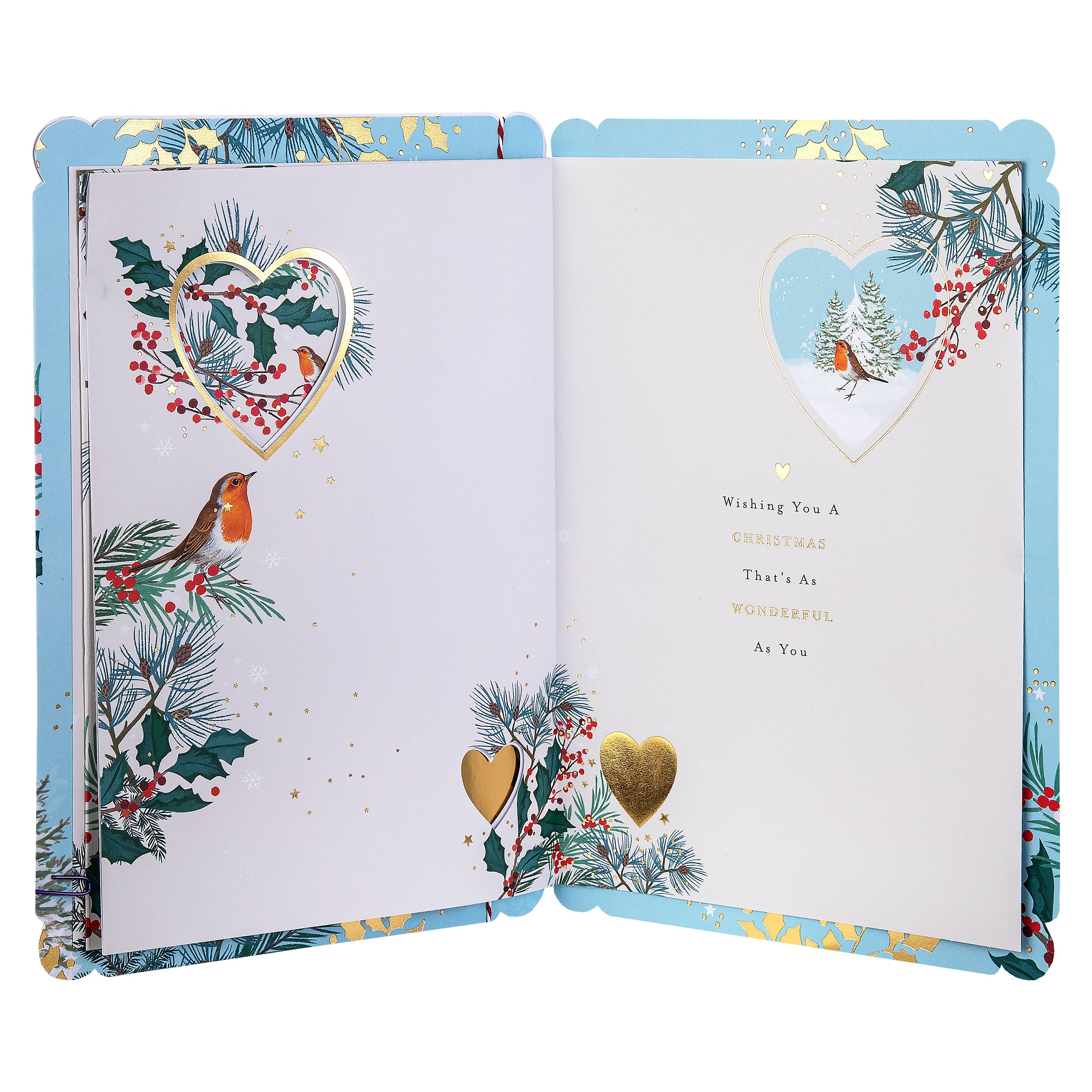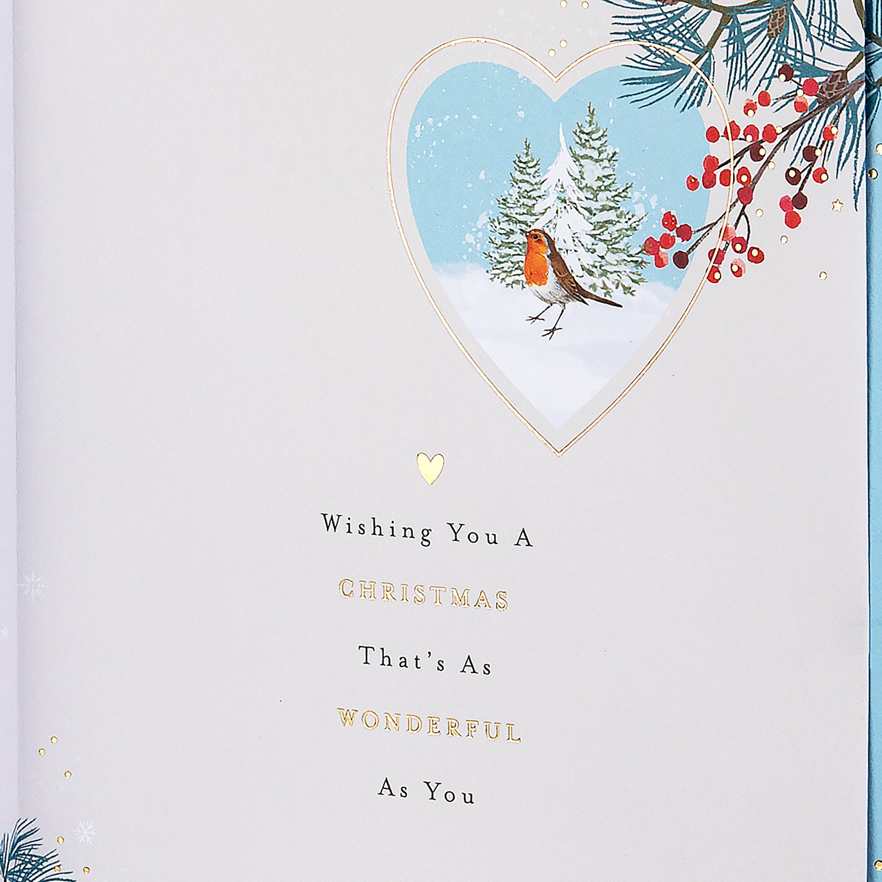 Printed on high-quality board with die-cut edges, this lovely card features an illustrated design of a robin perched amongst snow covered trees against a light blue background, framing the first part of a heartfelt seasonal message. Embossed details, gold foil paper star 'gems' and gold foil highlights, along with a classic red and white twine attachment, complete the design, with the gold foil highlights continuing across the 6-page paper insert, along with die-cut details and the remainder of the message. The card comes complete with a co-ordinating bright red, Hallmark branded envelope.