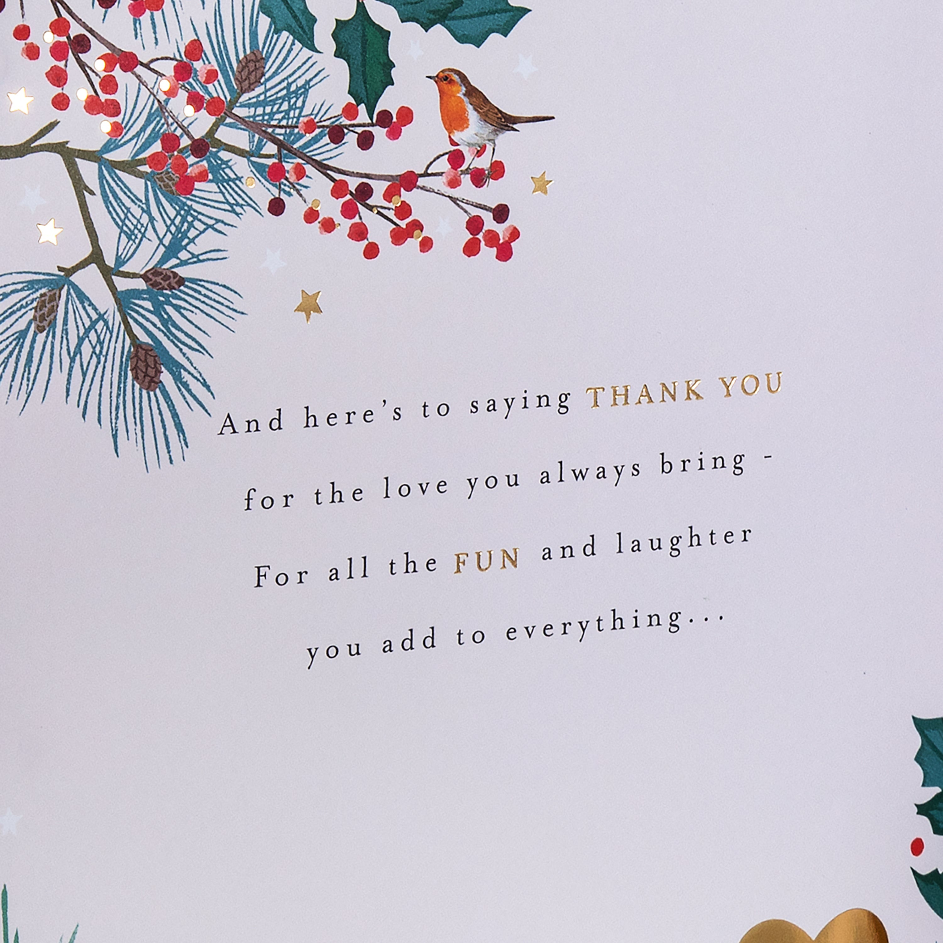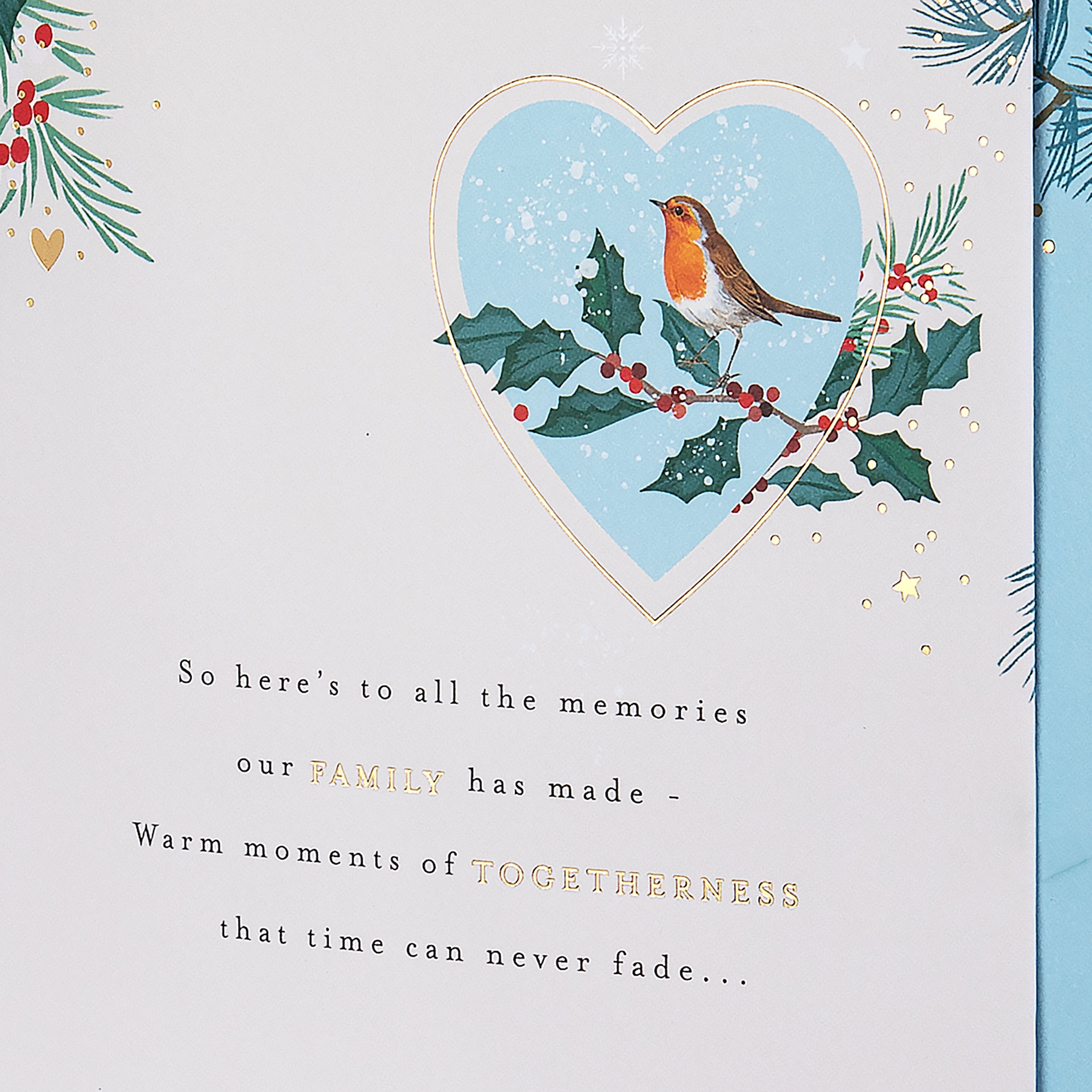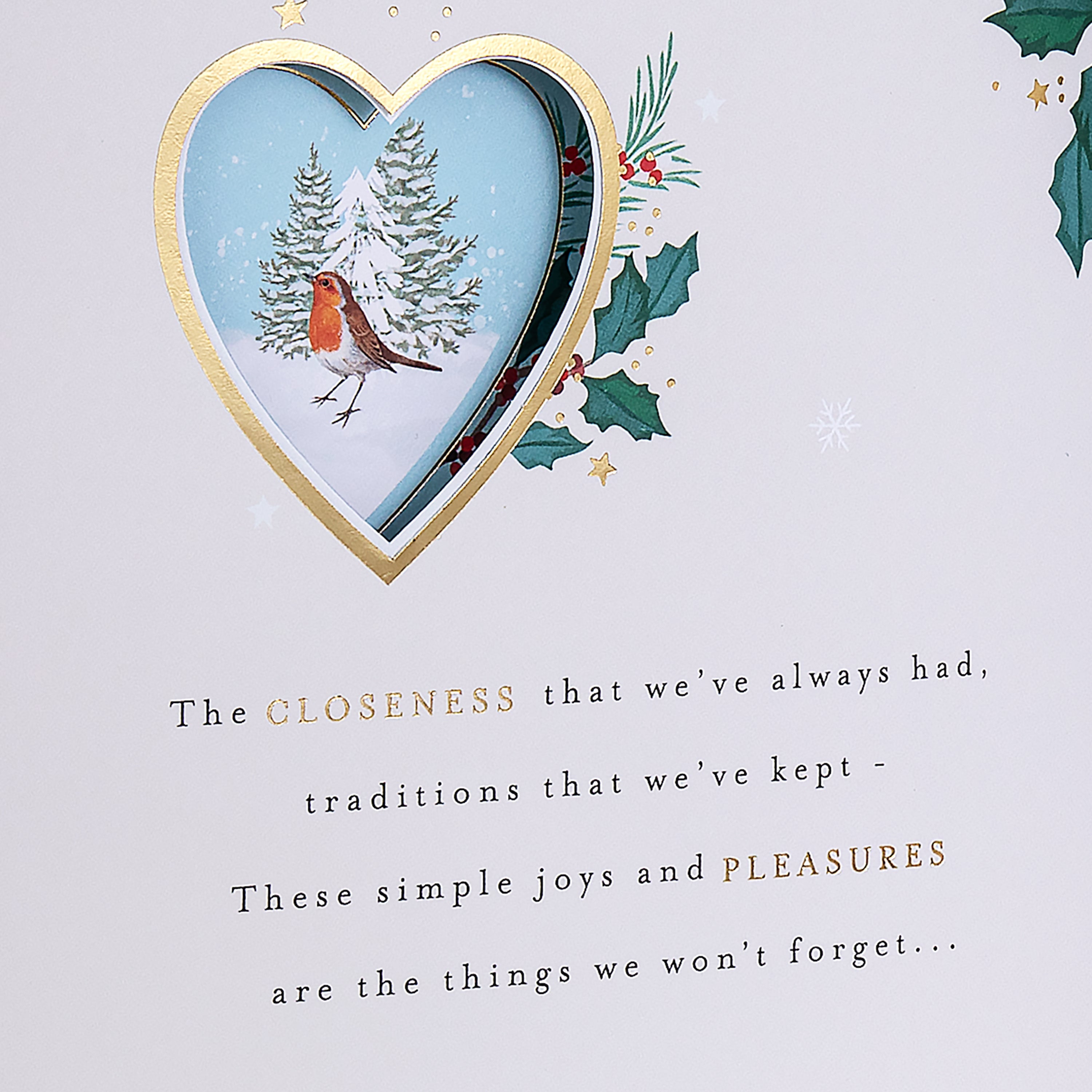 Printed on high-quality board with die-cut edges, this lovely card features an illustrated design of a robin perched amongst snow covered trees against a light blue background, framing the first part of a heartfelt seasonal message. Embossed details, gold foil paper star 'gems' and gold foil highlights, along with a classic red and white twine attachment, complete the design, with the gold foil highlights continuing across the 6-page paper insert, along with die-cut details and the remainder of the message. The card comes complete with a co-ordinating bright red, Hallmark branded envelope.