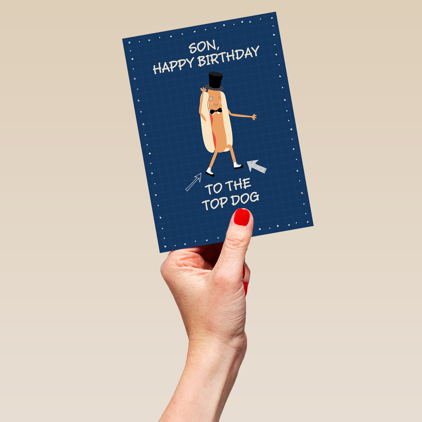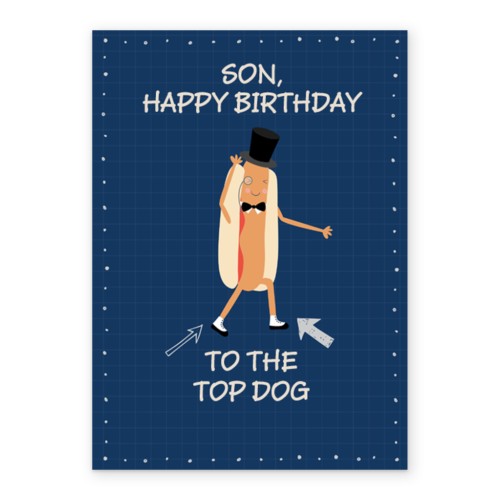 Show them you care with a personalised editable funny hot dog birthday card for son from Hallmark. Our birthday cards are printed on premium quality, FSC®-certified card & delivered nationwide. This card is available as standard 12cm by 16.7cm and large 15.5cm by 21.6cm.