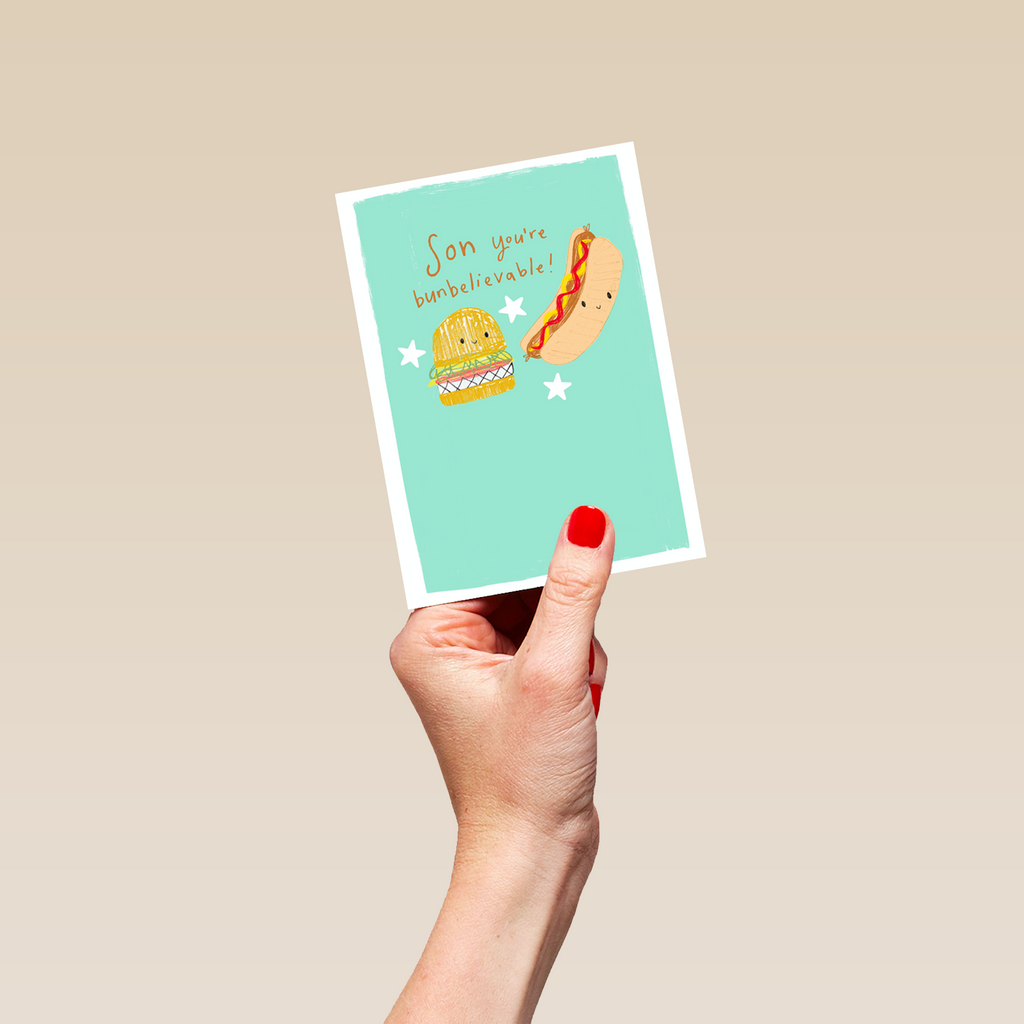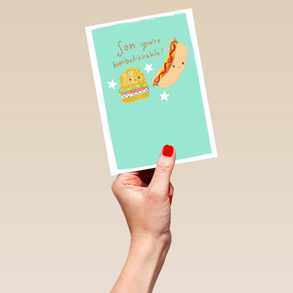 Show them you care with a personalised son funny hotdog burger card from Hallmark. Our son cards are printed on premium quality, FSC®-certified card & delivered nationwide. This card is available as standard 12cm by 16.7cm and large 15.5cm by 21.6cm.