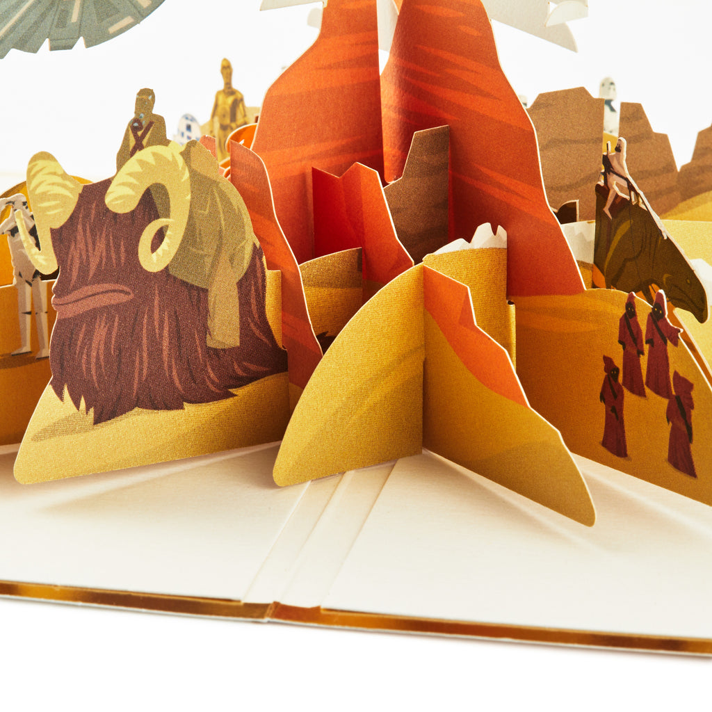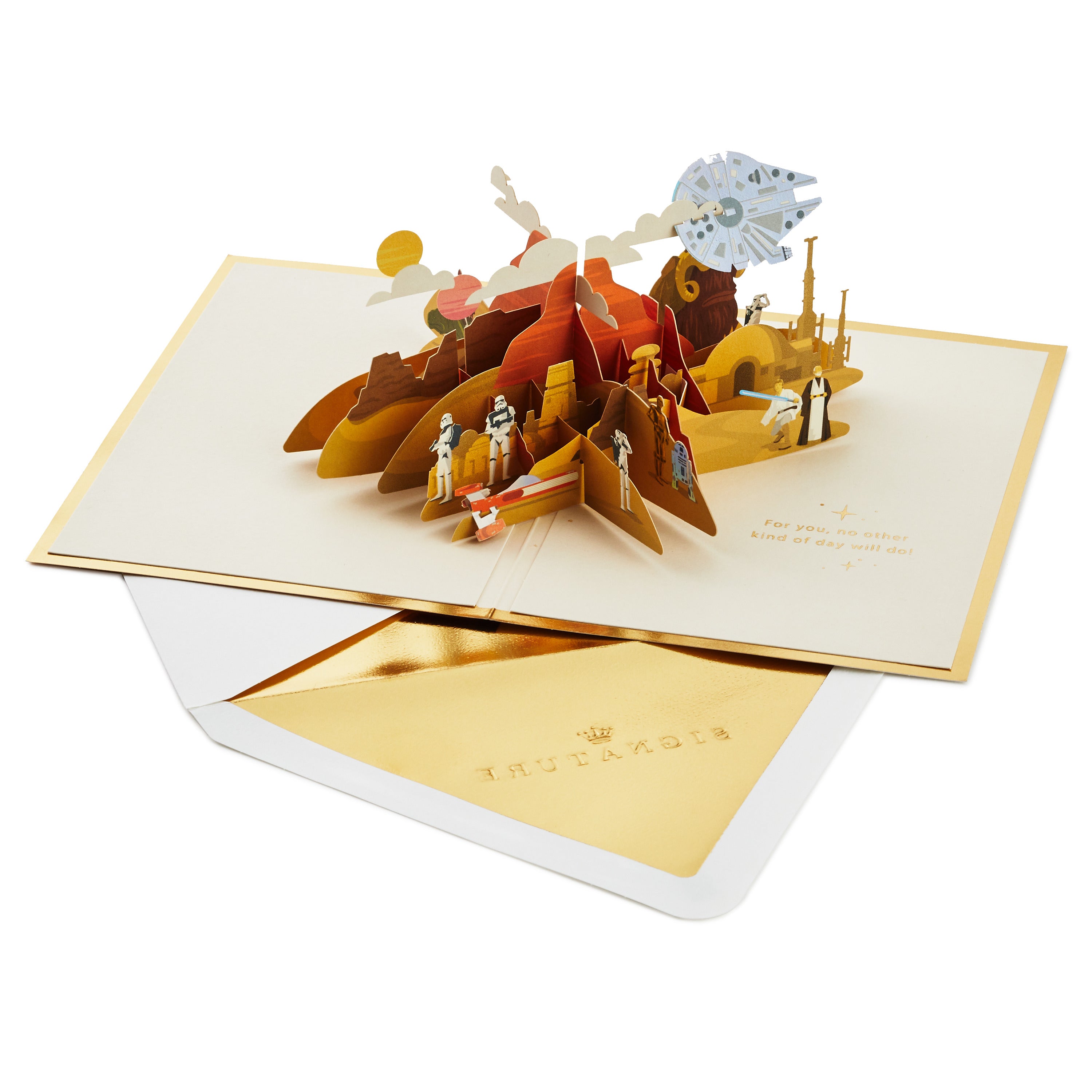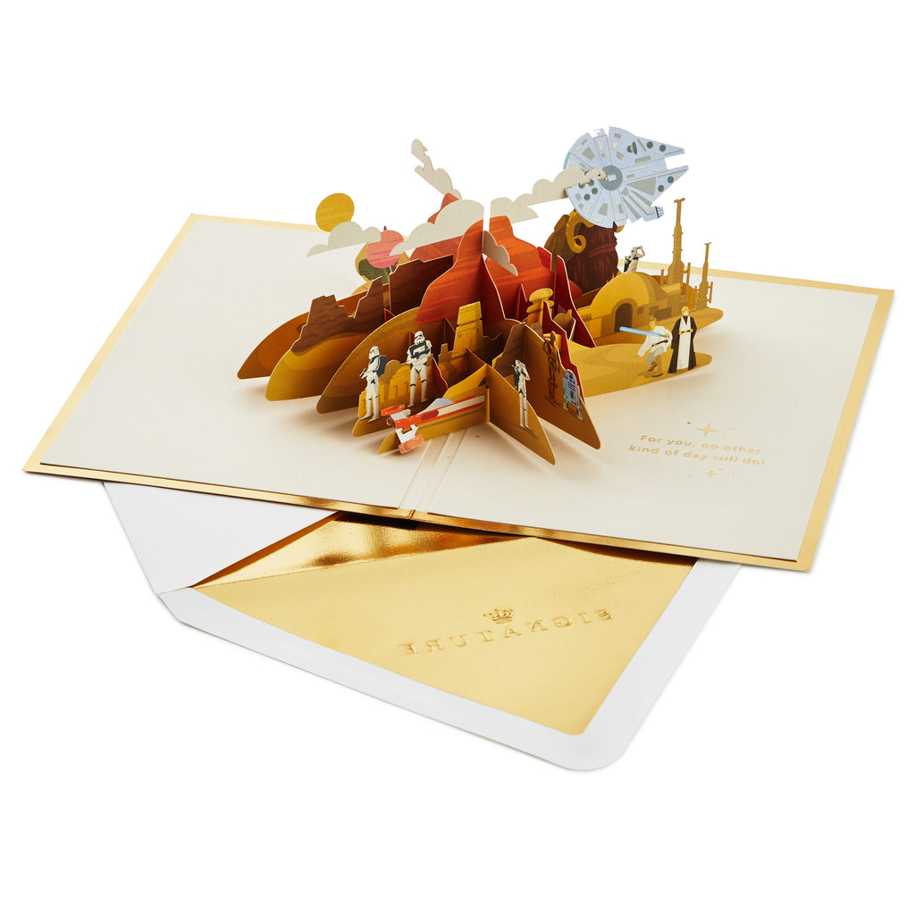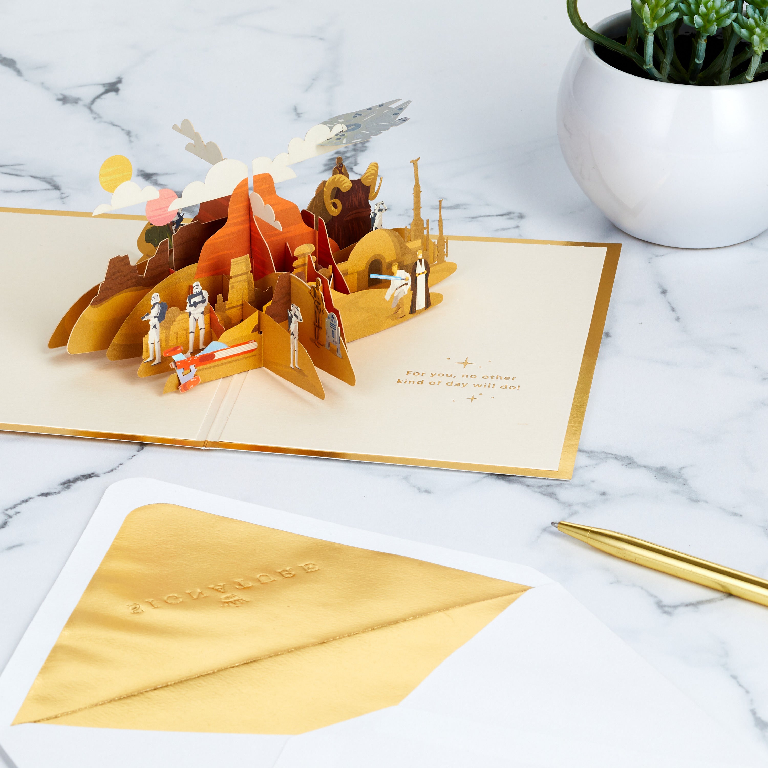 Printed on high-quality board, simply open this card up to reveal a 3D and pop-up display of the Mos Eisley spaceport on planet Tatooine from Star Wars™, with Luke Skywalker and his landspeeder, Obi Wan Kenobi, C-3PO, R2-D2, Stormtroopers, Jawas and a Tusken Raider riding a Bantha, and the Millennium Falcon flying overhead. This scene is from the same setting as the "These aren't the droids you're looking for" scene. This card features the message 'Adventure & fun' on the front, die-cut details, metallic gold foil and holographic foil details, and comes complete with a co-ordinating Hallmark Signature branded, white envelope with a gold foil lining.