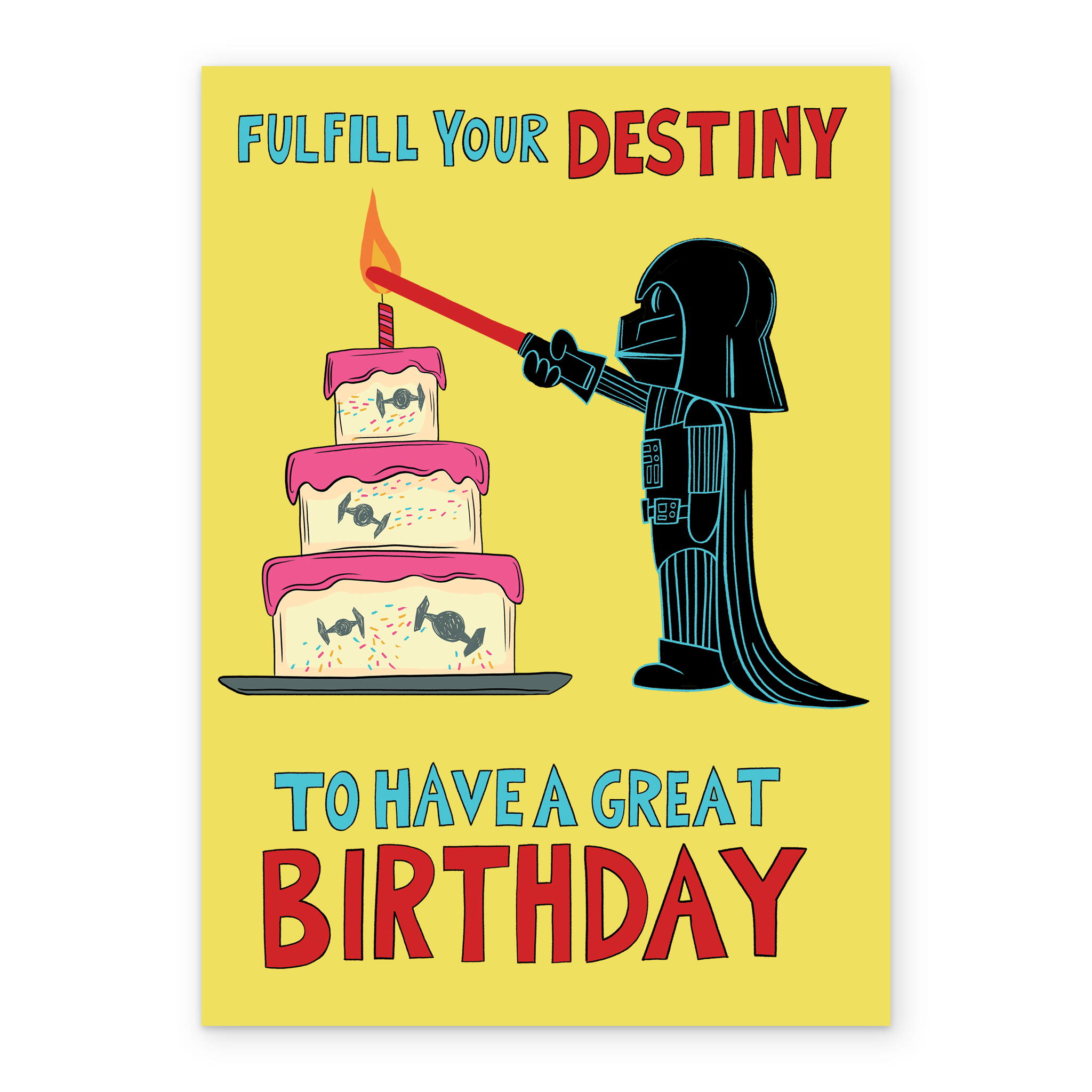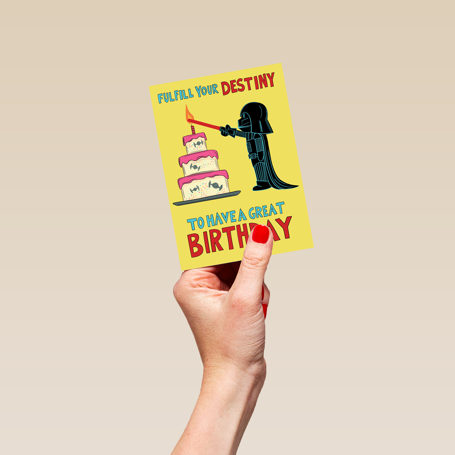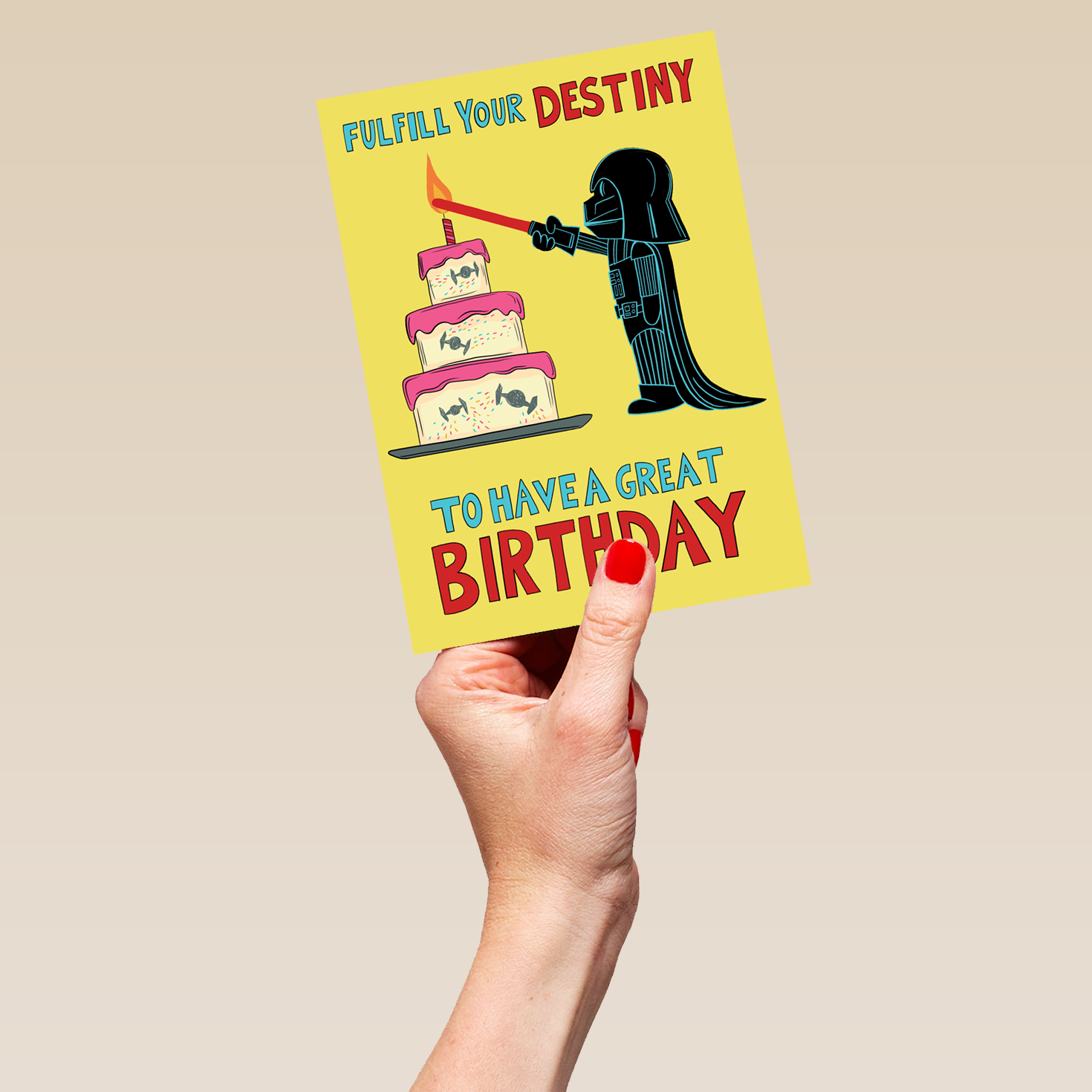 Printed on premium-quality board, this card features a funny Star Wars™ design with Darth Vader with a birthday cake, with the message ‘Fulfill your destiny to have a great birthday', and comes complete with a co-ordinating white envelope.