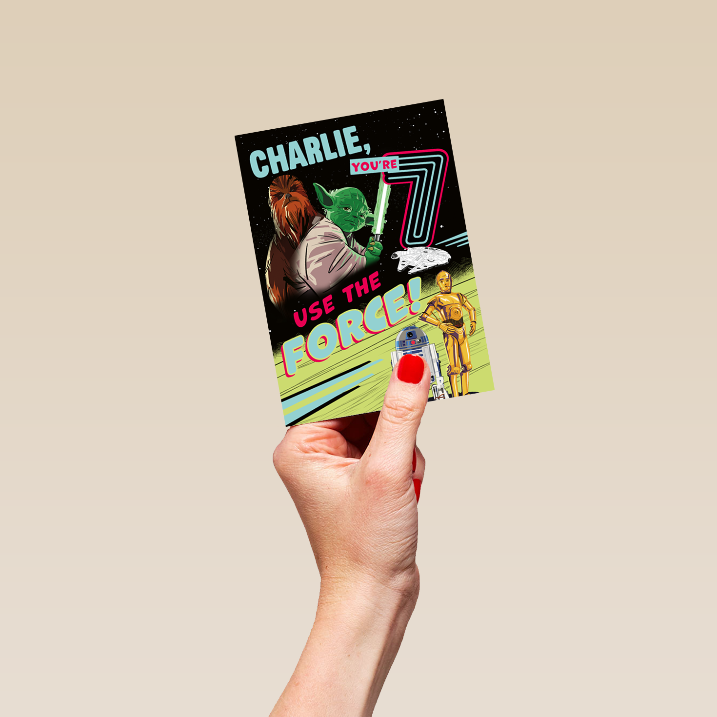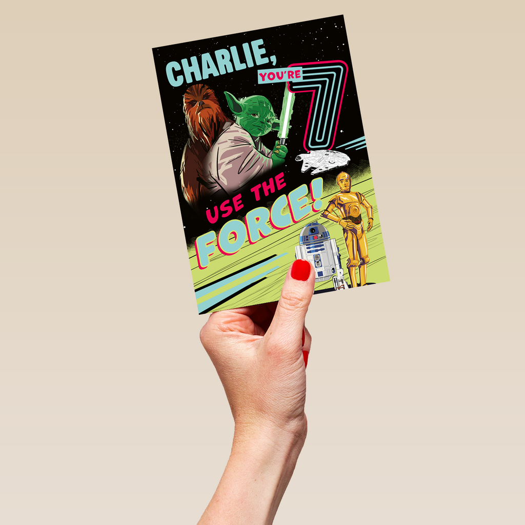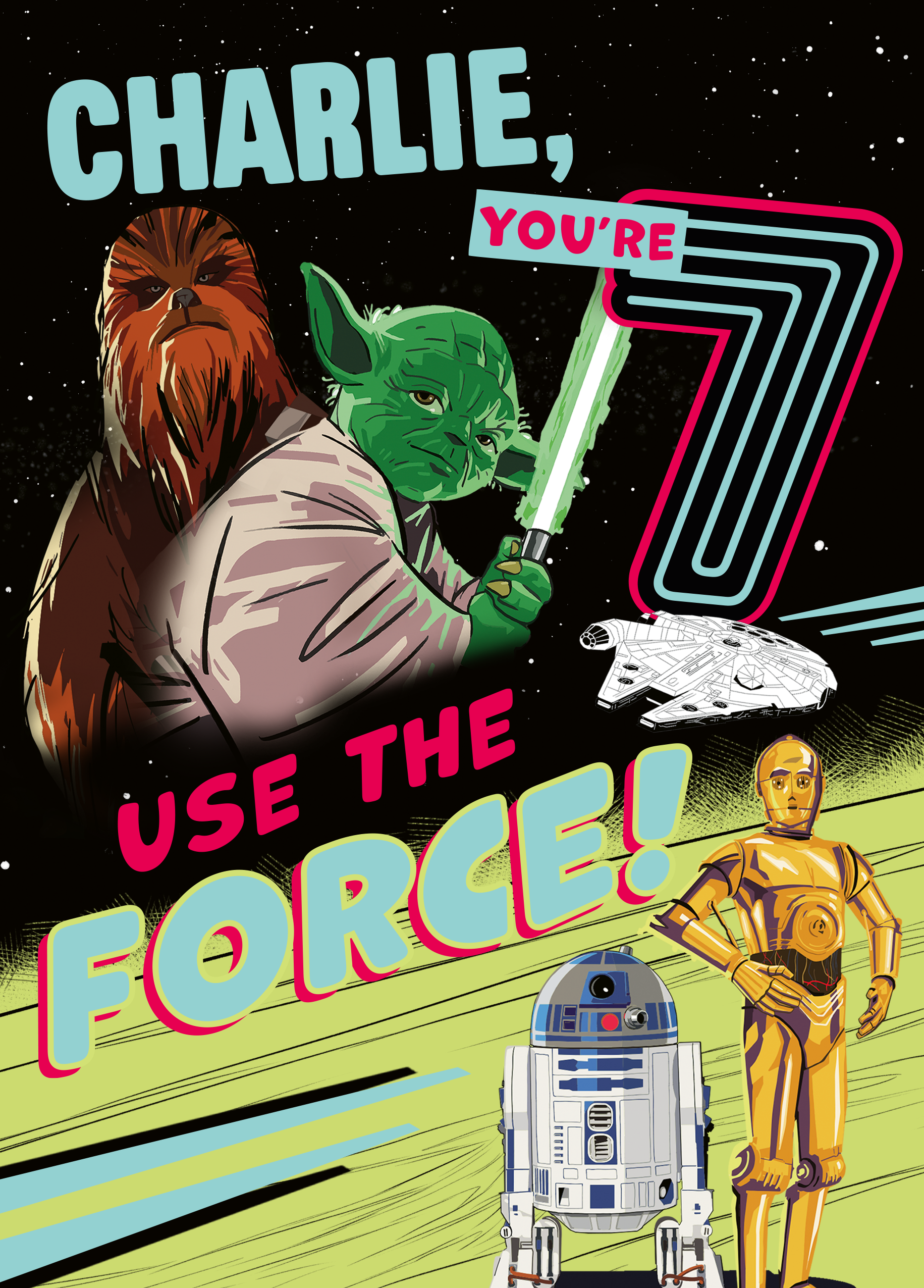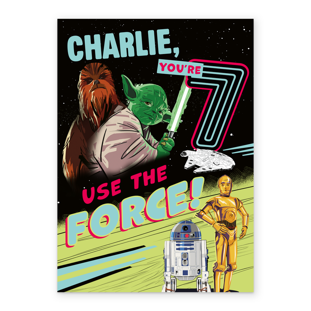 Printed on premium-quality board, this card features Star Wars™ Rebels Chewbacca, Yoda, R2-D2, C-3PO and the ship that made the Kessel run in less than 12 parsecs, the Millennium Falcon, and retro styled colourful text on a space scene background, with the message 'You're 7 Use The Force!', space to personalise a name, and comes complete with a co-ordinating white envelope.