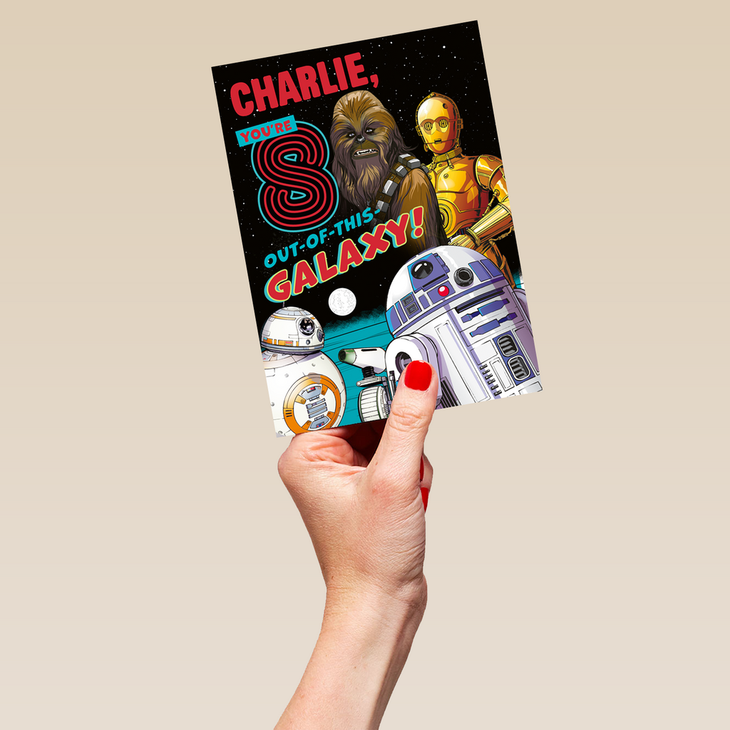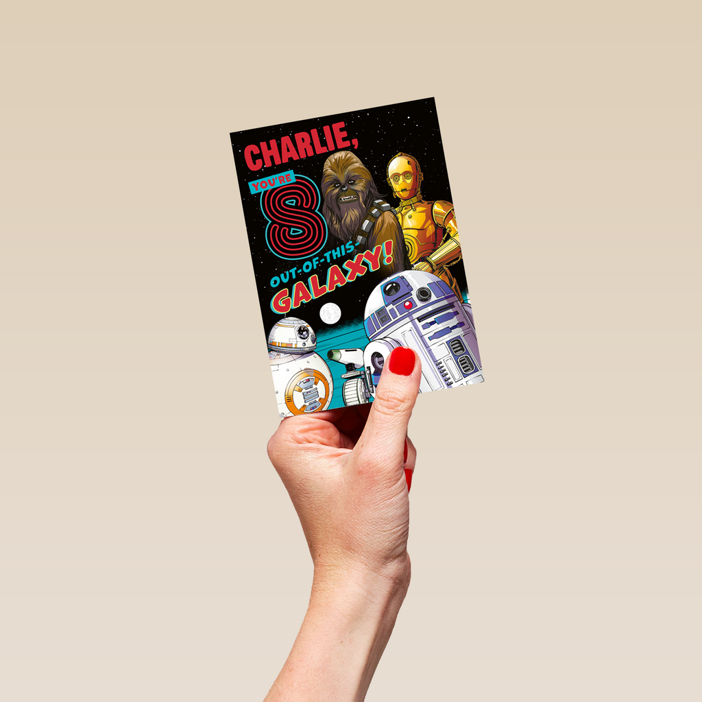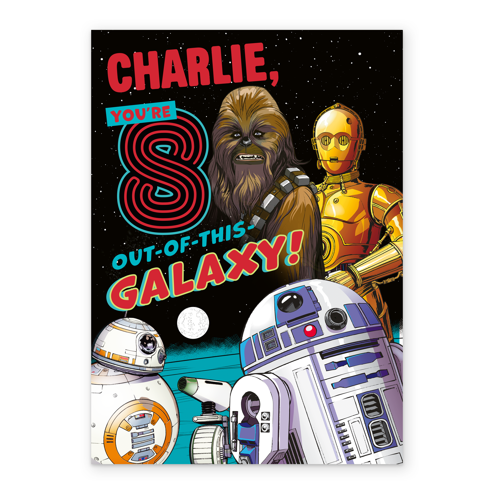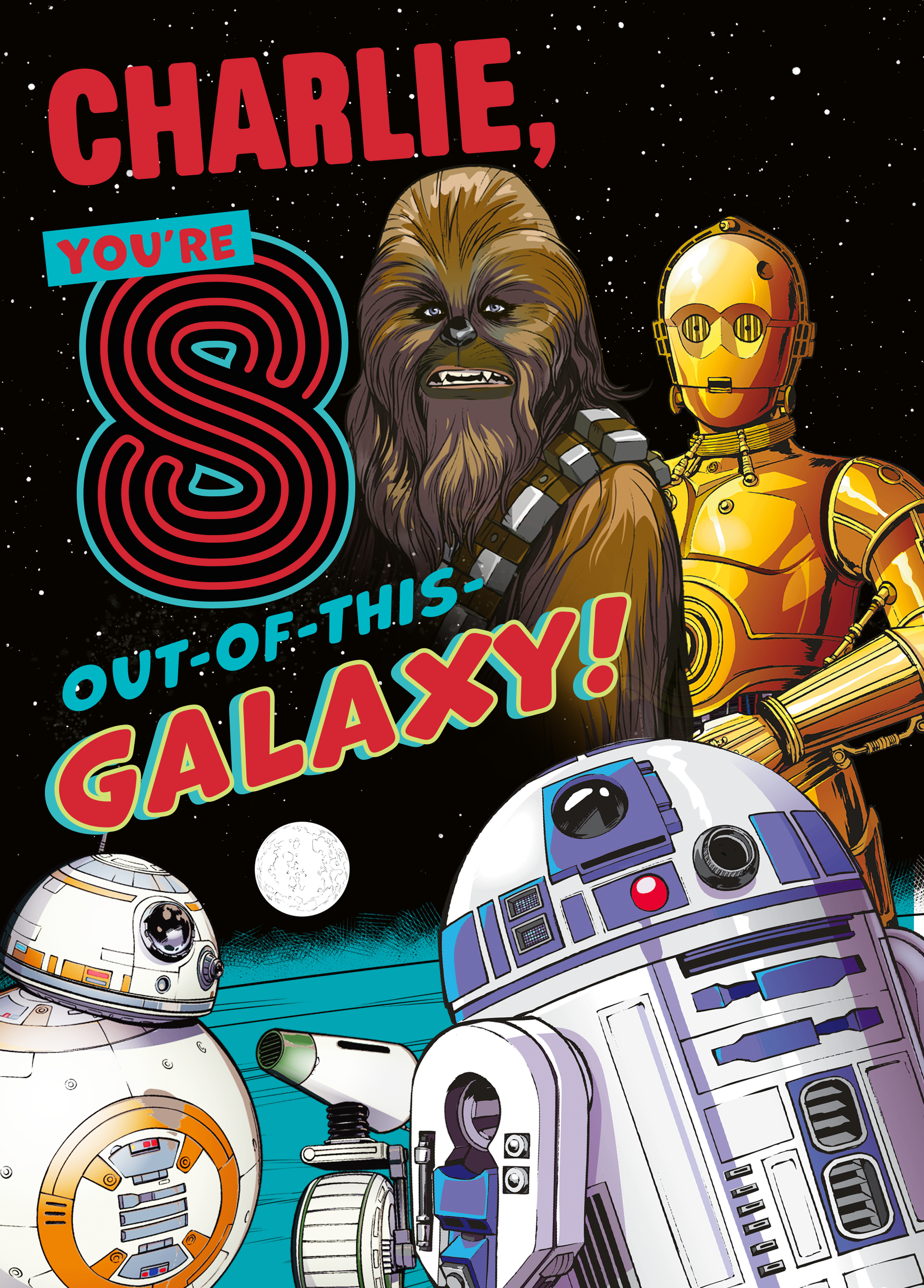 Printed on premium-quality board, this card features Star Wars™ Rebels Chewbacca, C-3PO, BB-8, D-0 and R2-D2, and retro styled colourful text on a space scene background, with the message 'You're 8 Out-Of-This-Galaxy!', space to personalise a name, and comes complete with a co-ordinating white envelope.