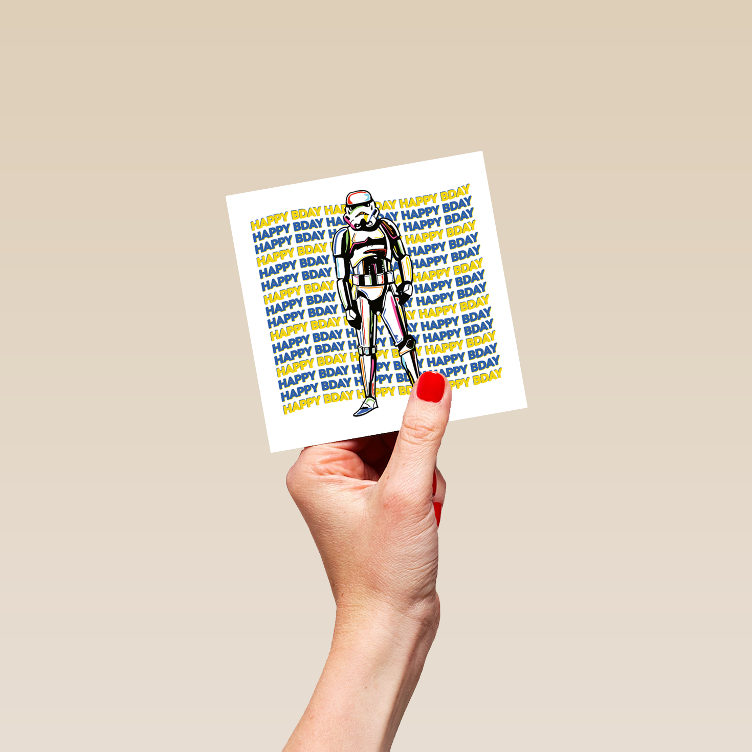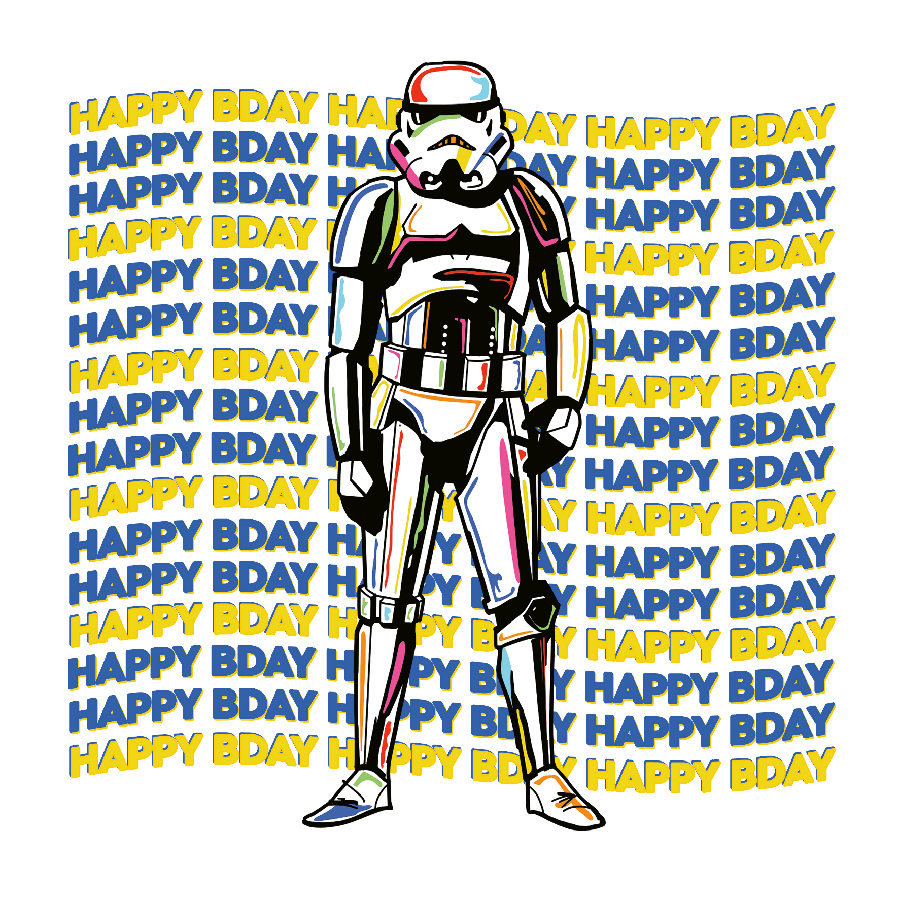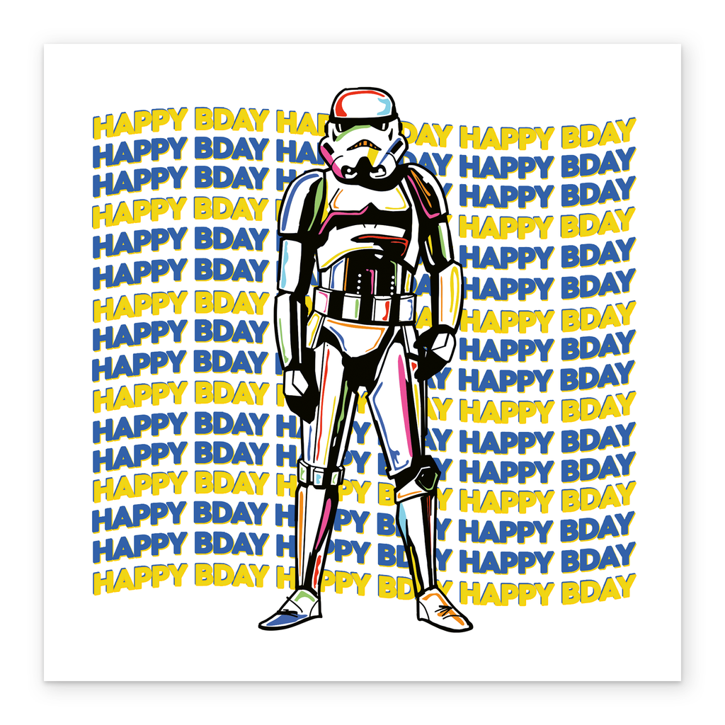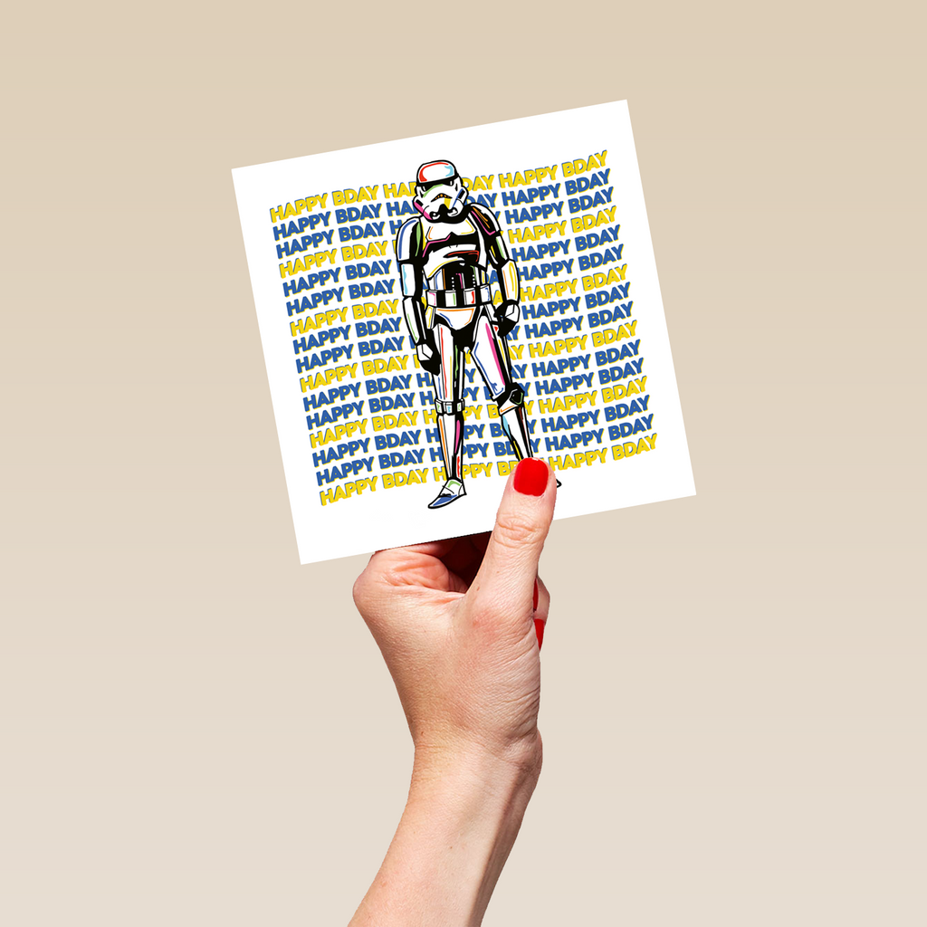 Printed on premium-quality board, this card features a Stormtrooper with a happy birthday message repeated behind them, with the message 'HAPPY BDAY', and comes complete with a co-ordinating white envelope.