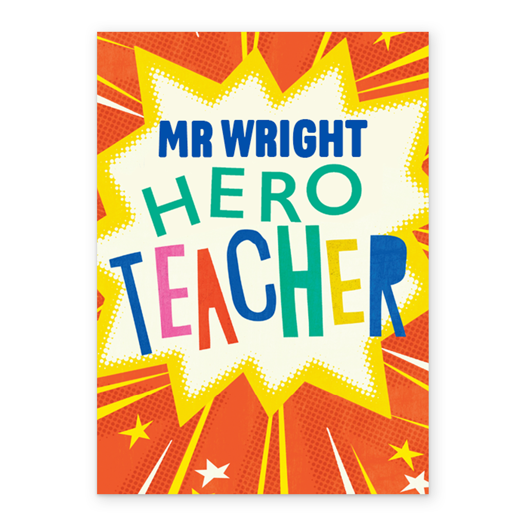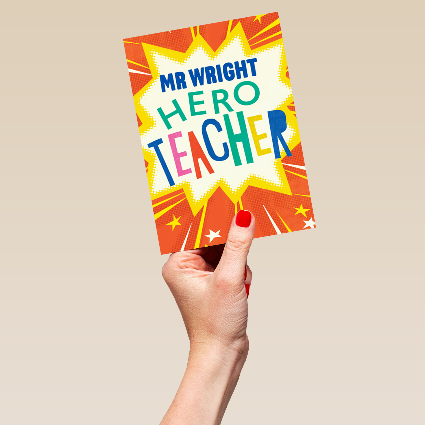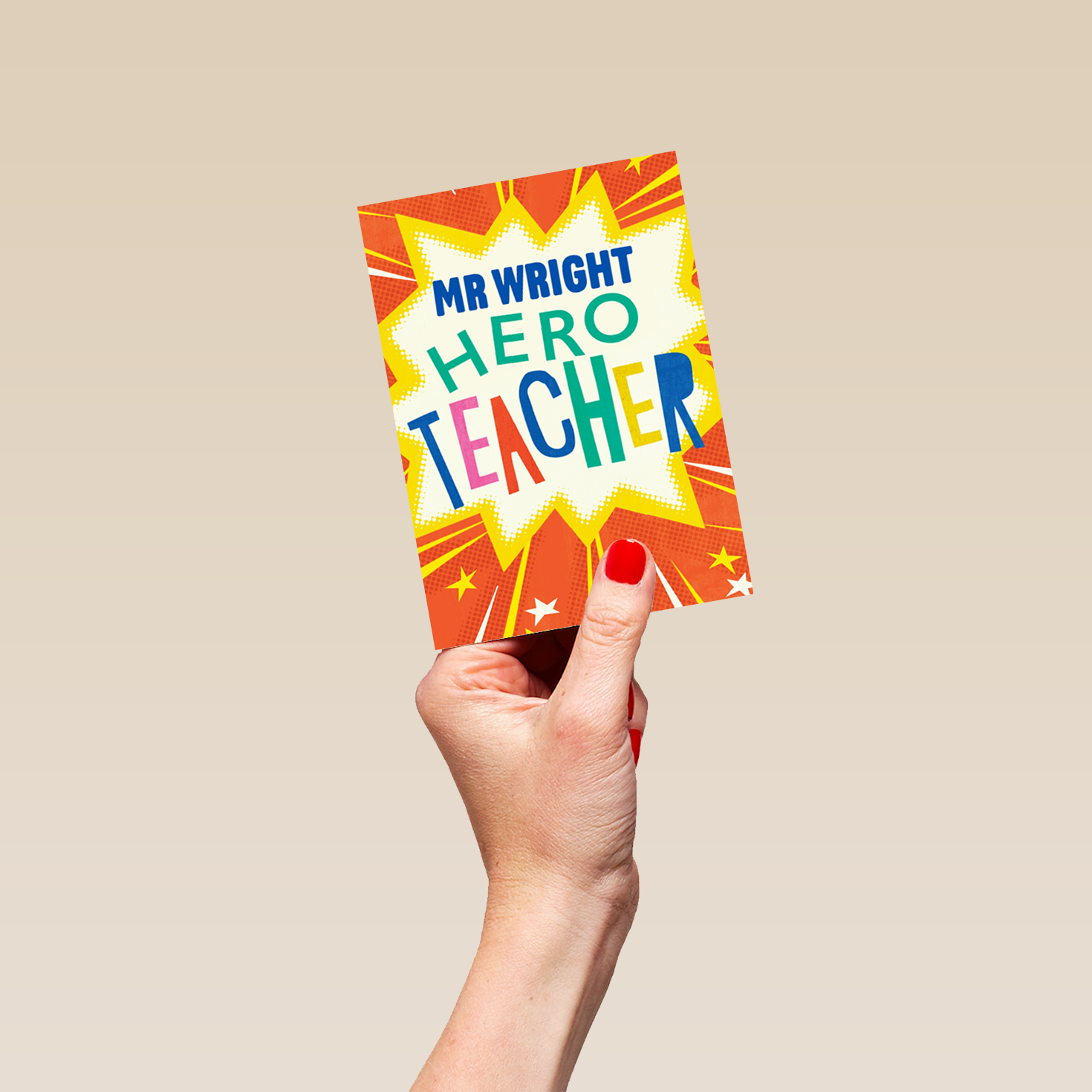 Show them you care with a personalised hero teacher thank you card from Hallmark. Our thank you cards are printed on premium quality, FSC®-certified card & delivered nationwide. This card is available as standard 12cm by 16.7cm and large 15.5cm by 21.6cm.