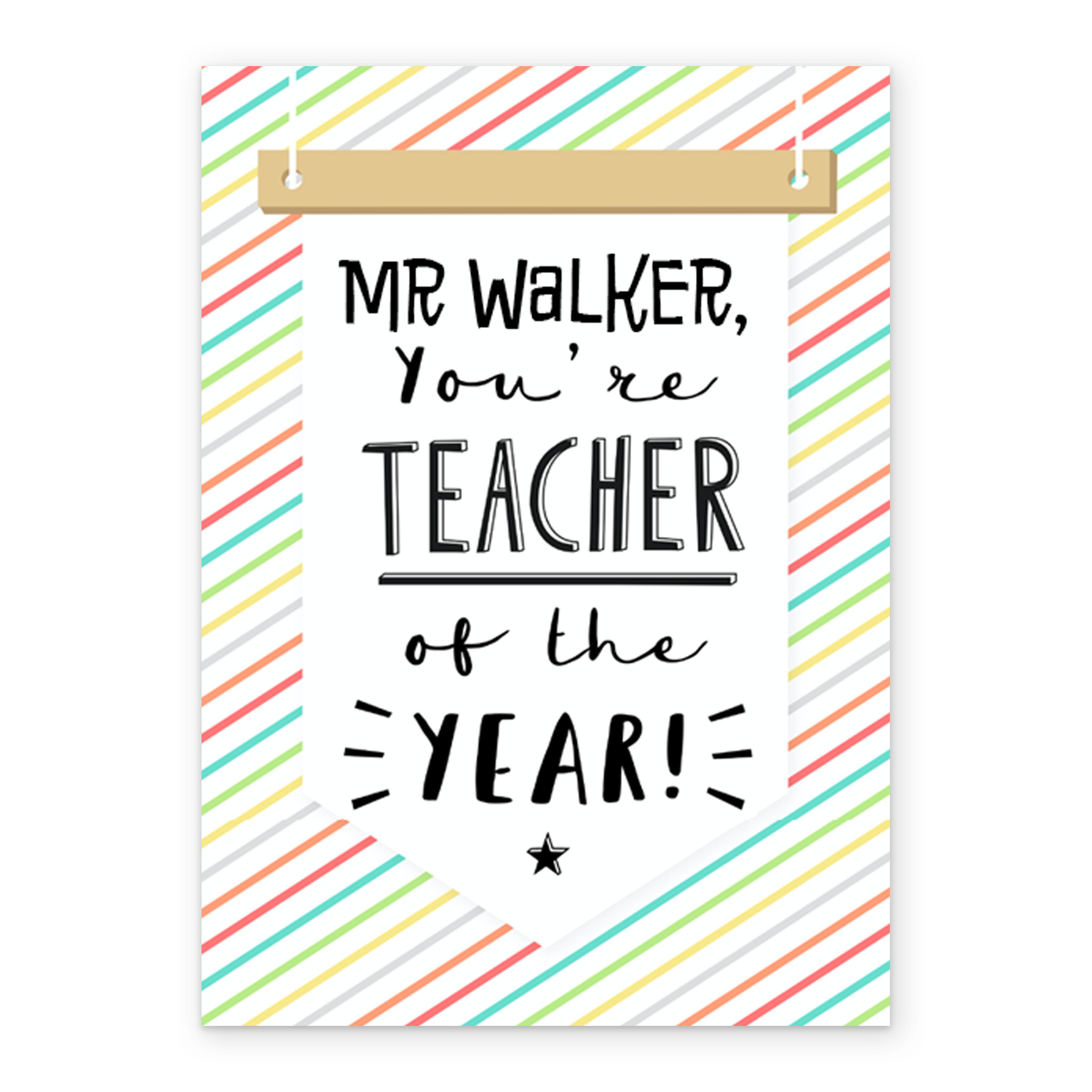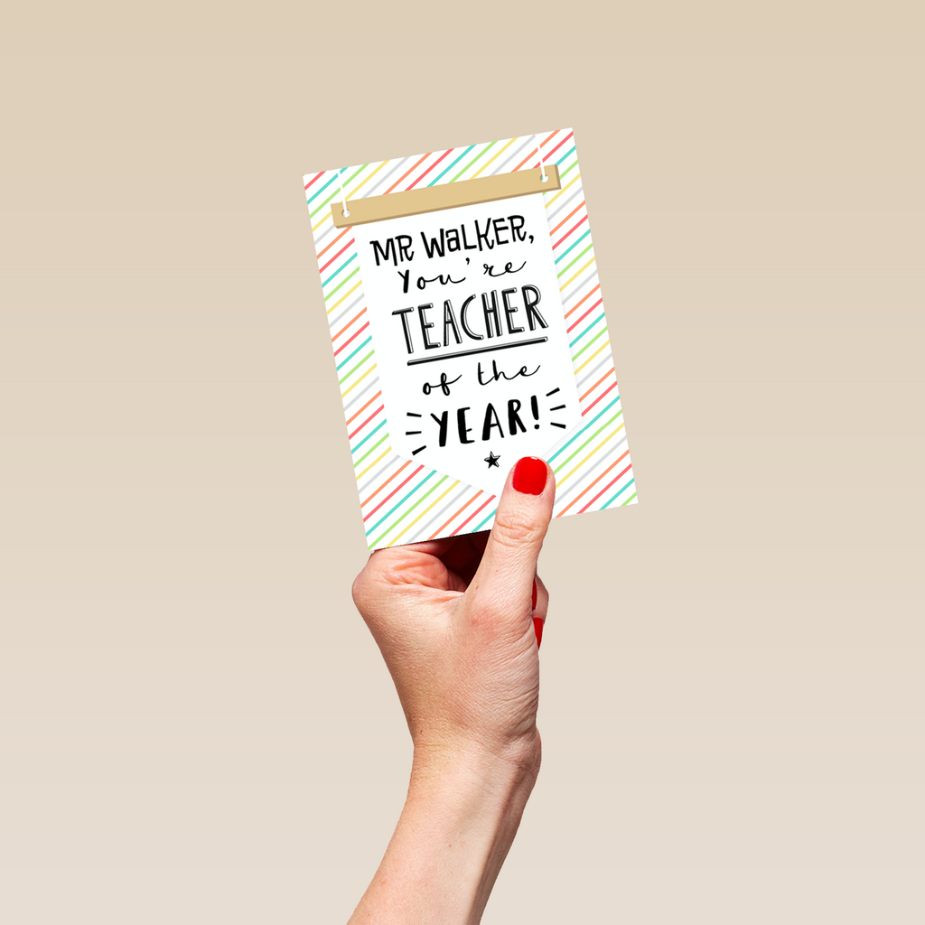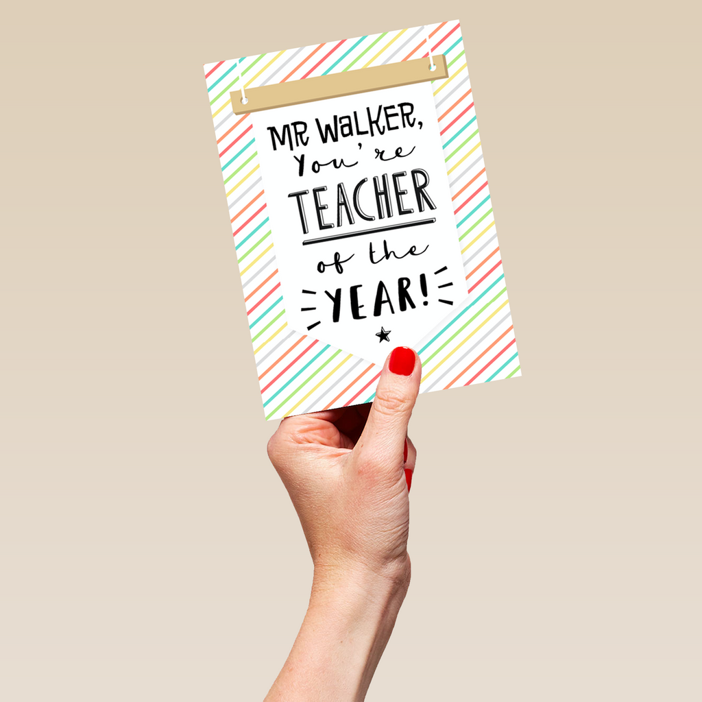 Show them you care with a personalised teacher of the year card from Hallmark. Our teacher cards are printed on premium quality, FSC®-certified card & delivered nationwide. This card is available as standard 12cm by 16.7cm and large 15.5cm by 21.6cm.