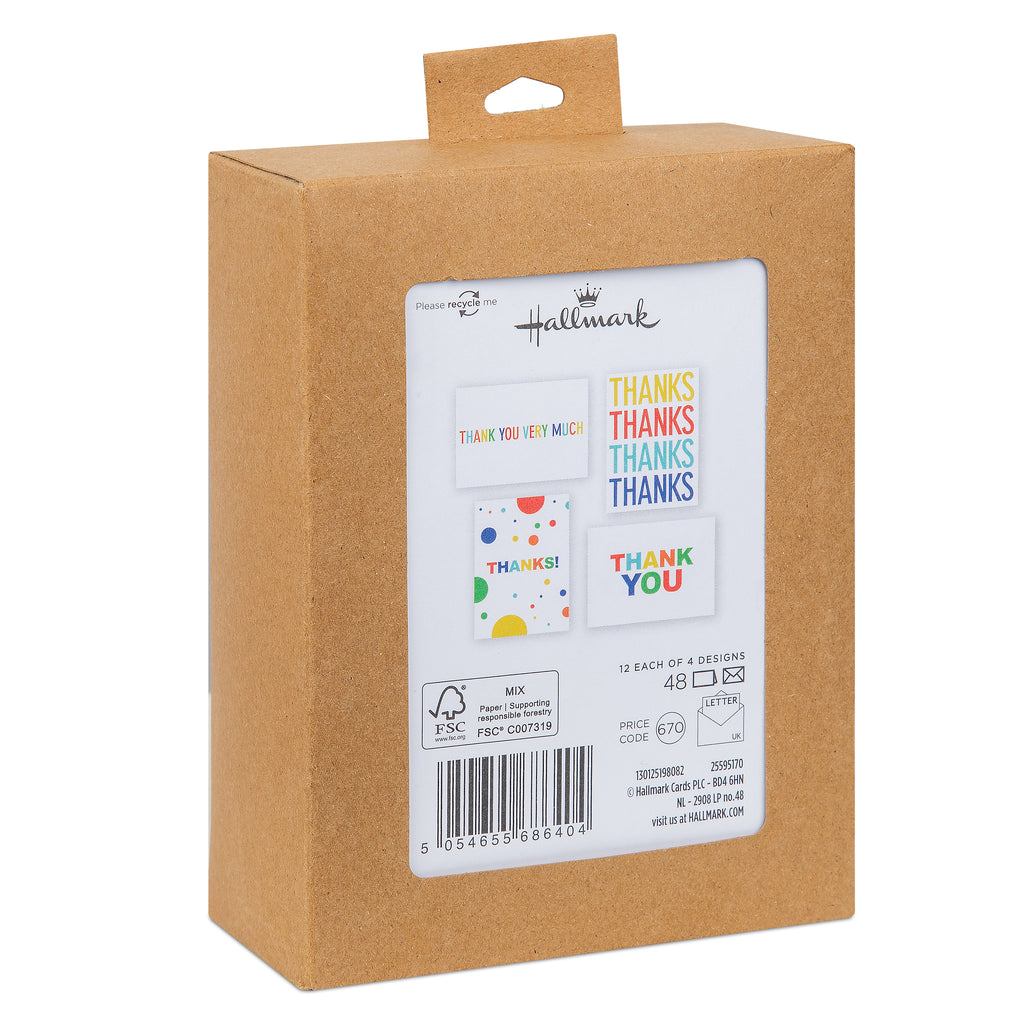 Printed on high-quality board, this pack of 48 Thank You Cards contains 4 designs (12 of each design). Each card comes complete with a co-ordinating Hallmark branded, white envelope.
