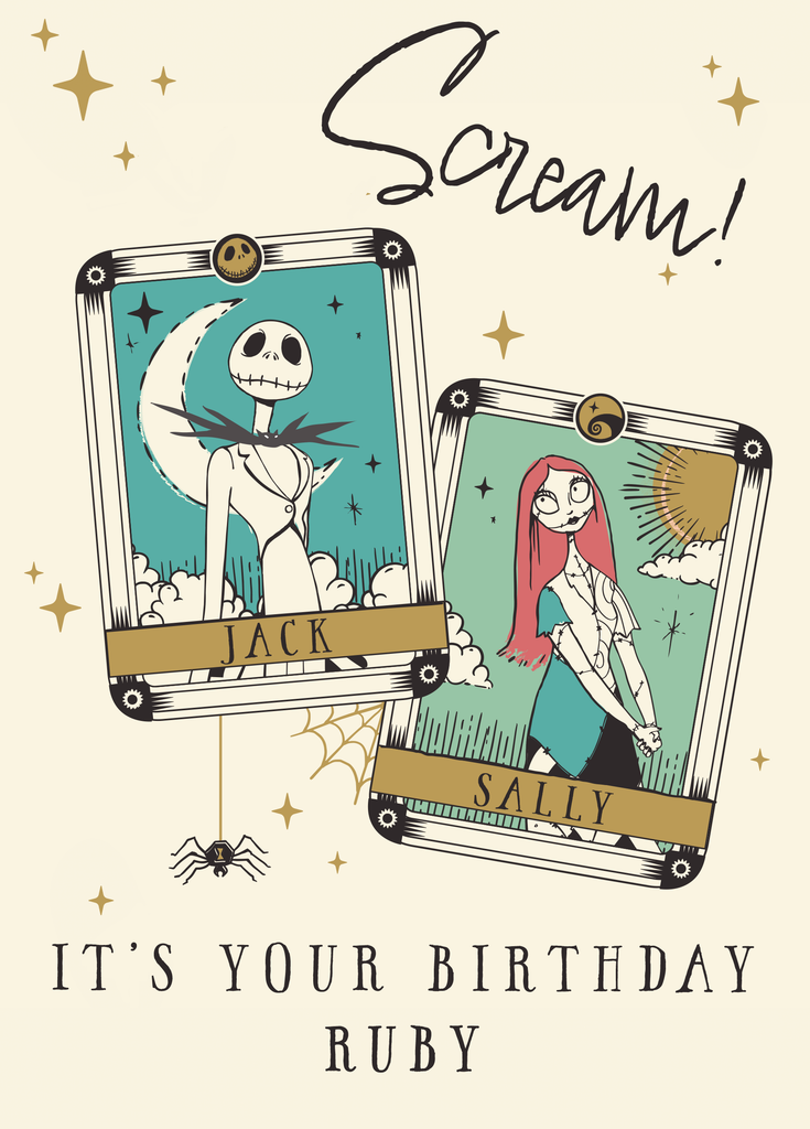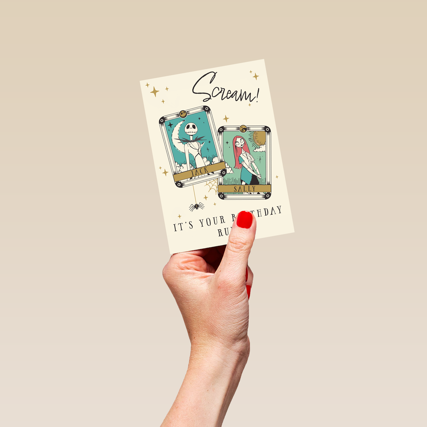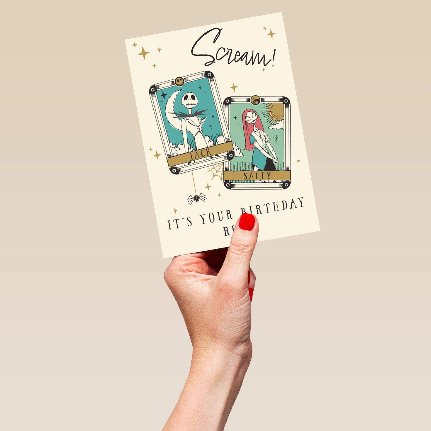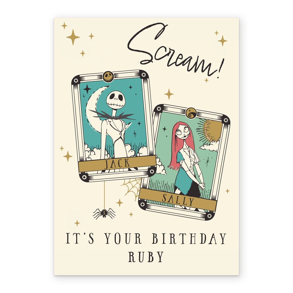 Printed on premium-quality board, this card features Jack Skellington and Sally on tarot style cards, with the message 'Scream! It's your birthday', space to personalise a name, and comes complete with a co-ordinating white envelope.