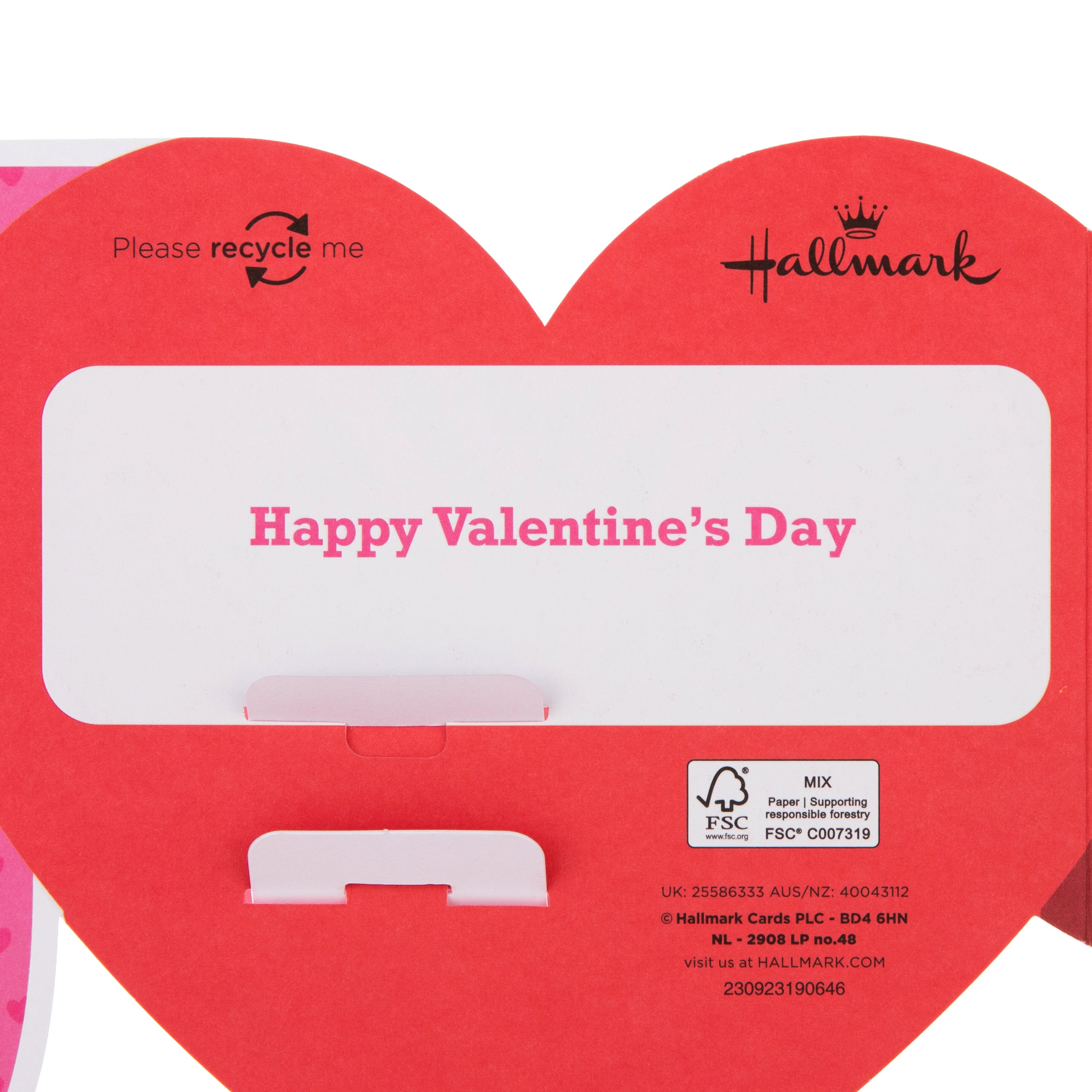 Printed on high-quality board, this card folds-out into a banner design, features metallic gold foil details, a 3D pop-out element, a pink and red fold-out design, and comes complete with a co-ordinating Hallmark branded, red envelope.
