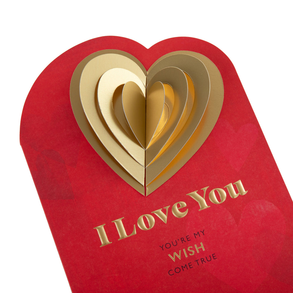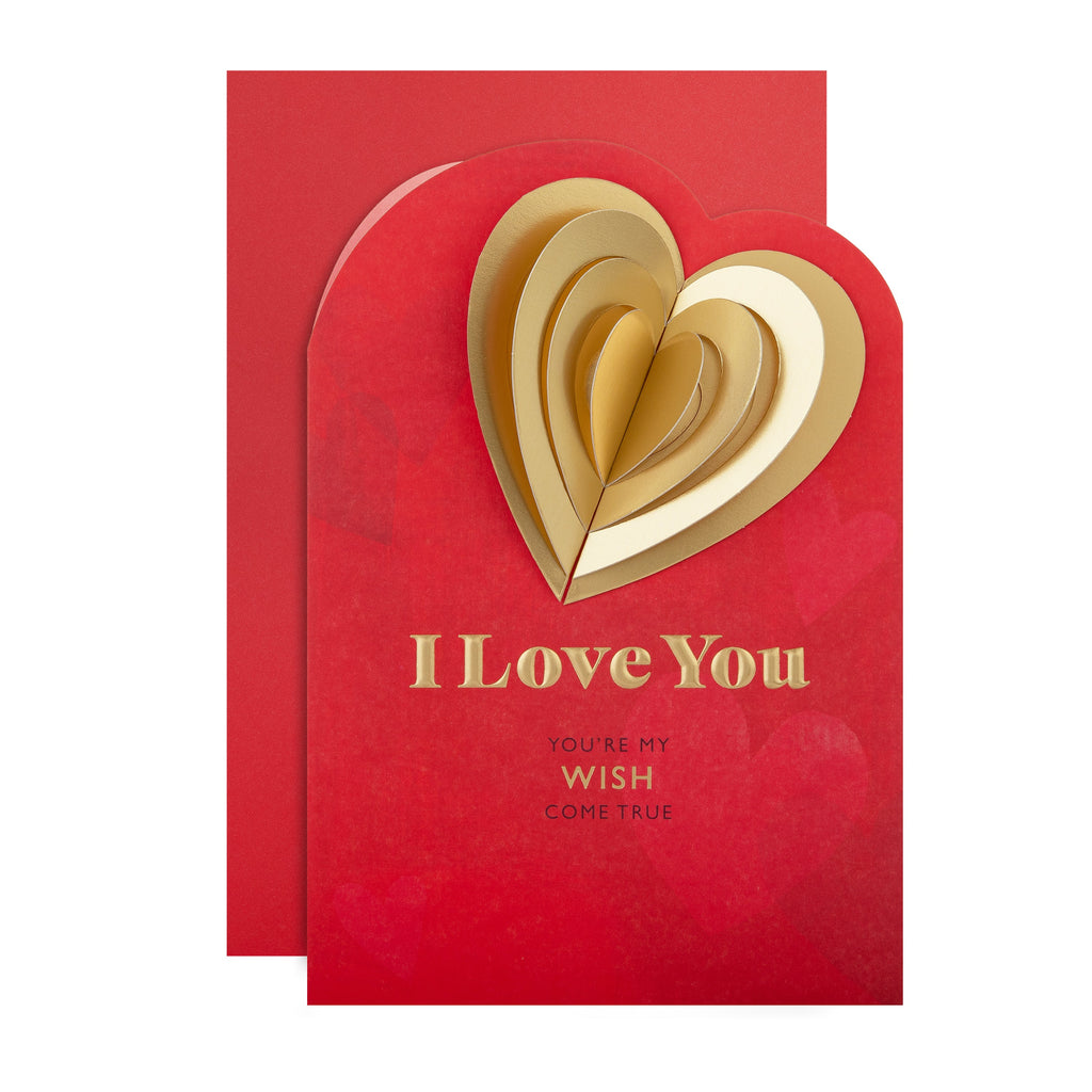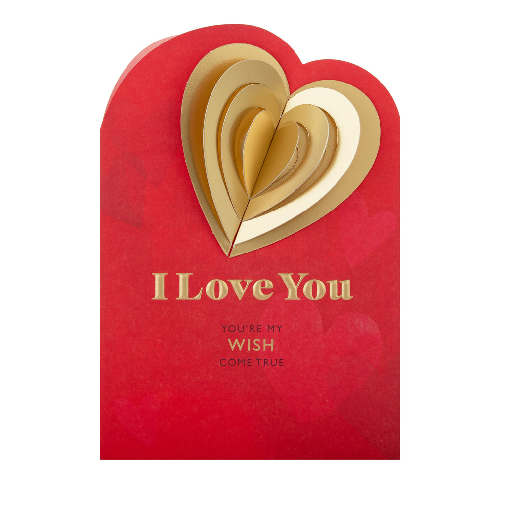 Printed on high-quality board, this Valentines card has a red with gold heart design, and features a die-cut shaped design, embossed elements, metallic gold foil details, die-cut 3D fold out heart attachment, and the message 'I Love You. You're my wish come true' on the front. This card comes complete with a co-ordinating Hallmark branded, red envelope.