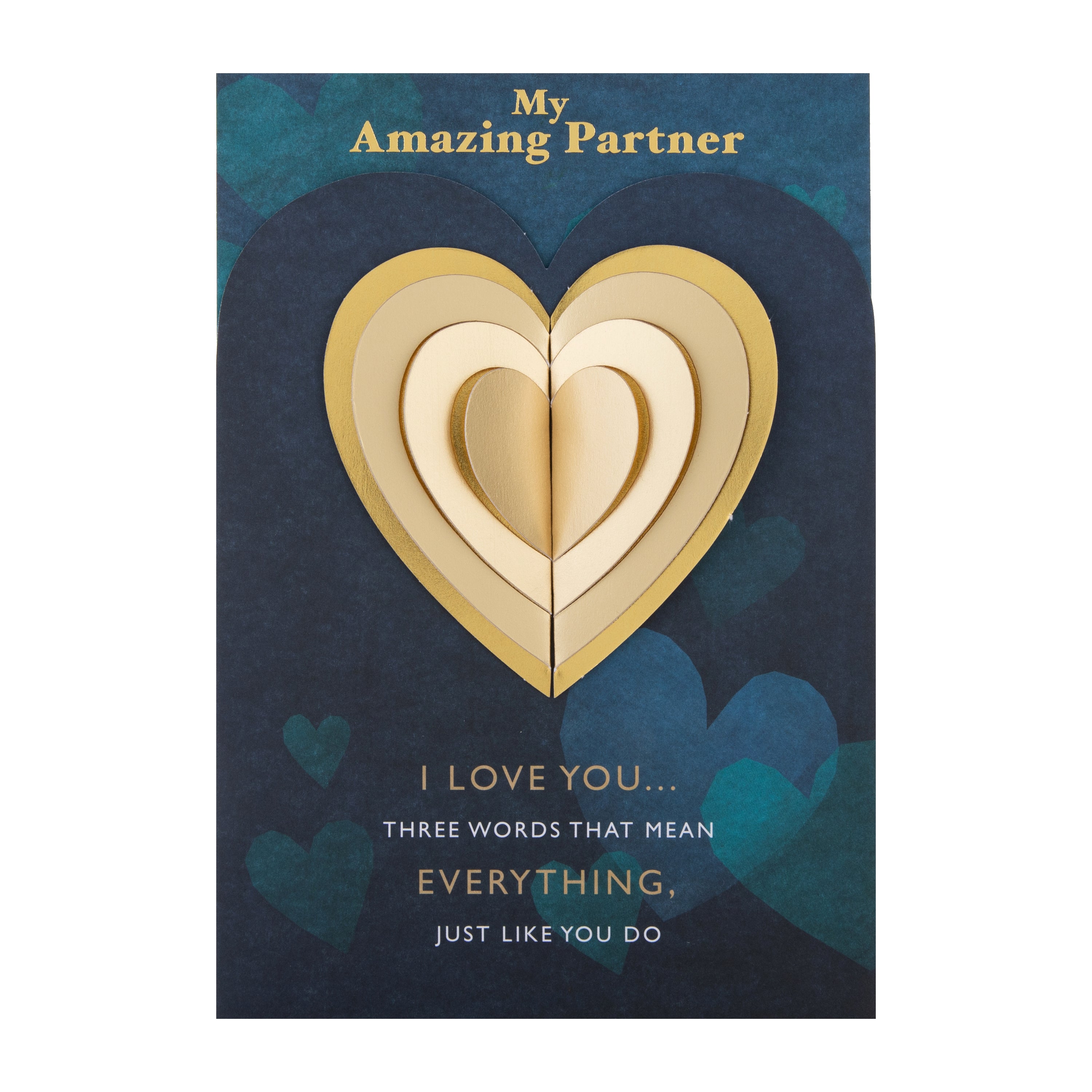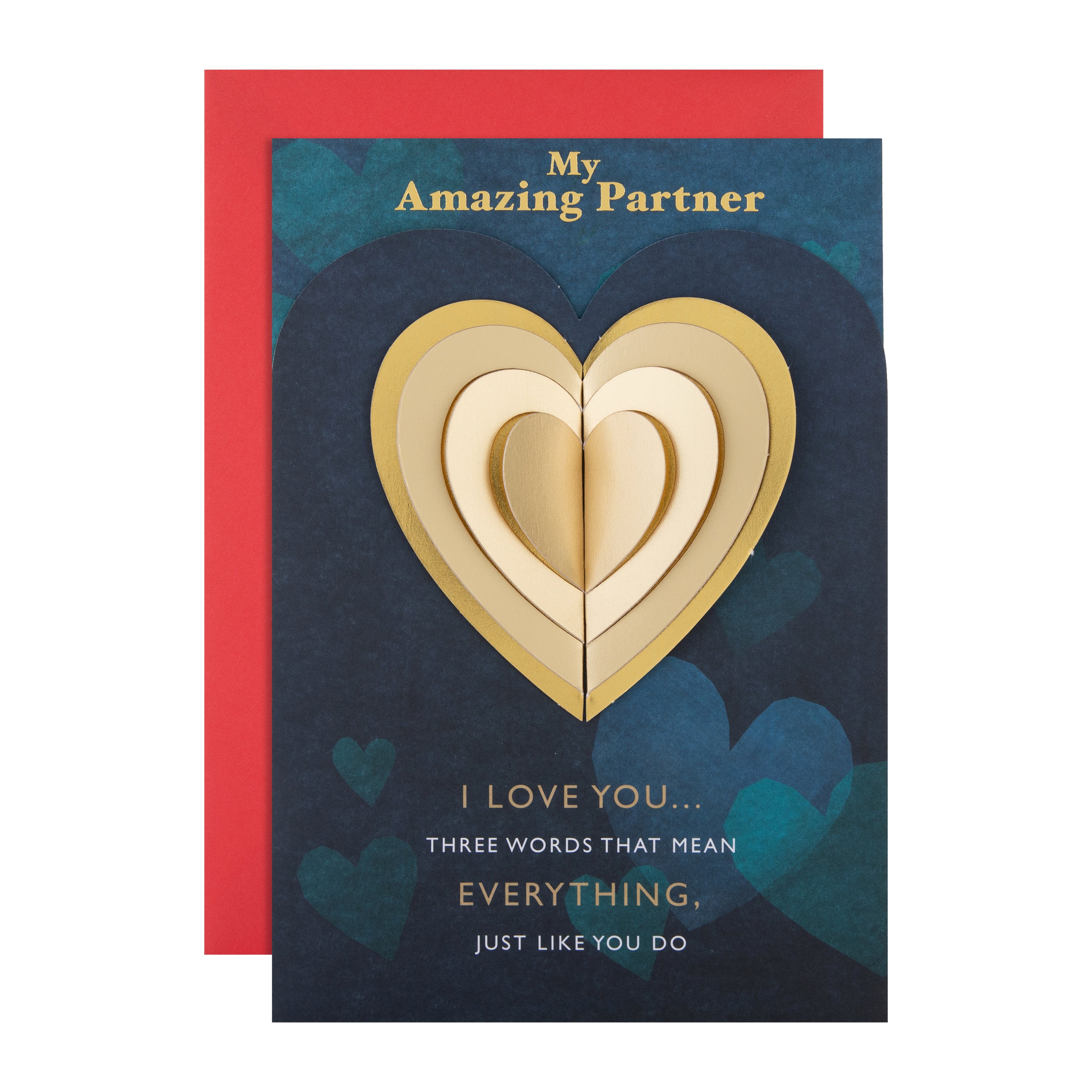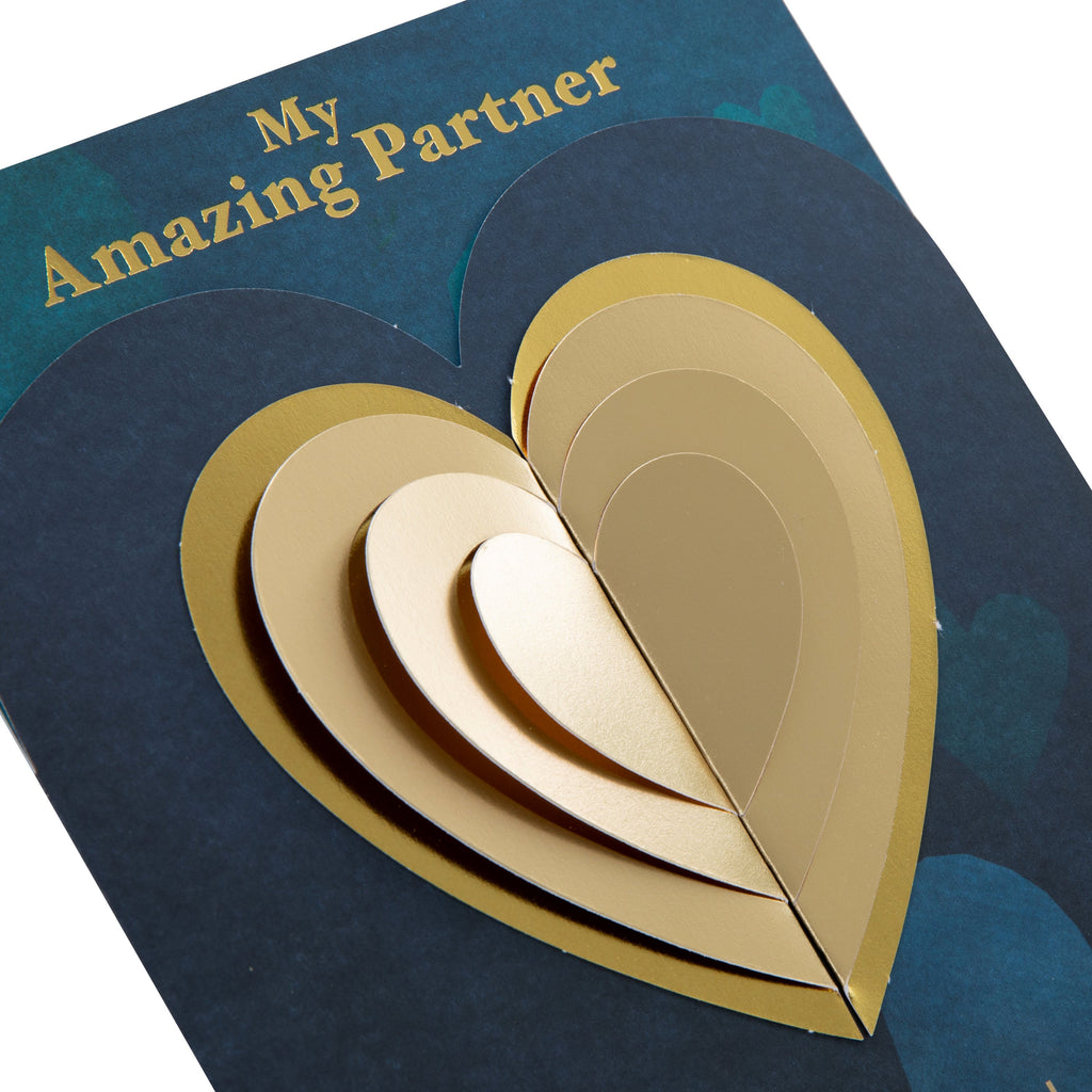 Printed on high-quality board, this Valentines card has a blue with gold heart design, and features metallic gold foil details, pearlescent gold foil details, die-cut 3D fold out heart attachment, die-cut shaped card front, and the message 'My Amazing Partner, I love you… Three words that mean everything, just like you do' on the front. This card comes complete with a co-ordinating Hallmark branded, red envelope.
