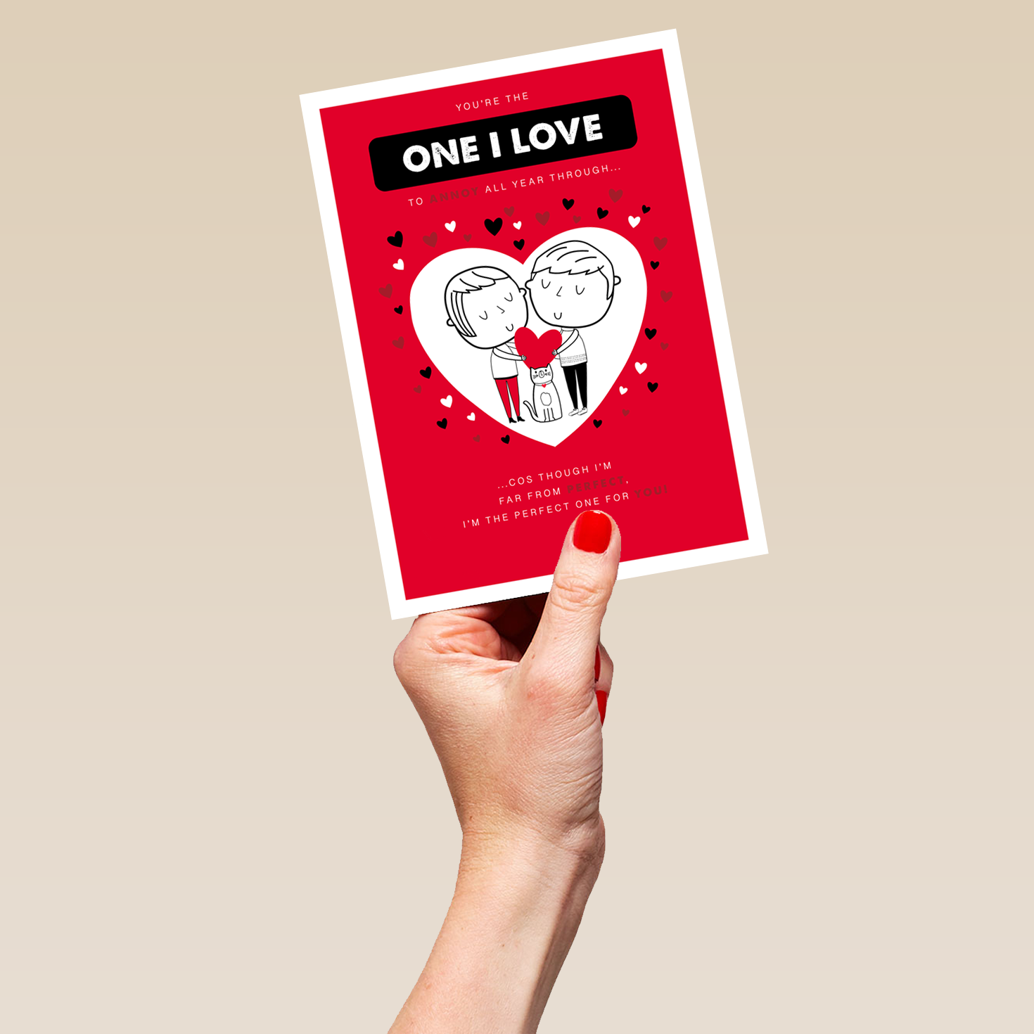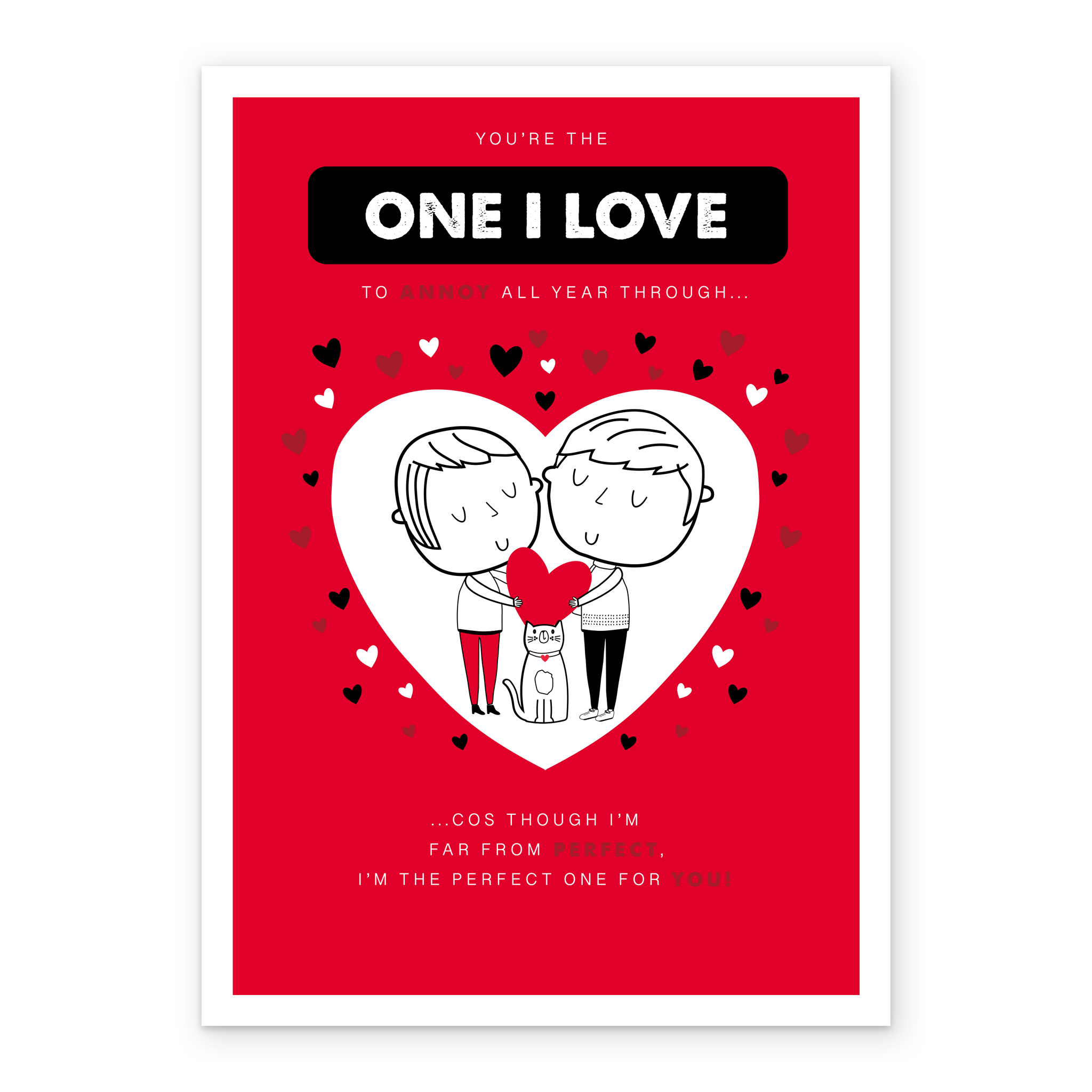 Printed on premium-quality board, this card features a cute cartoon couple, with a cat between them, holding a red heart, framed by a large heart shape on a red background with small red, black and white hearts around the edge and red and white lettering, with the message 'You're the one I love to annoy all year through... ...cos though I'm far from perfect, I'm the perfect one for you!', and comes complete with a co-ordinating white envelope.