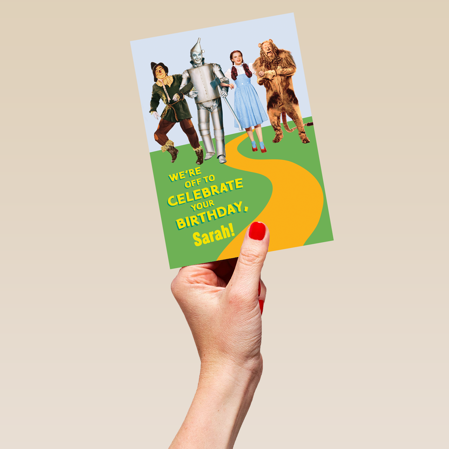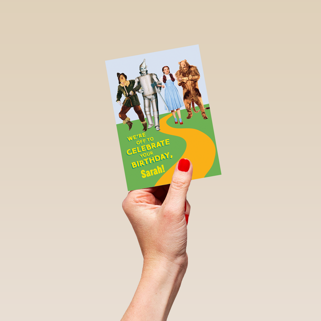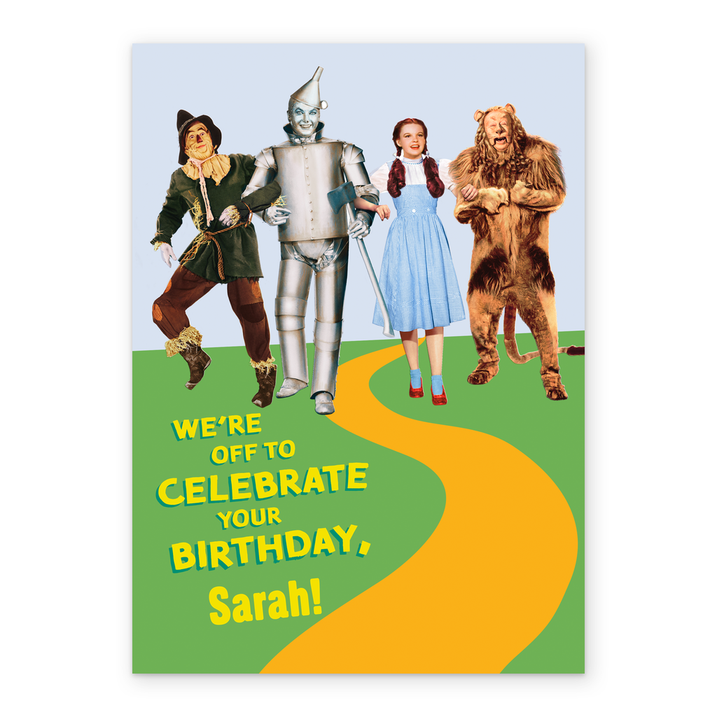 Printed on premium-quality board, this card features Judy Garland's Dorothy Gale with the Scarecrow, the Tin Man and the Cowardly Lion from the 1939 Wizard of Oz movie, with the message 'We're off to celebrate your birthday', space to personalise a name, and comes complete with a co-ordinating white envelope.