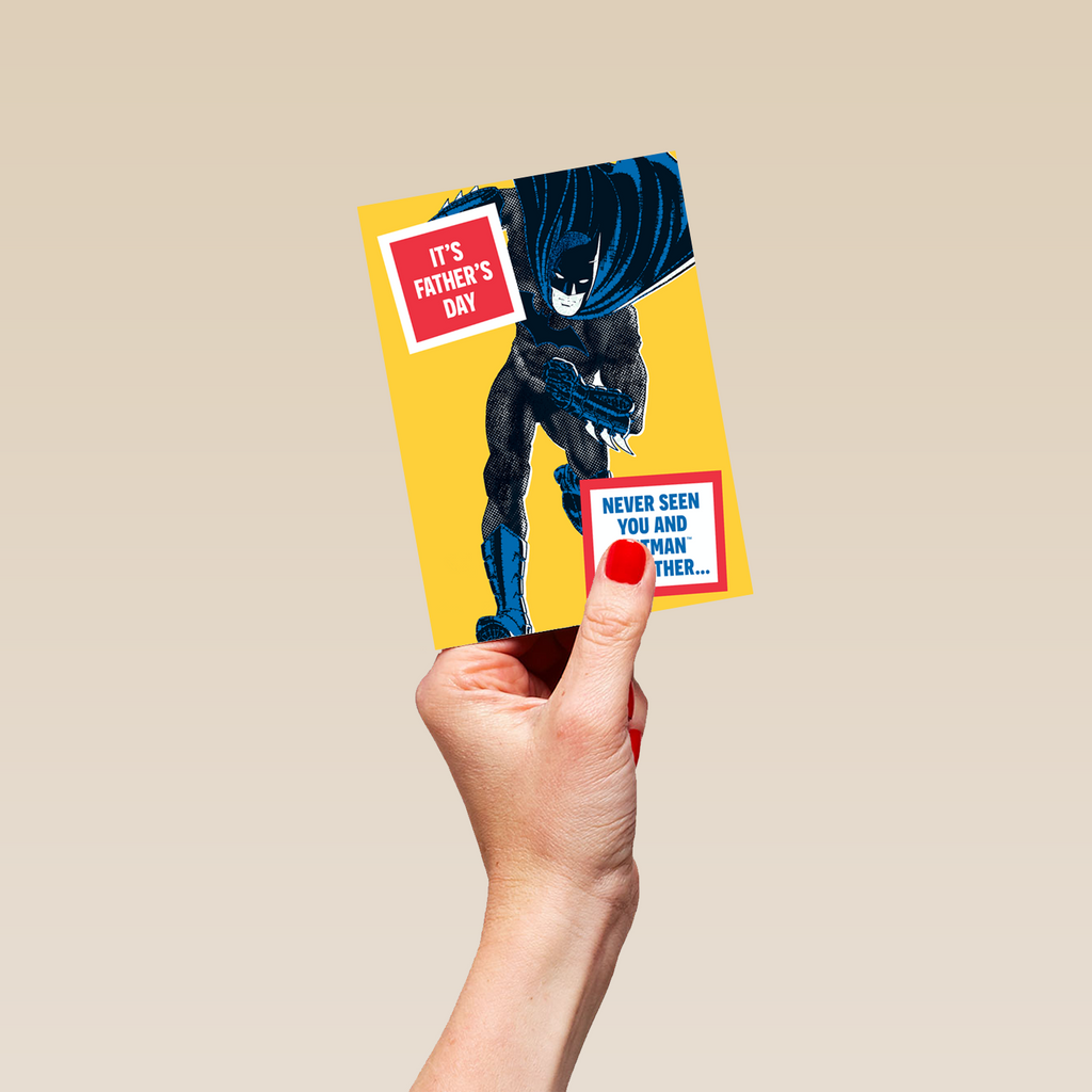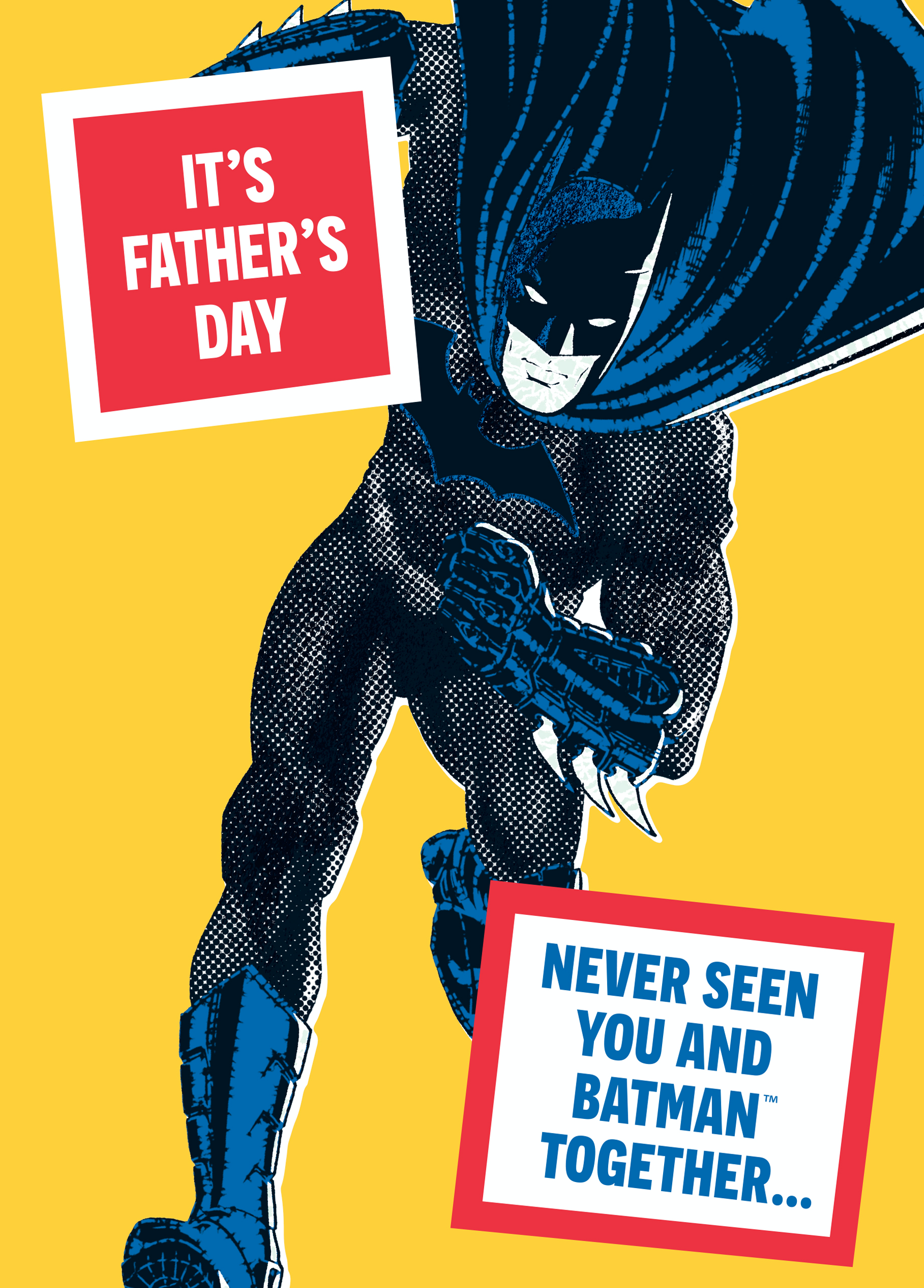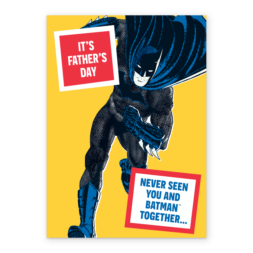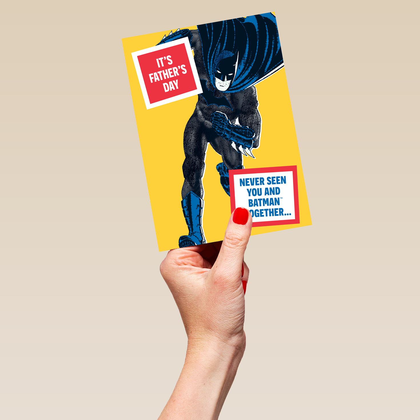 Show them you care with a personalised Batman father's day card from Hallmark. Our Father's Day cards are printed on premium quality, FSC®-certified card & delivered nationwide.This card is available as standard 12cm by 16.7cm and large 15.5cm by 21.6cm.