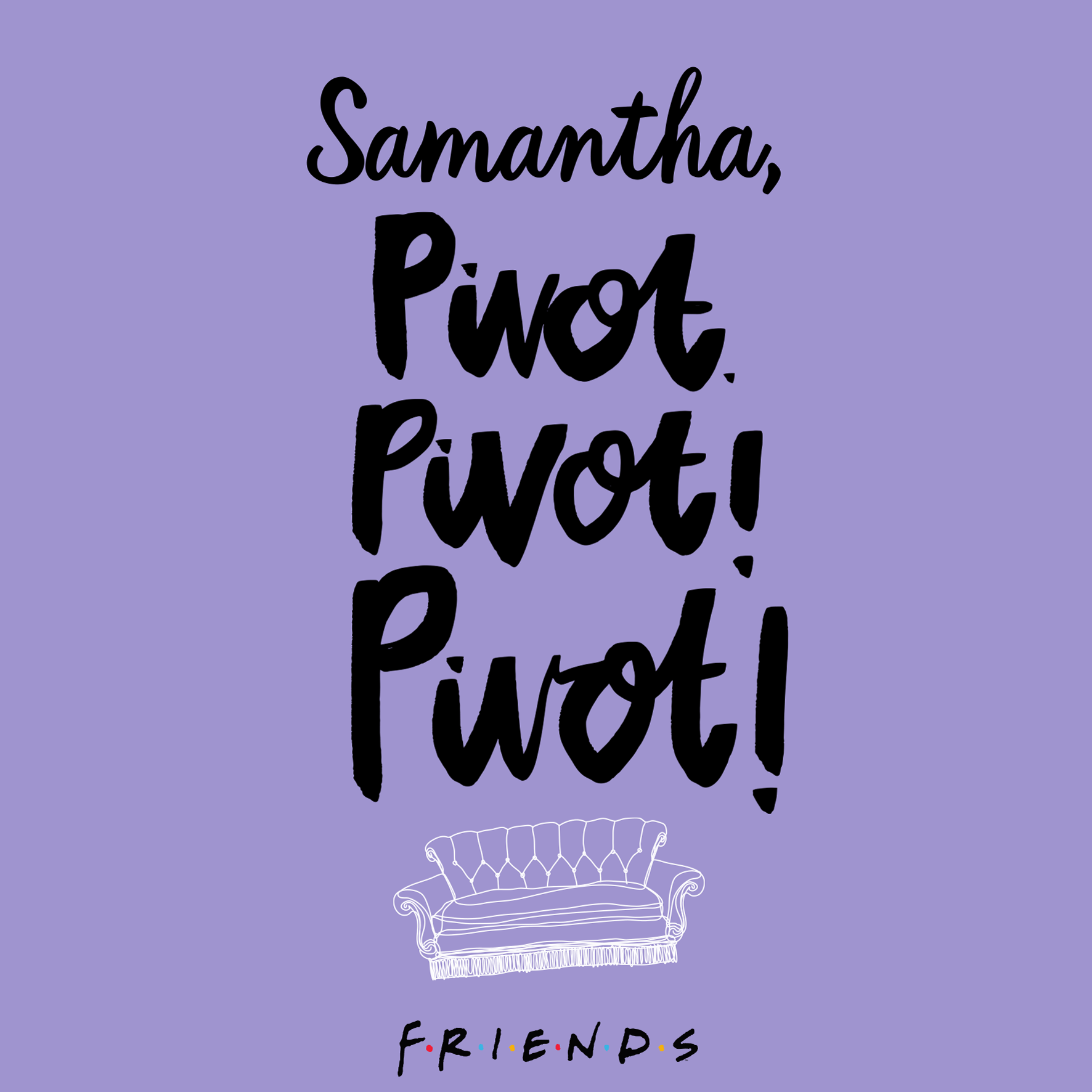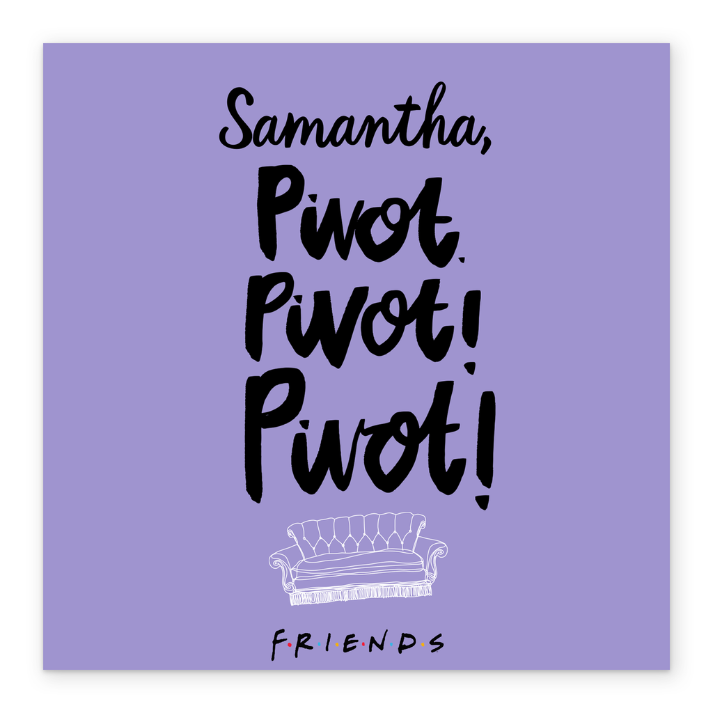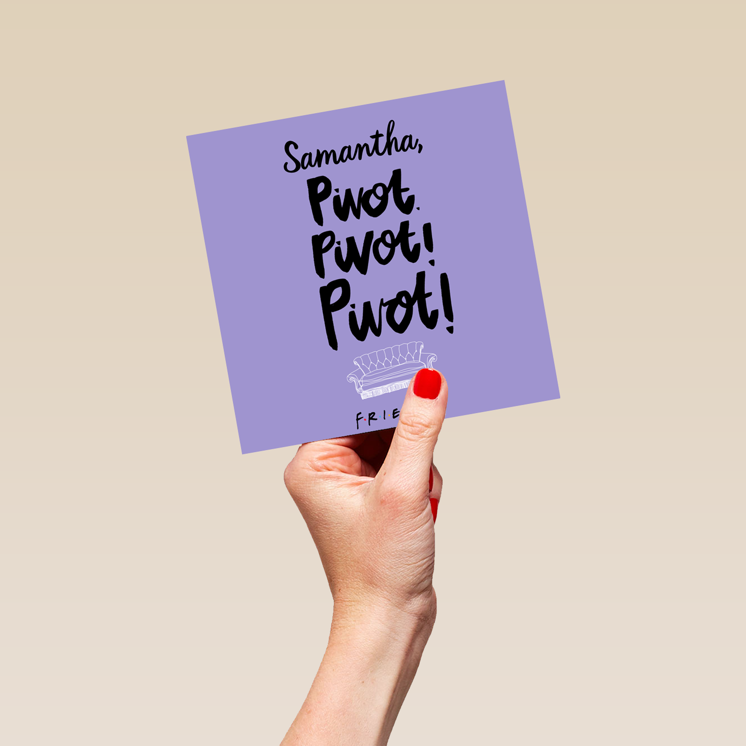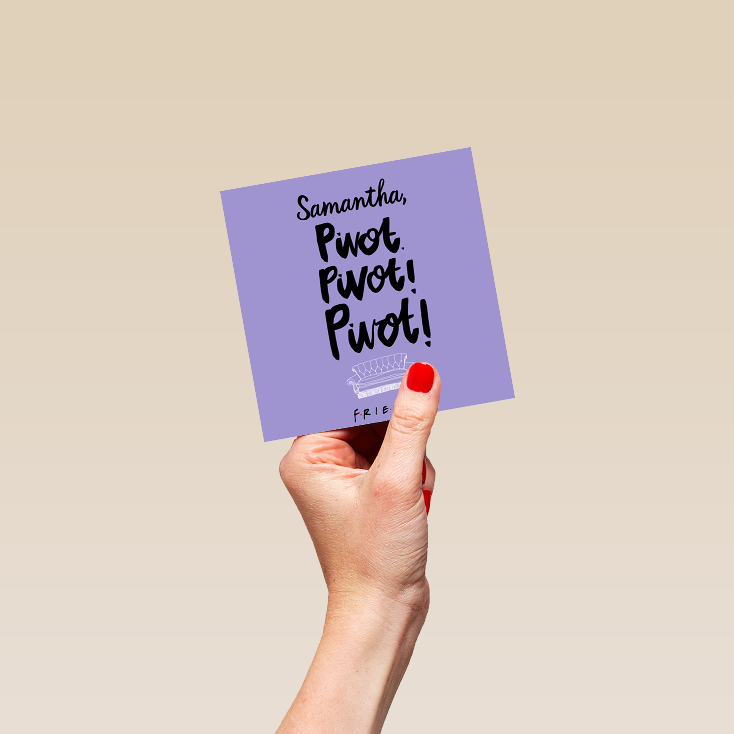 Printed on premium-quality board, this card features a couch illustration and the FRIENDS logo, with the message 'Pivot. Pivot! Pivot!', space to personalise a name, and comes complete with a co-ordinating white envelope.