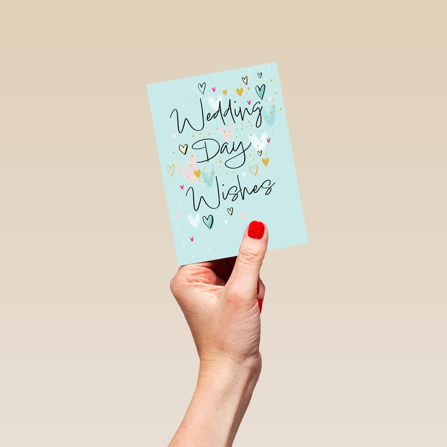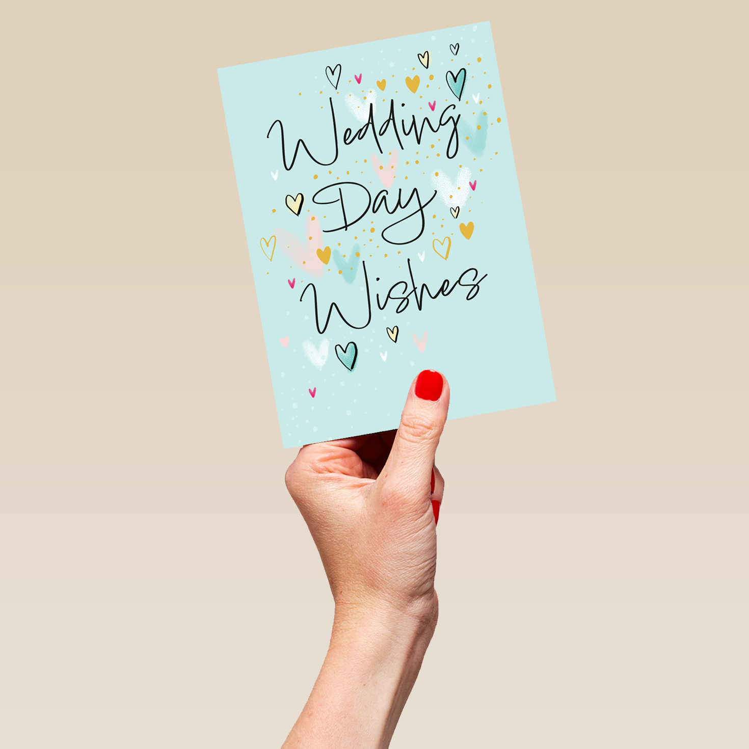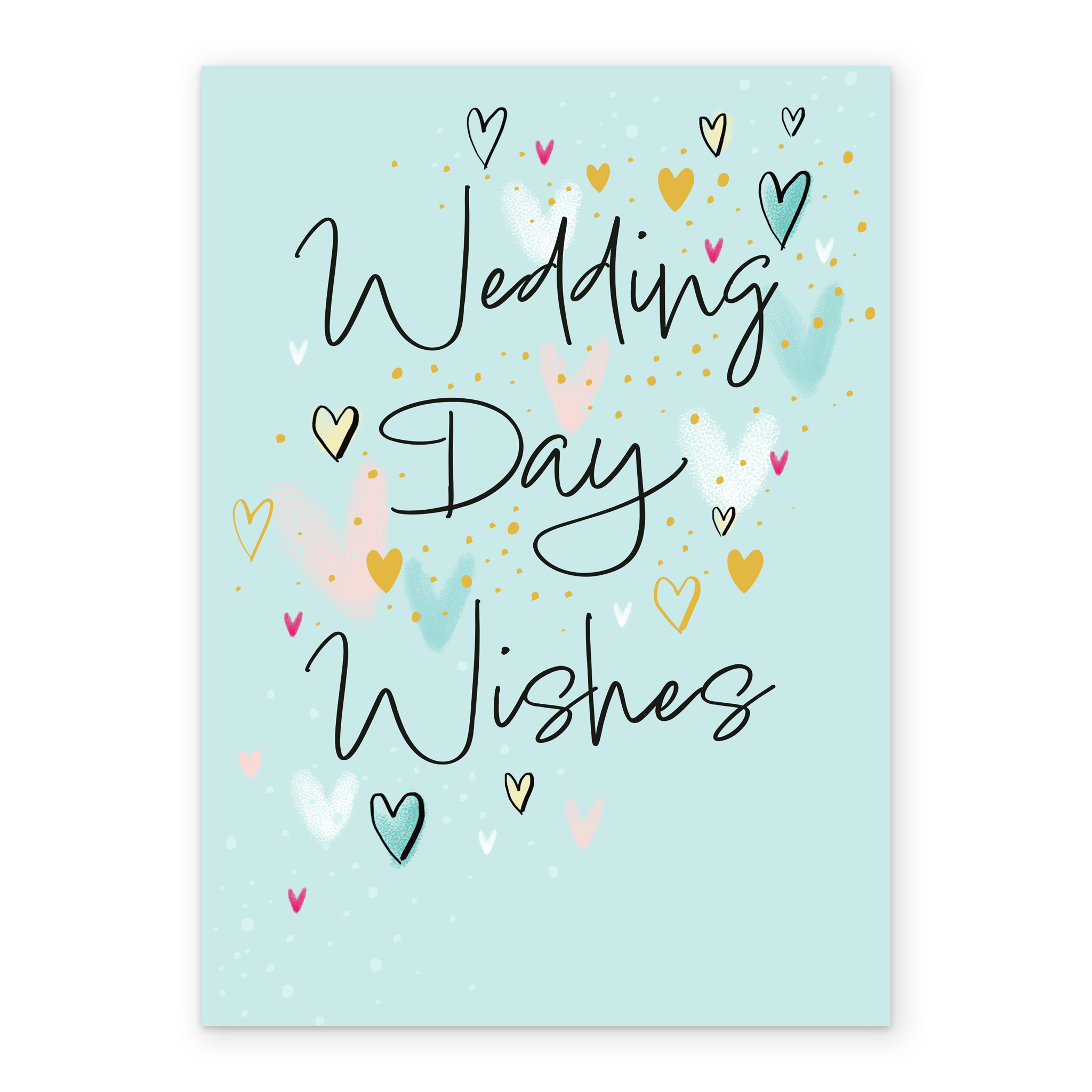 Printed on premium-quality board, this card features a blue background with hearts and gold coloured specks, with the message 'Wedding Day Wishes', and comes complete with a co-ordinating white envelope.