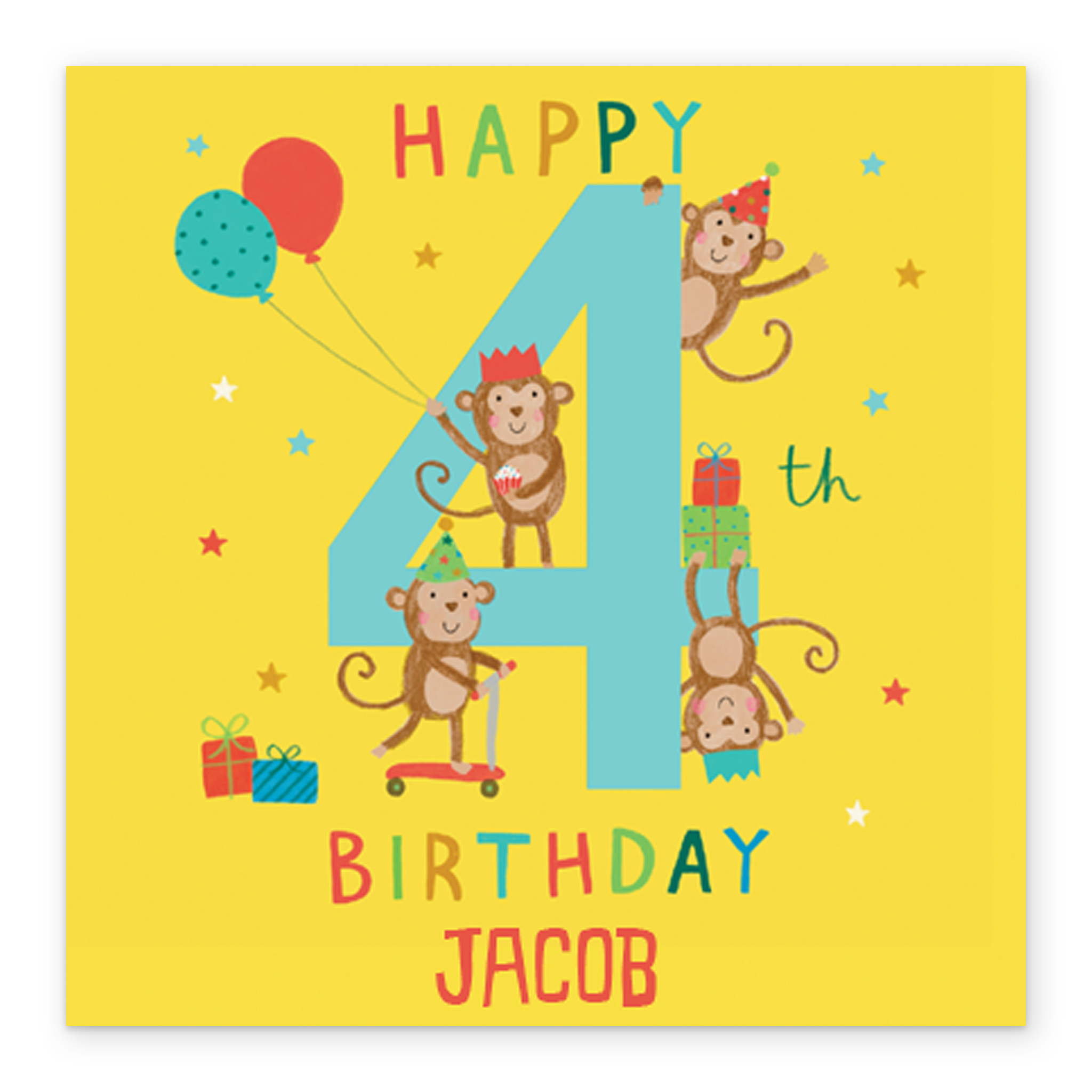 Show them you care with a personalised cheeky monkeys party 4th birthday card from Hallmark. Our greetings cards are printed on premium quality, FSC®-certified card & delivered nationwide.