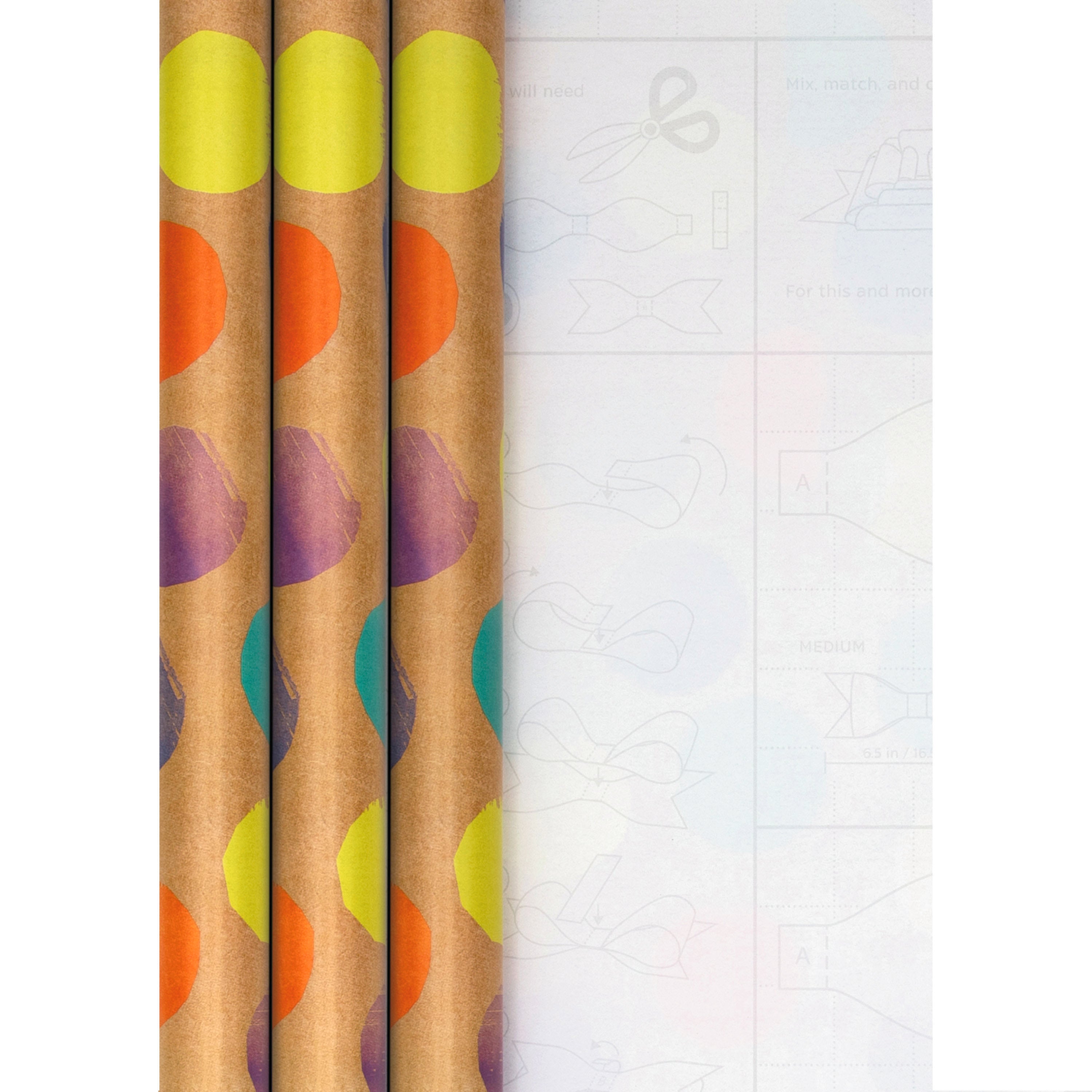 6M Any Occasion Wrapping Paper - 3 x 2M Rolls in 1 Colourful Spots & Kraft Paper Design