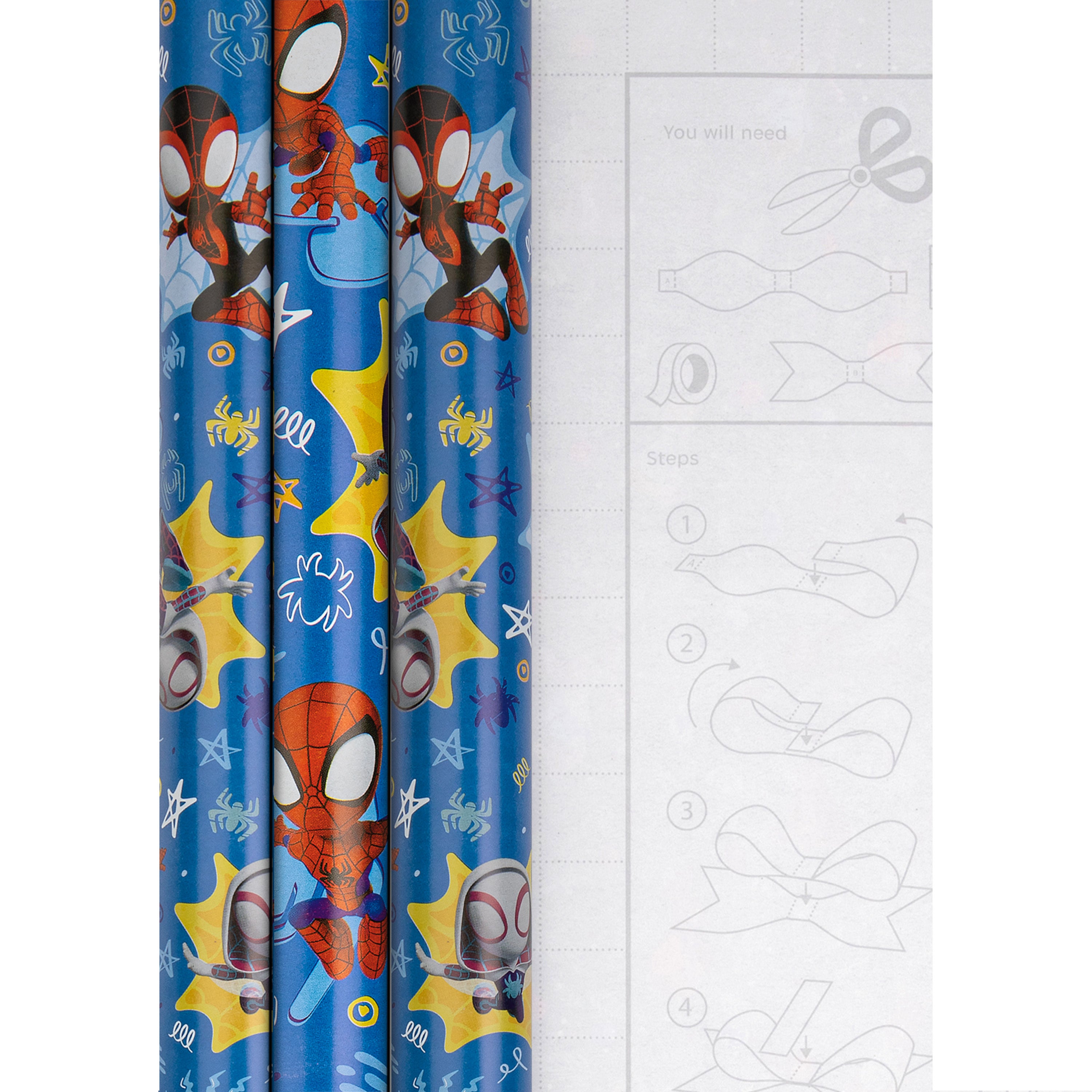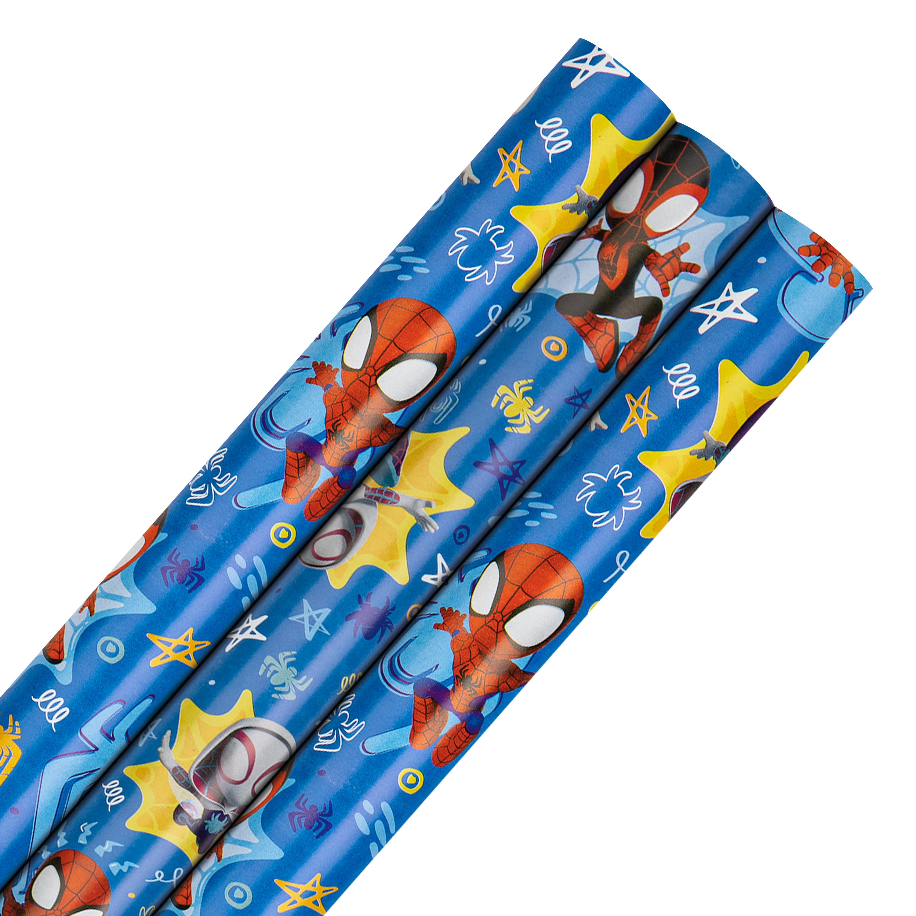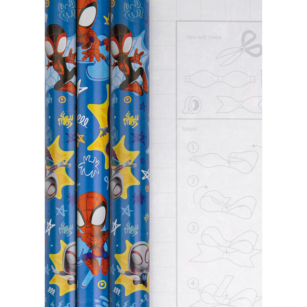 This pack features 3 rolls of wrapping paper in 1 MARVEL Spidey and His Amazing Friends design. Each roll wrap features a blue background with Peter Parker's Spider, Gwen Stacy's Ghost Spider and Mile Morales's Spin.