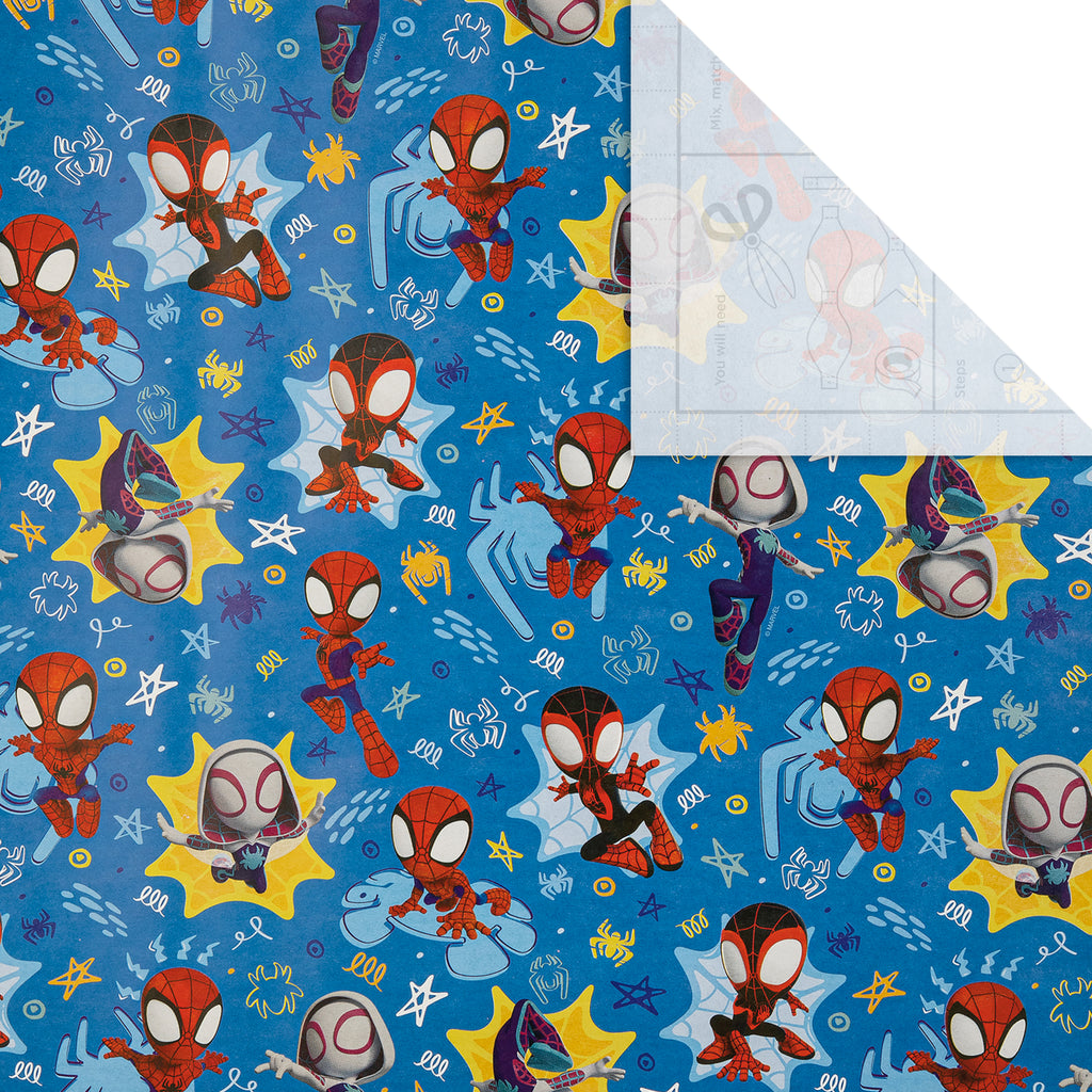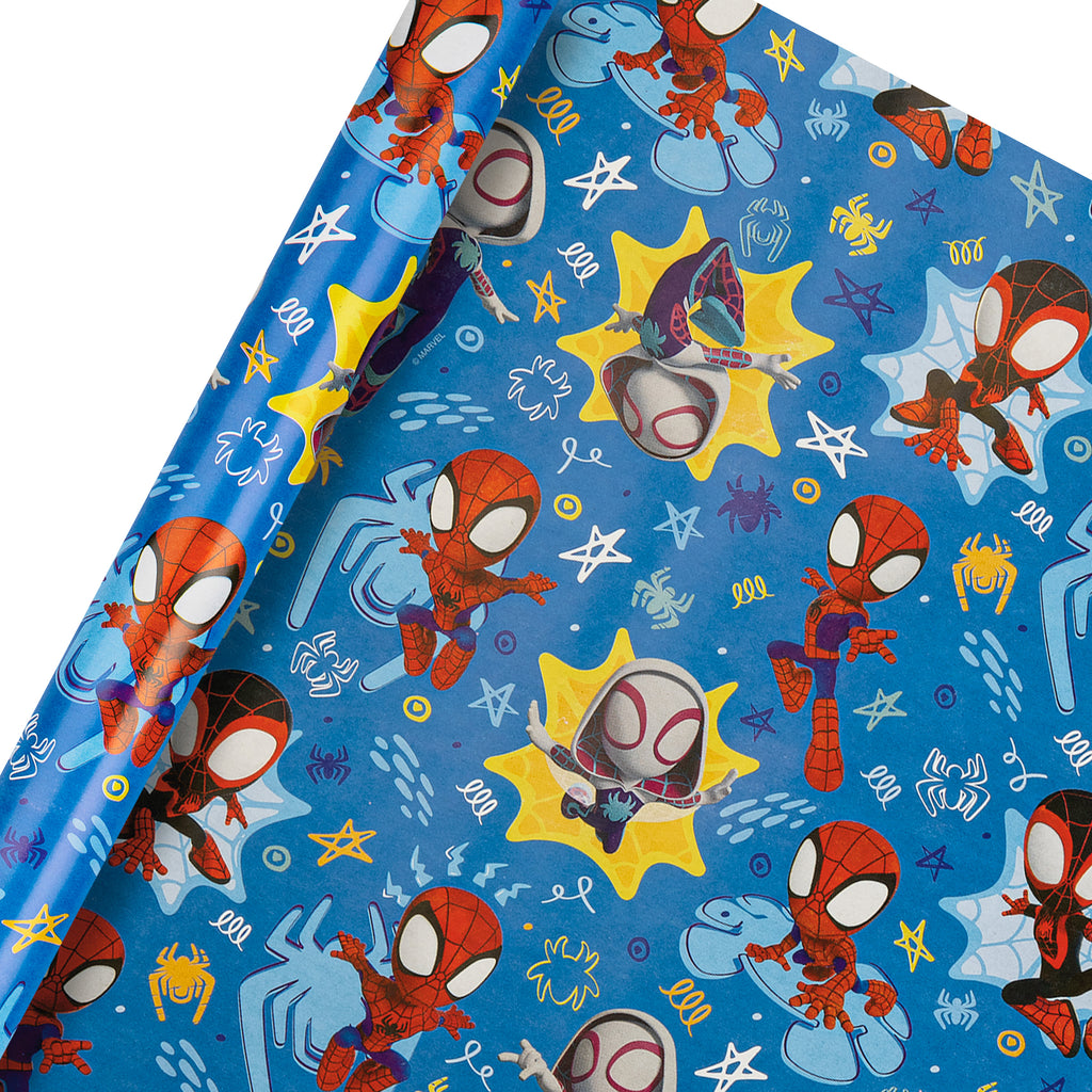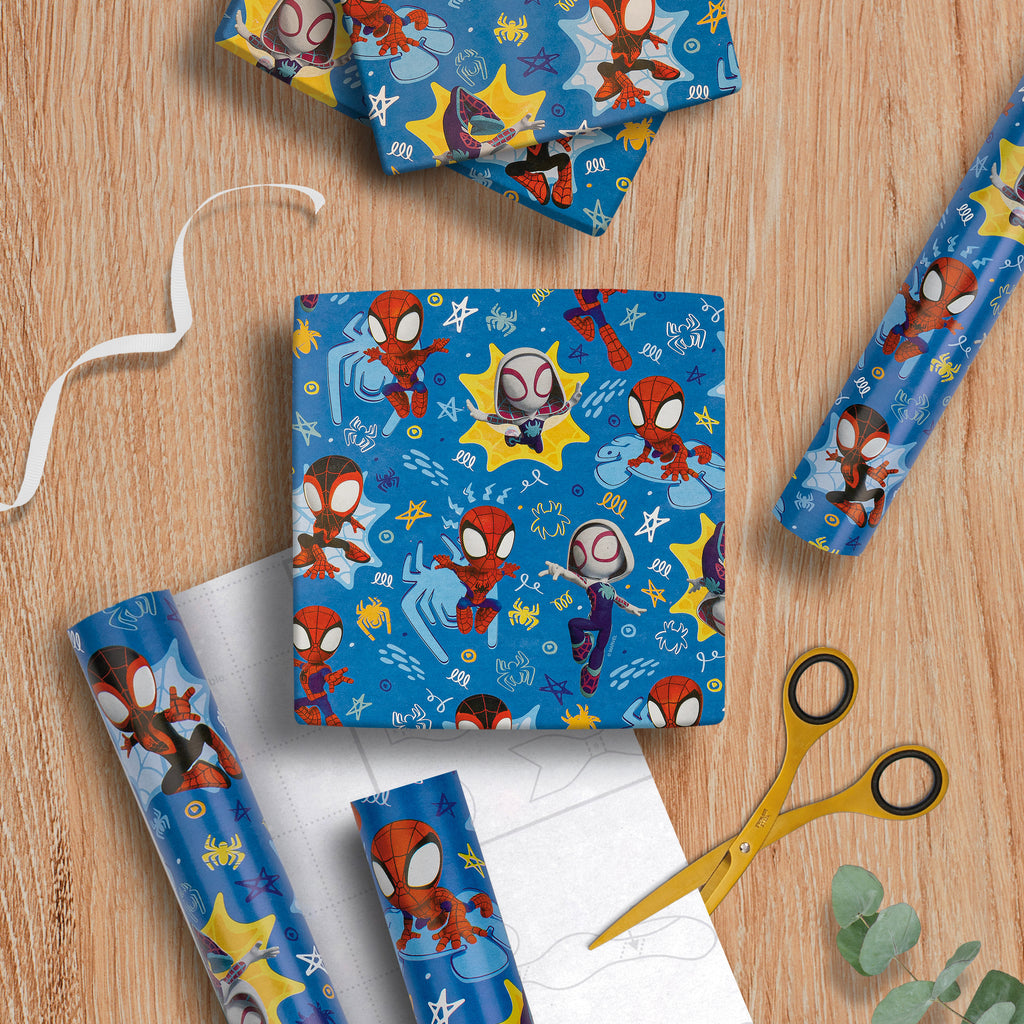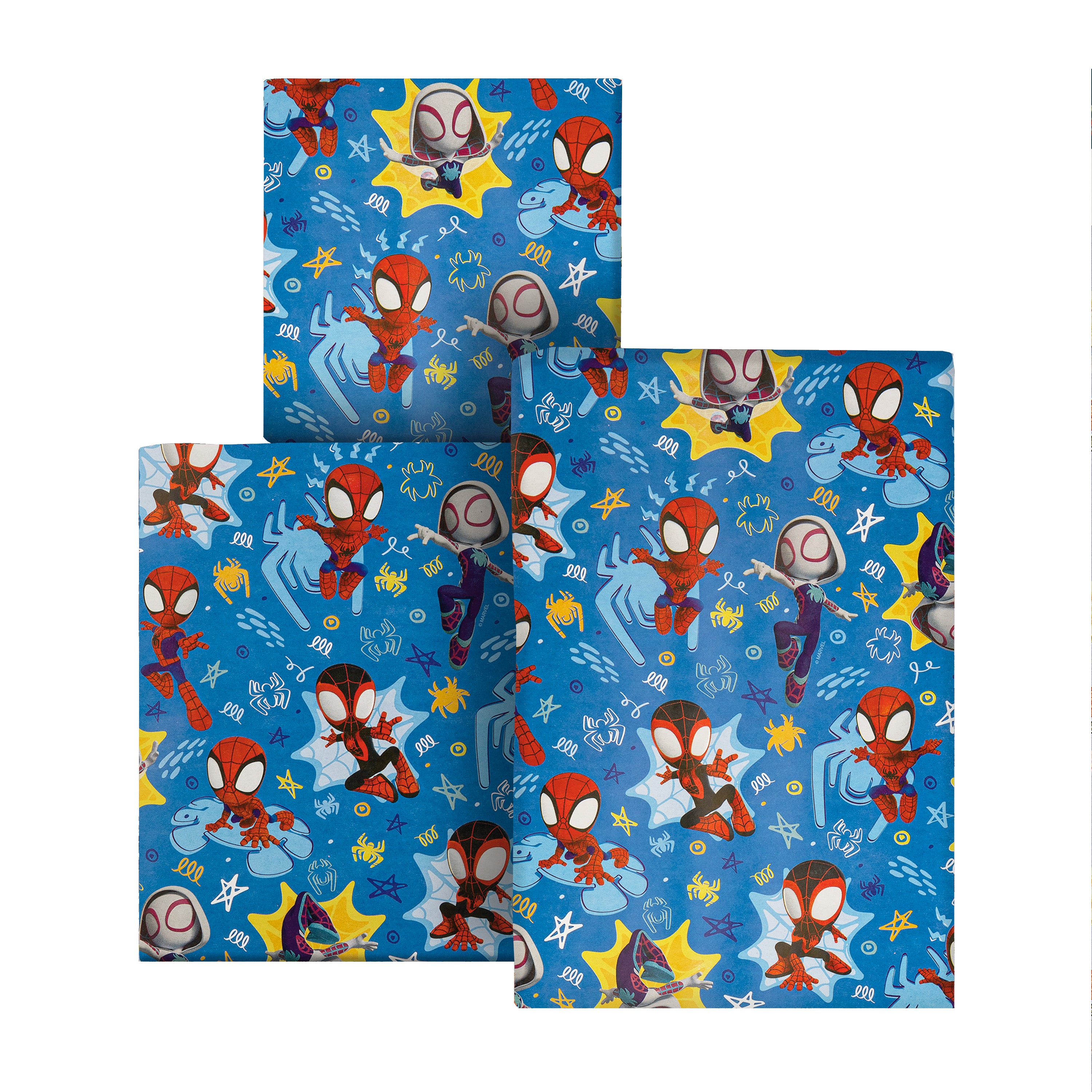 This pack features 3 rolls of wrapping paper in 1 MARVEL Spidey and His Amazing Friends design. Each roll wrap features a blue background with Peter Parker's Spider, Gwen Stacy's Ghost Spider and Mile Morales's Spin.