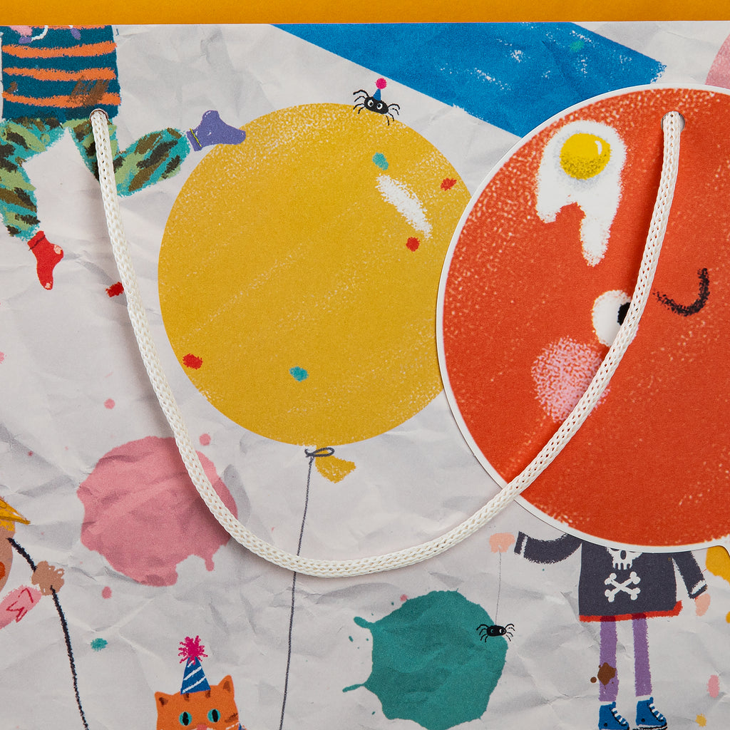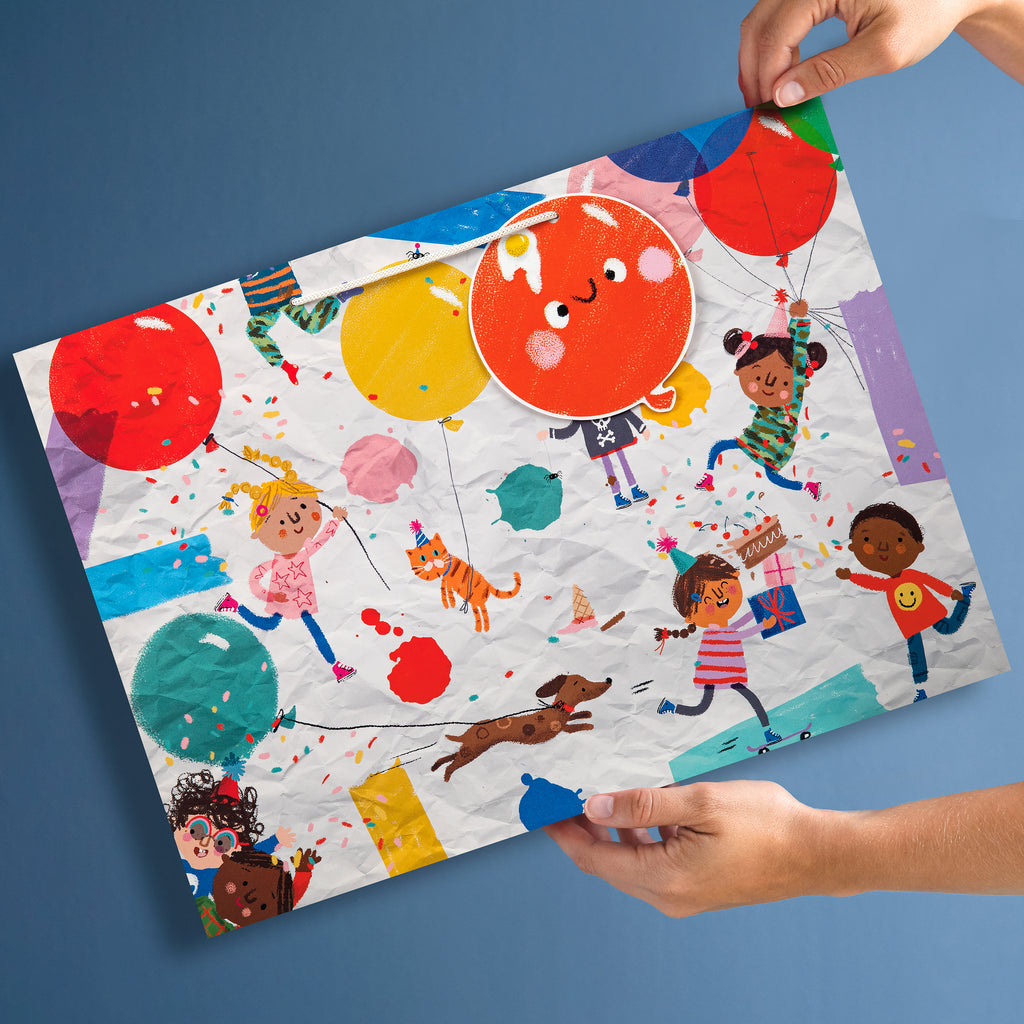 This Extra Large Gift Bag features a fun Custard Crew design with children playing on the front and back, and stripes down the side panels, and comes complete with a die-cut balloon shaped gift tag.