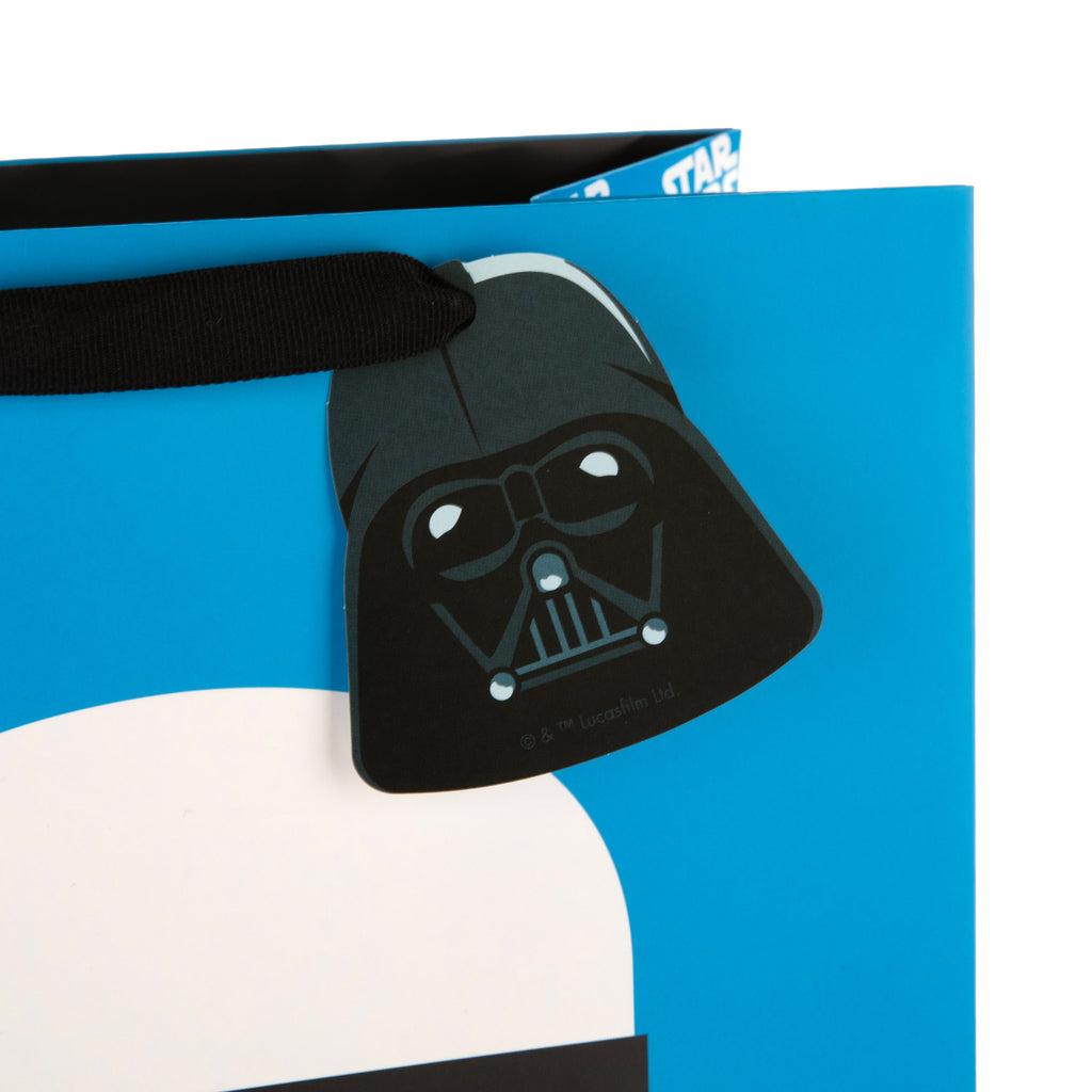 This bag features a bright blue background with a Stormtrooper head on the front, Darth Vader's head on the back, the Star Wars™ logo on the sides, a Darth Vader head gift tag, and dark ribbon handles.