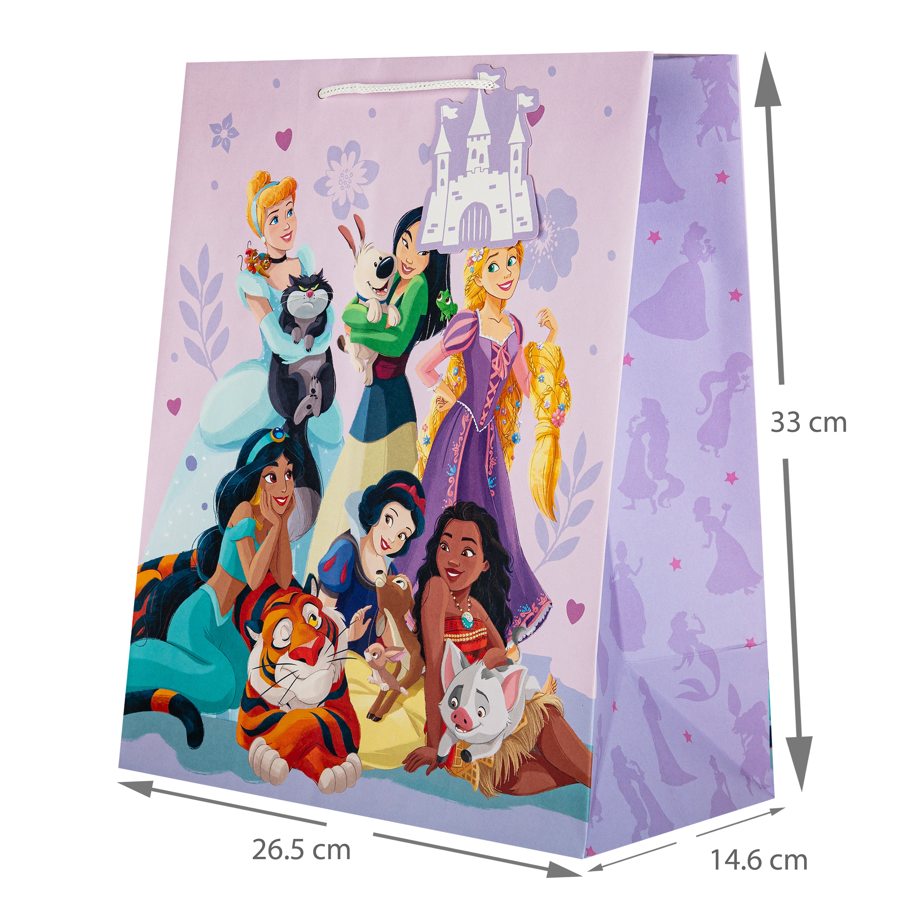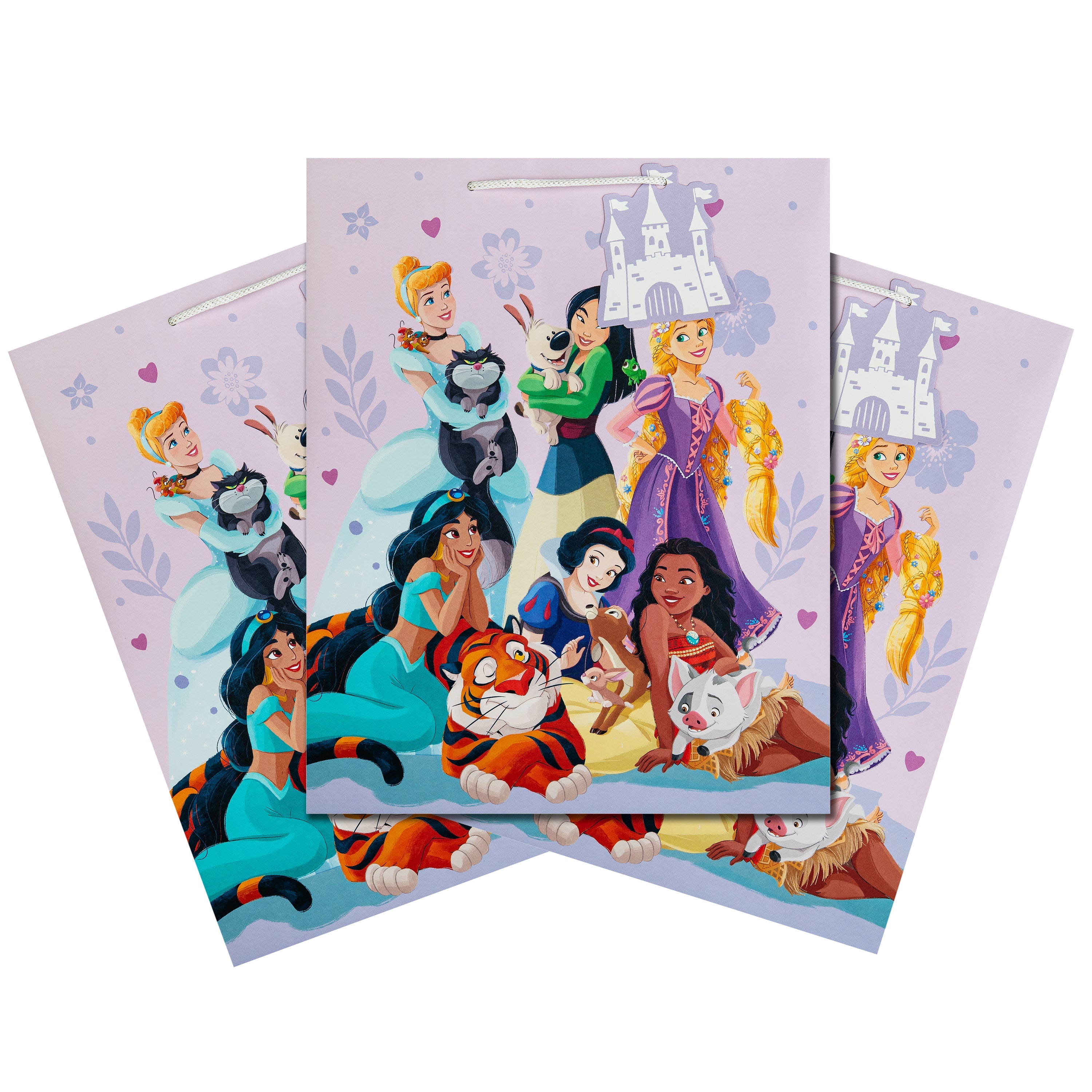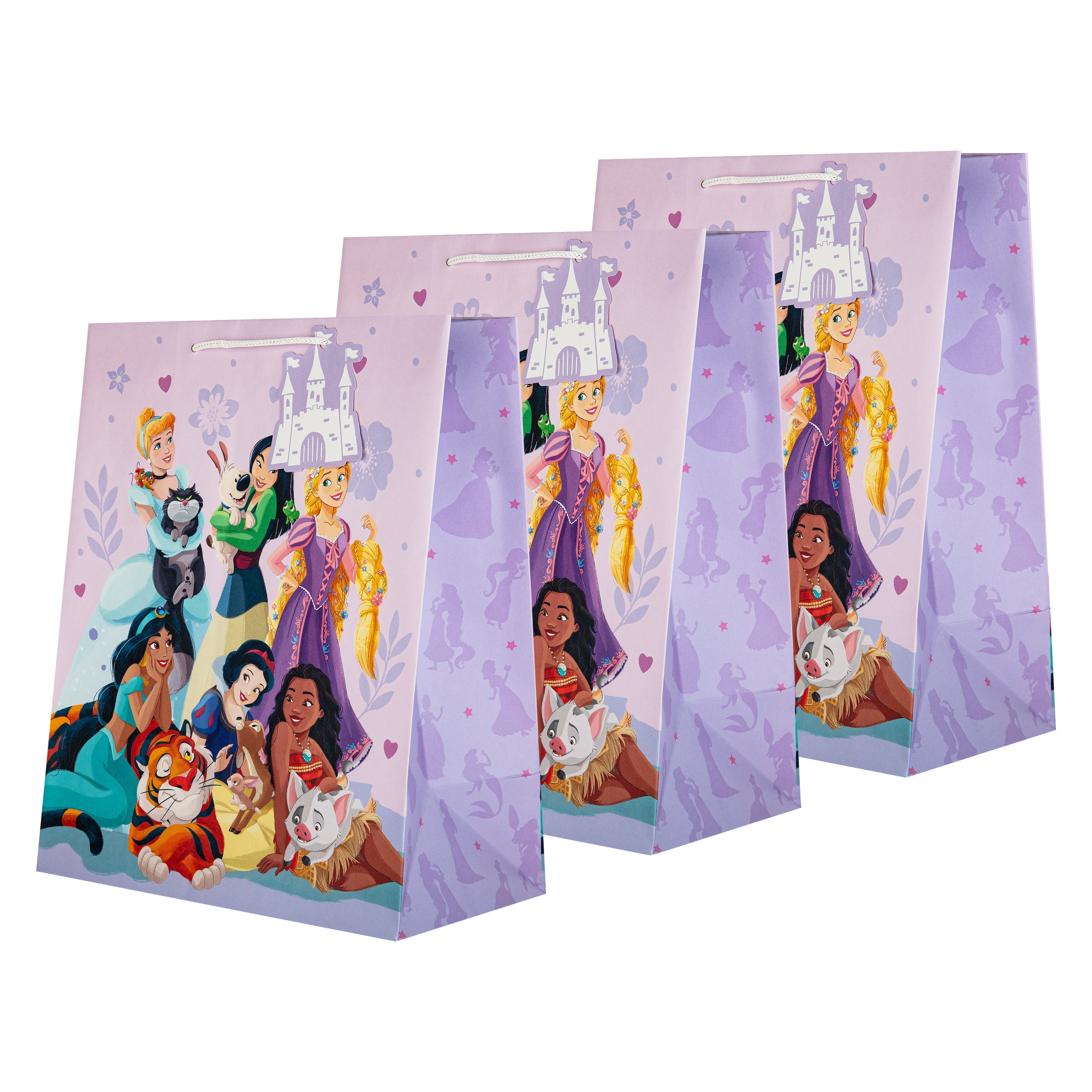 This pack of 3 Large Gift Bags feature 1 Disney Princess design, with the Princesses and their pets, including Cinderella and Lucifer, Mulan and Little Brother, Rapunzel and Pascal, Jasmine and Rajah, Moana and Pua, and Snow White with a woodland deer and rabbit. Each bag features white knitted paper handles, Disney Princess silhouettes on the side panels and a die-cut Castle shaped gift tag.
