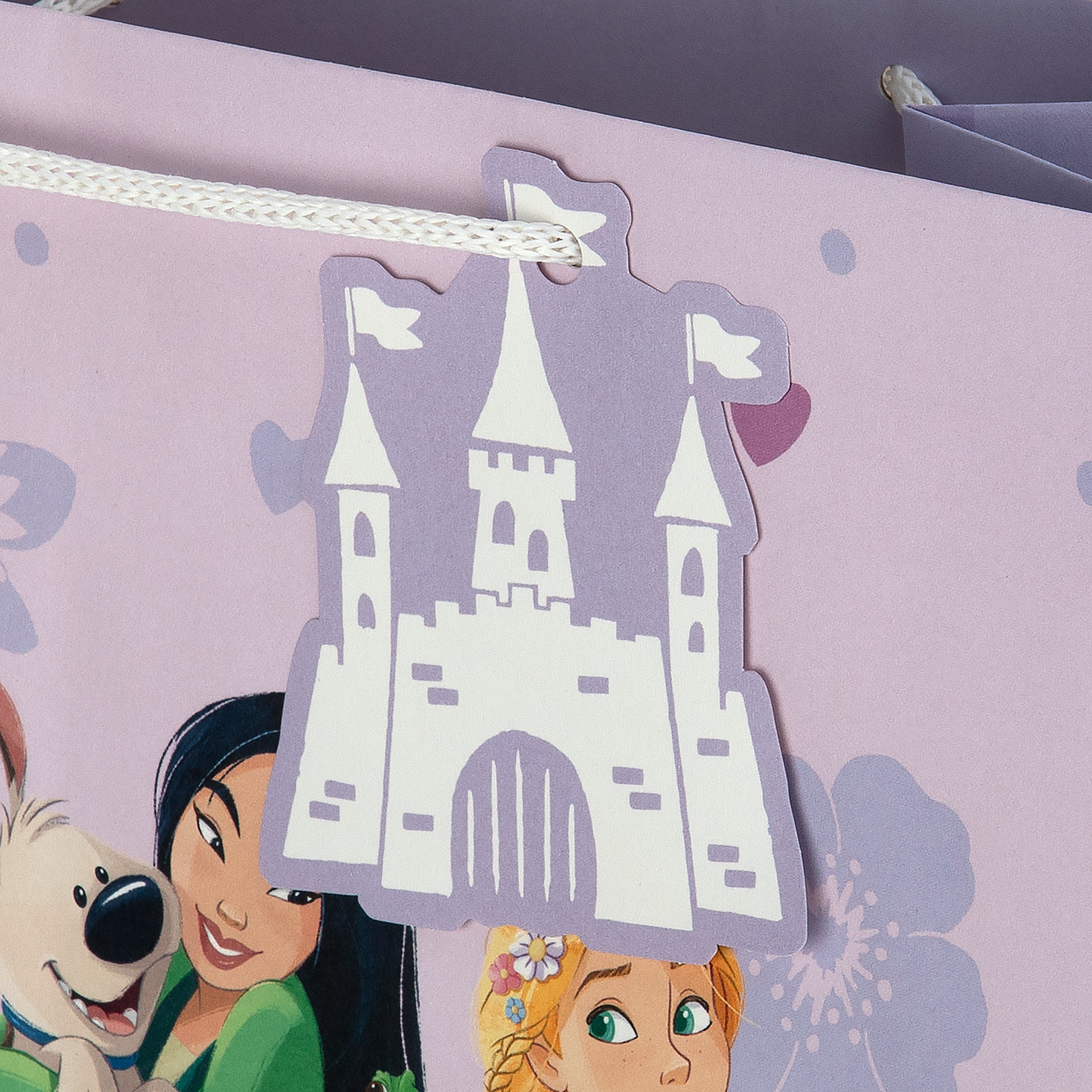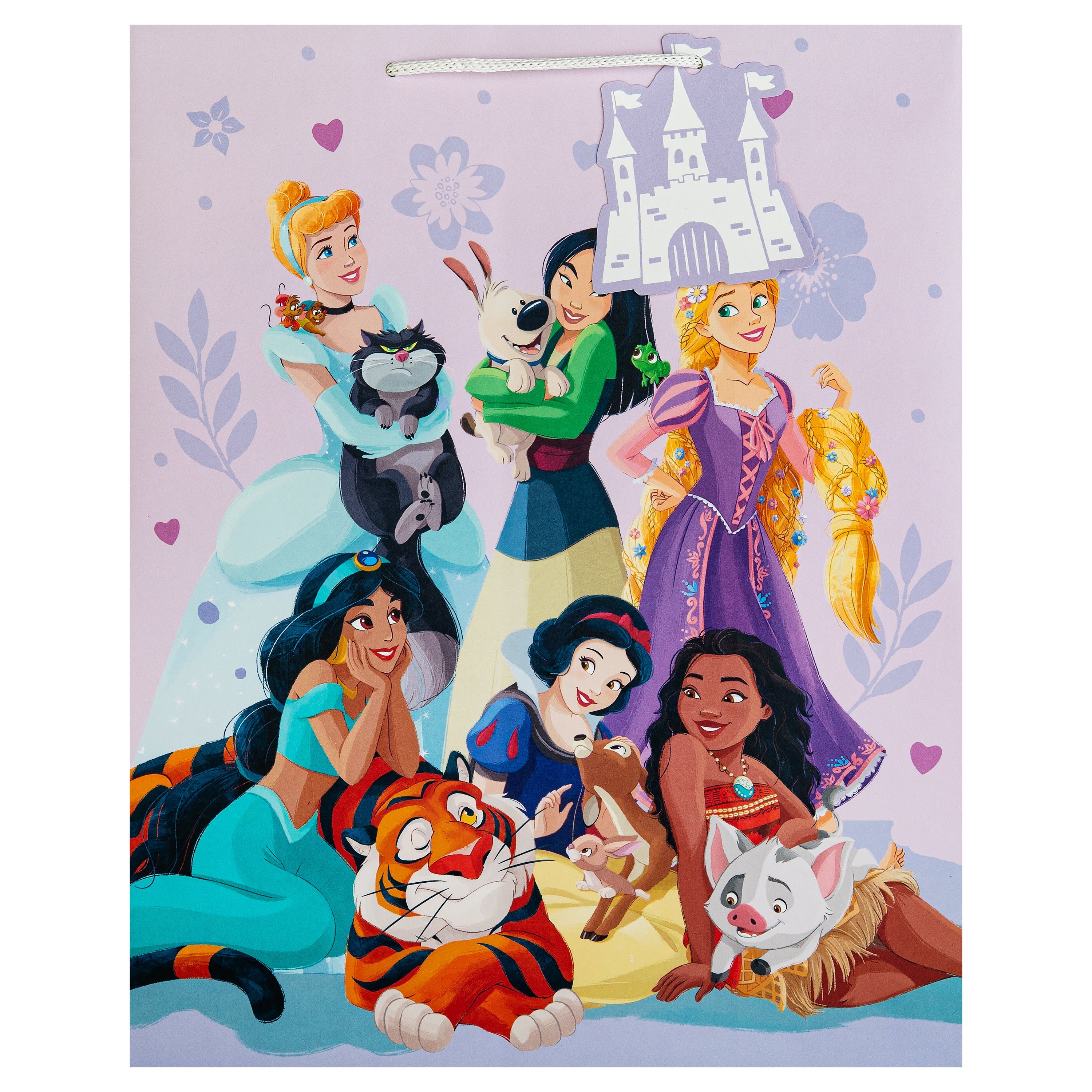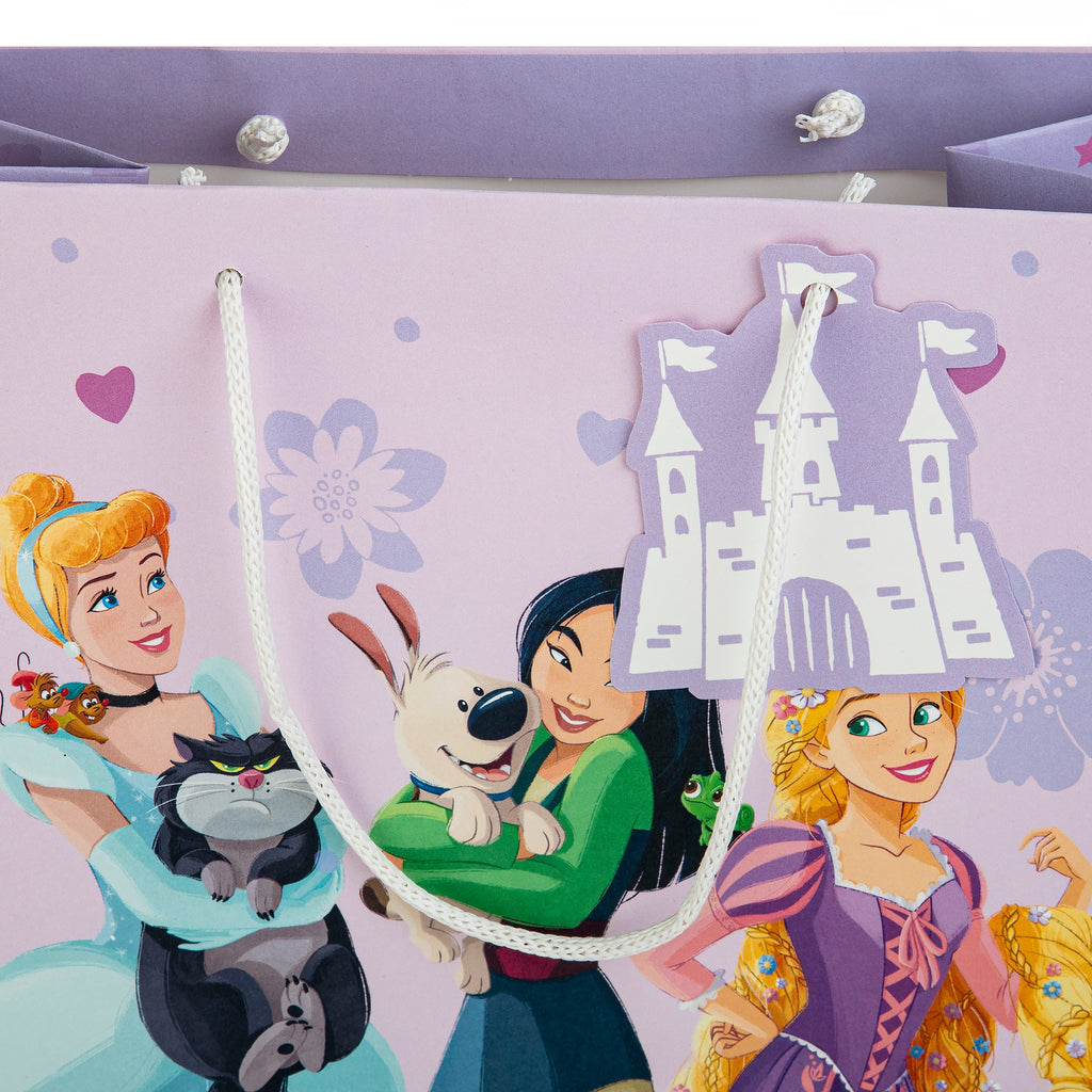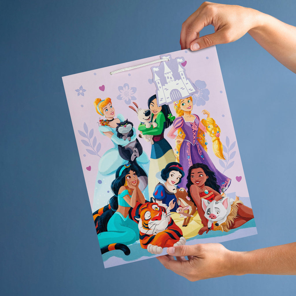 This pack of 3 Large Gift Bags feature 1 Disney Princess design, with the Princesses and their pets, including Cinderella and Lucifer, Mulan and Little Brother, Rapunzel and Pascal, Jasmine and Rajah, Moana and Pua, and Snow White with a woodland deer and rabbit. Each bag features white knitted paper handles, Disney Princess silhouettes on the side panels and a die-cut Castle shaped gift tag.