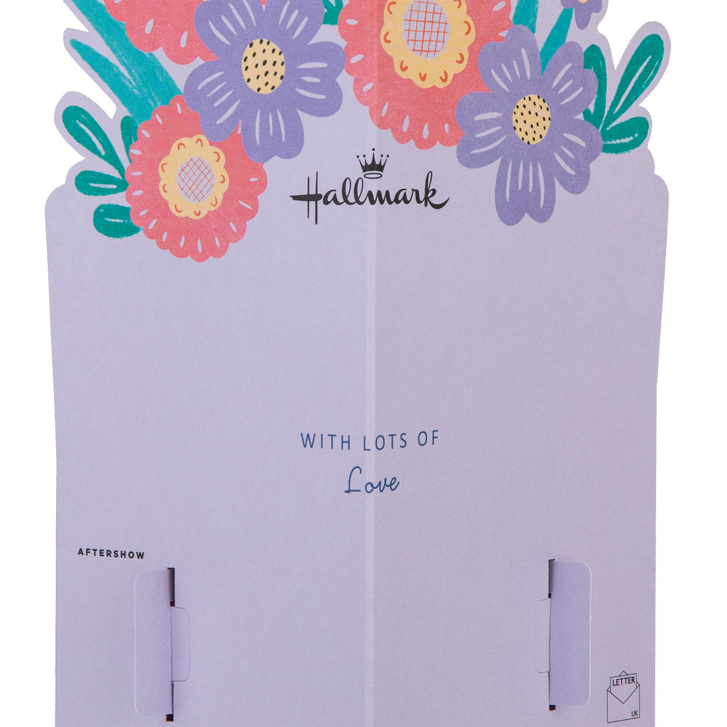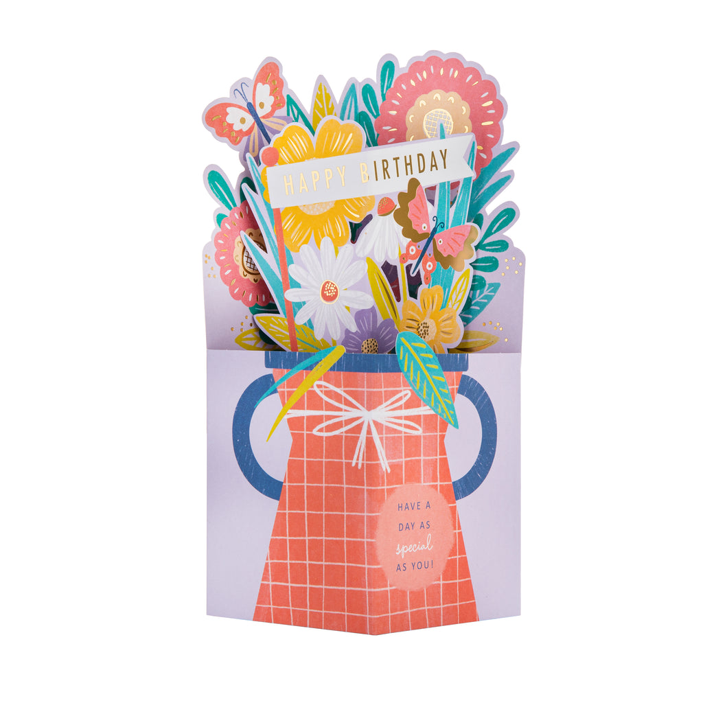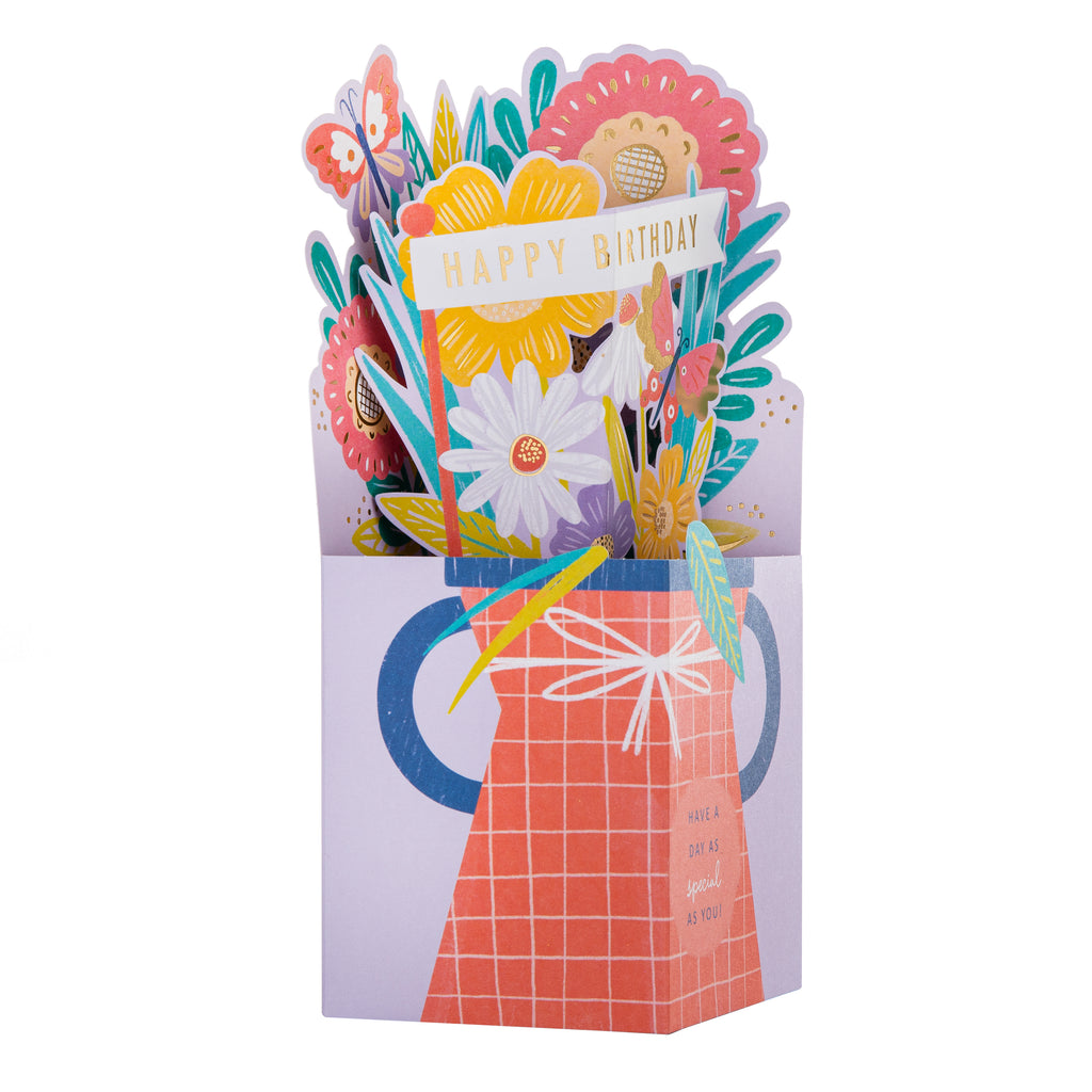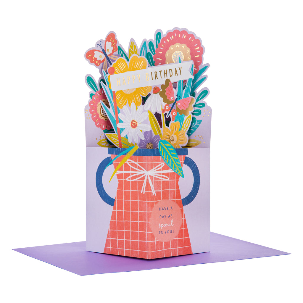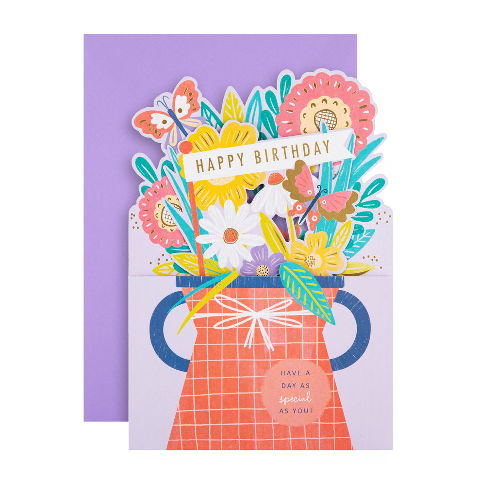 Printed on high-quality board, this card pops-up into a 3D diorama of colourful flowers in a vase design. This card features metallic gold foil details, die-cut details, the message, 'Happy birthday, have a day as special as you!' on the front and comes complete with a co-ordinating Hallmark branded, purple envelope.